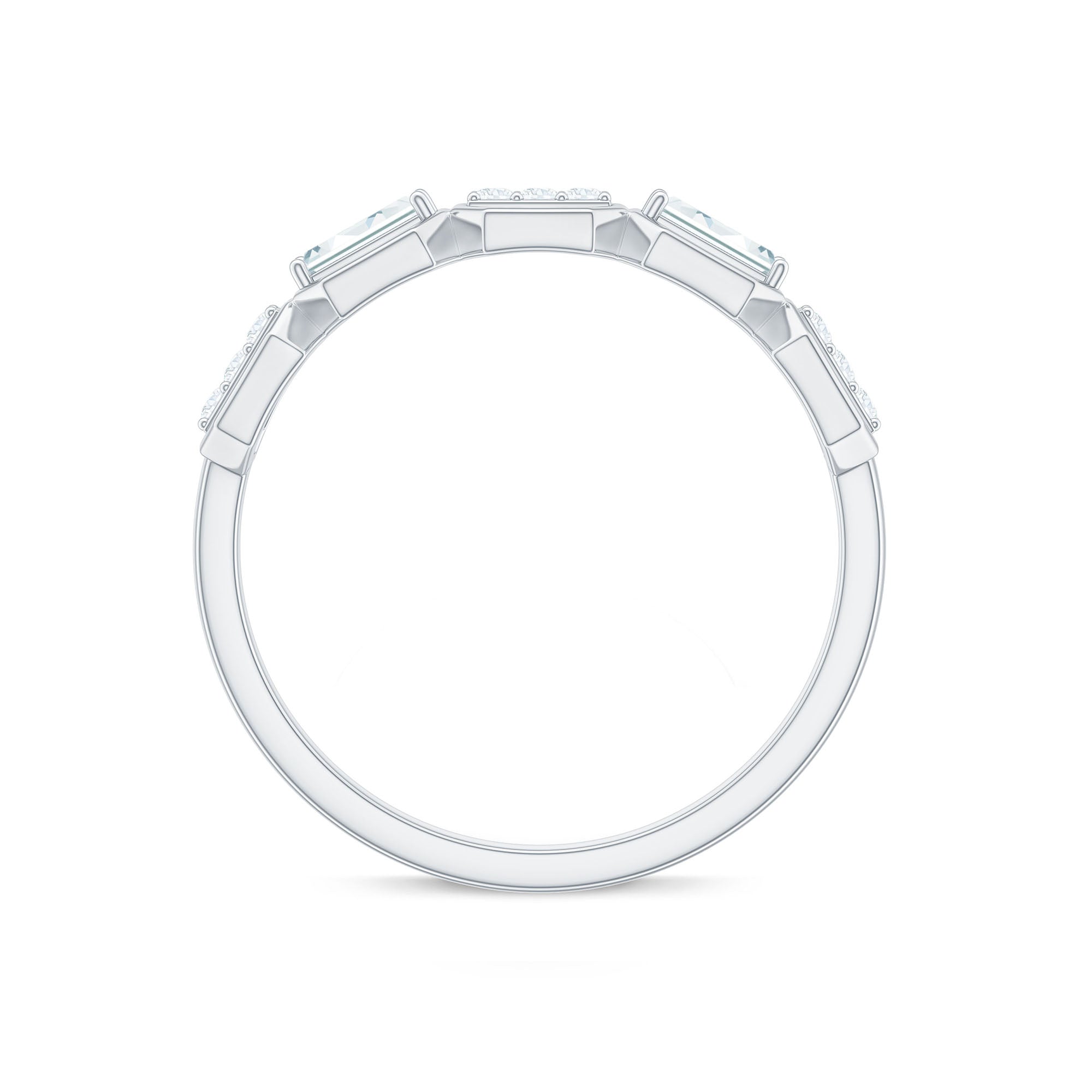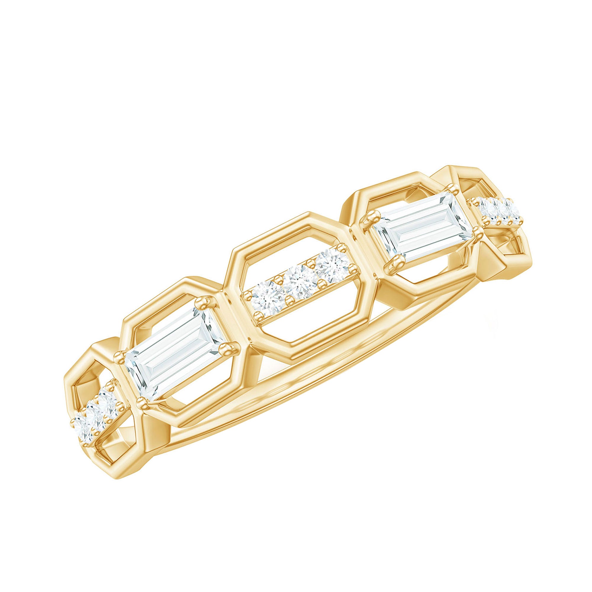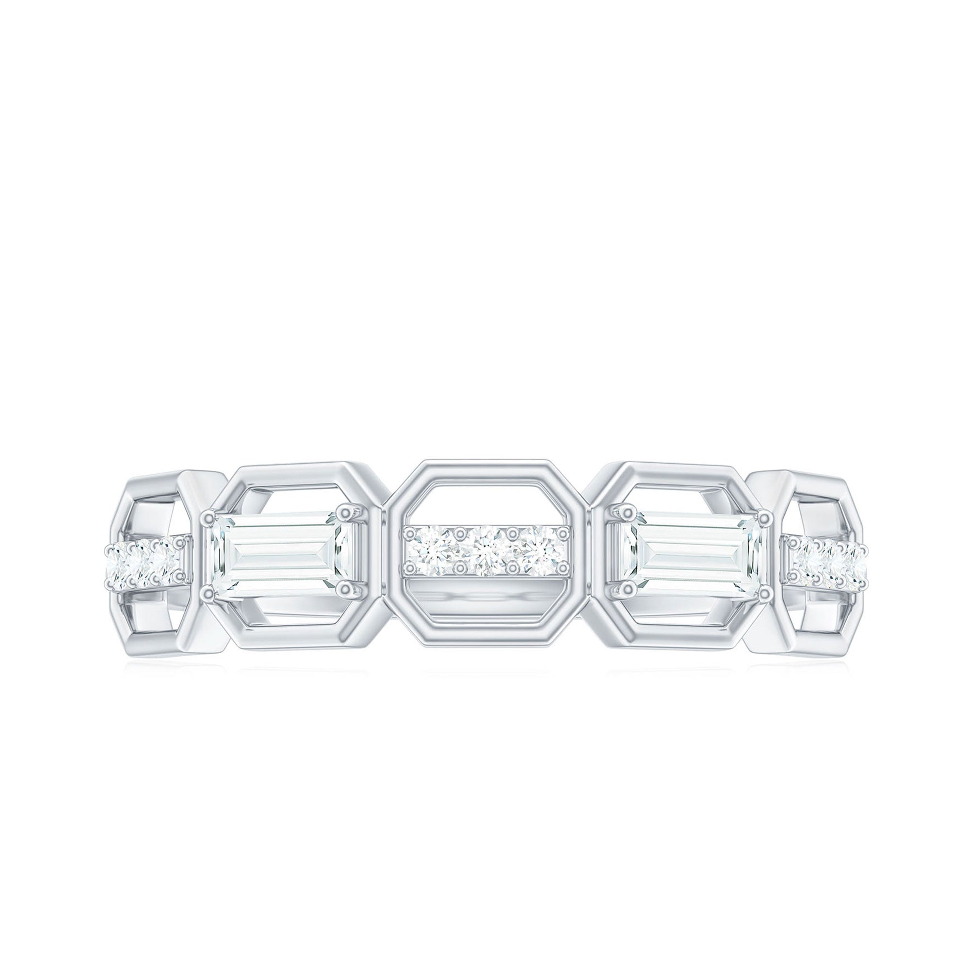 This stylish Moissanite Eternity Band brings together modern design and classic sparkle, making it a perfect choice for any woman who loves geometric designs. Featuring a row of alternating round and baguette cut moissanites, each set within bold hexagon shaped frames, this Half Eternity Band Ring creates a unique geometric pattern that catches the light beautifully from every angle. All moissanite stones are of high-quality D color and VS1 clarity, offering a brilliant, ethical alternative to diamonds. Designed for comfort and everyday wear, the Moissanite Wedding Band is slim enough to stack with other rings but bold enough to stand out on its own. Whether worn as a wedding band, anniversary gift, or stylish statement piece, it suits any occasion with ease. The Wedding Anniversary Ring comes in a full range of sizes and is delivered in an elegant jewelry box, along with a certificate of authenticity for a smooth and trustworthy shopping experience. Meticulously crafted to blend individuality with timeless charm, this moissanite band is a meaningful and versatile addition to any jewelry collection.