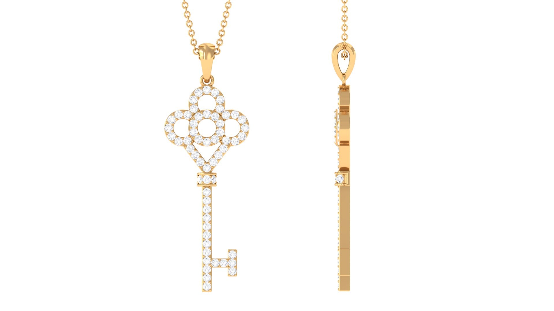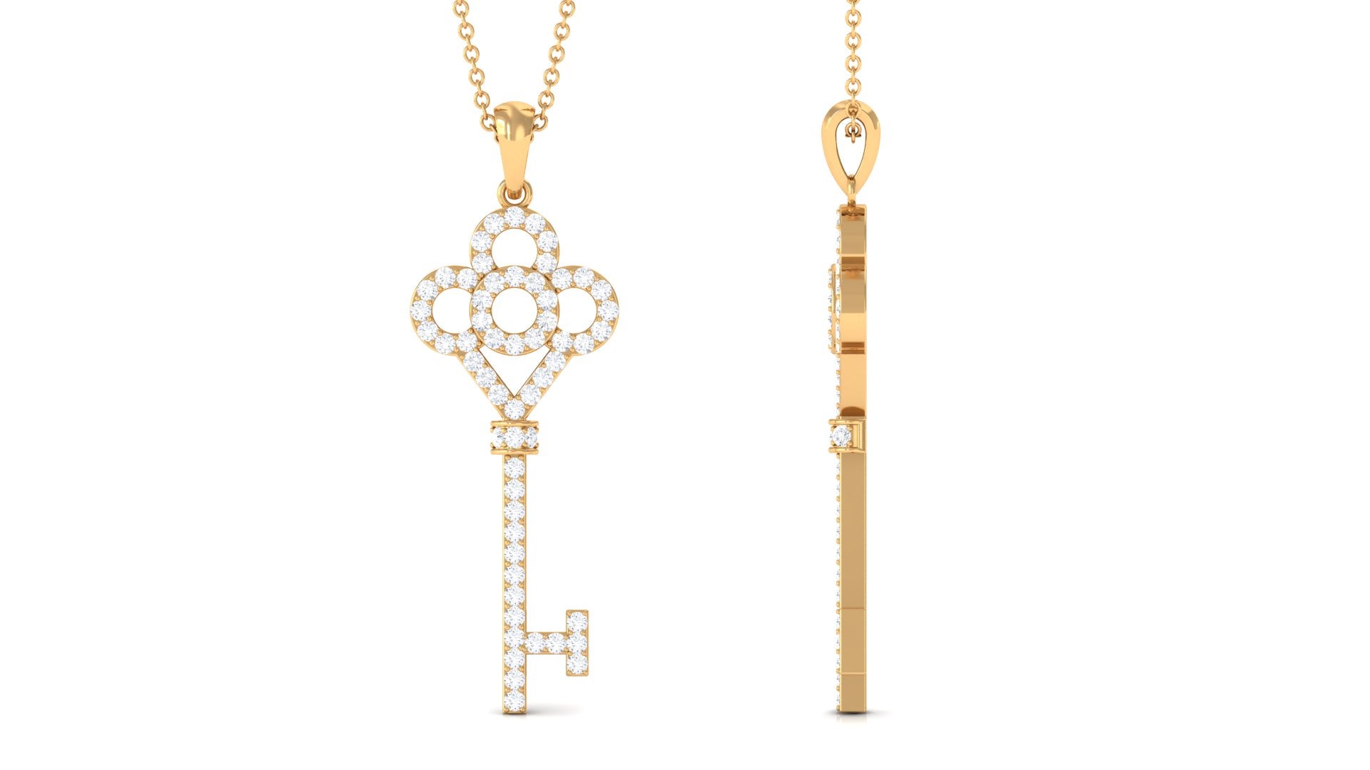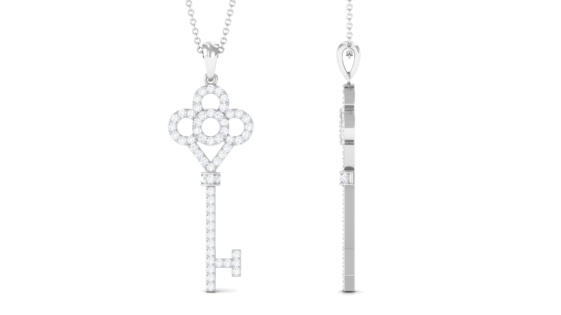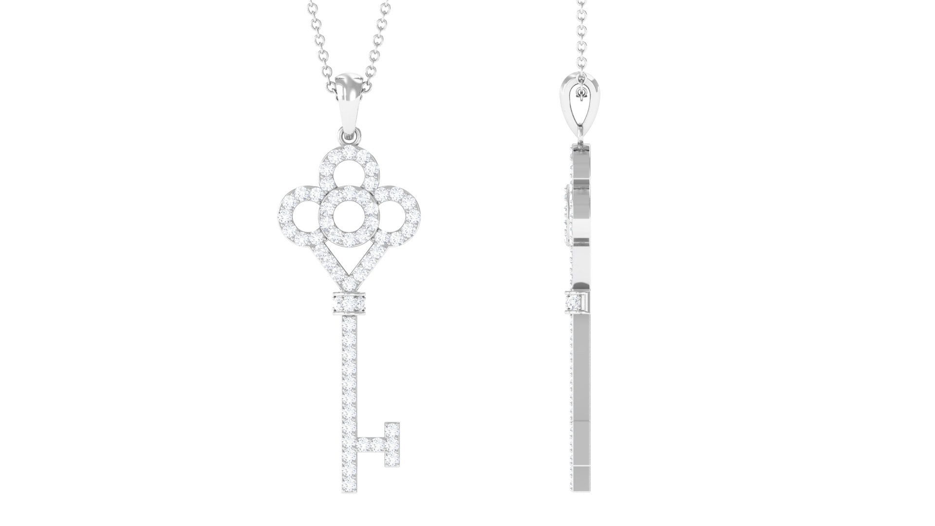 Beautifully illustrating the simplicity of Moissanite Pendant this jewelry will always be close to her heart. Unlock her heart with this Key Pendant Necklace featuring round shape moissanite securely in Prong Setting. This Pendant for Women can be layered with other necklaces to beautify the neckline or can be worn solely to achieve a minimal look. This Key Pendant will be delivered to you in a premium quality jewelry box for the perfect storage. This pendant beholds the classic shine of D-VS1 quality Moissanite embedded in the pendant. Get her this pendant to celebrate love with your special day.