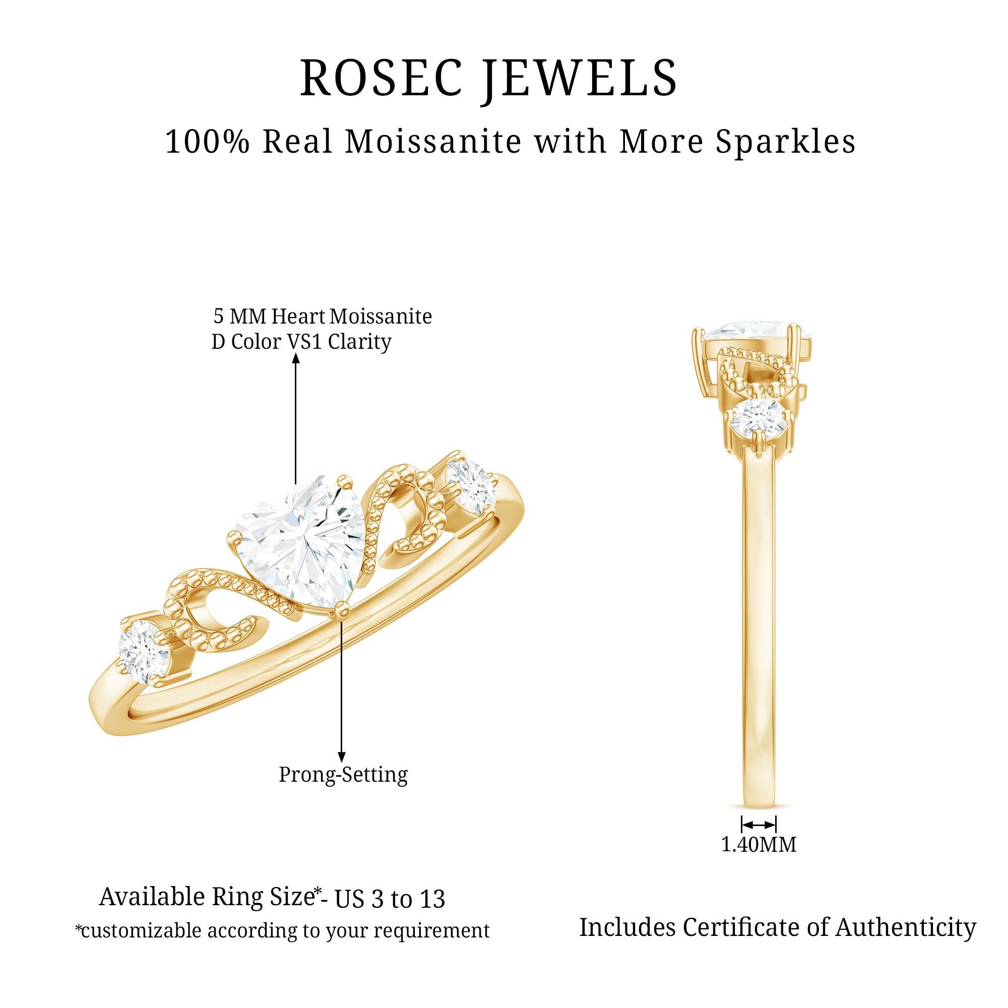 Seal your promise with a Moissanite Heart Ring that speaks the Language of Love and ask the most important question of your life with our Pre Engagement Ring. This Moissanite Promise Ring is a delicate blend of vintage elegance and modern craftsmanship, perfect for proposals, anniversaries, or as a meaningful occasions. At the heart of the design lies a stunning 5 MM heart shaped moissanite, carefully chosen for its exceptional brilliance and romantic shape. Set in secure prong setting, the stone catches light from every angle, symbolizing the bright future you share together. With D color VS1 clarity, this moissanite rivals the sparkle of real diamonds, offering both ethical beauty and lasting durability. The band is a handcrafted masterpiece, featuring an intricate beaded design that evokes the charm of antique heirlooms. Round cut moissanite stones are delicately placed along the band, adding just the right amount of shimmer while keeping the focus on the center stone’s captivating shape. Crafted from high quality materials, this Heart Promise Ring is available in a variety of metal types, metal colors, and in US ring sizes 3 to 13. It offers a perfect fit for every hand. This Proposal Ring arrives in a luxurious jewelry box and includes a gemstone certification, making it ready to gift and treasure for a lifetime.