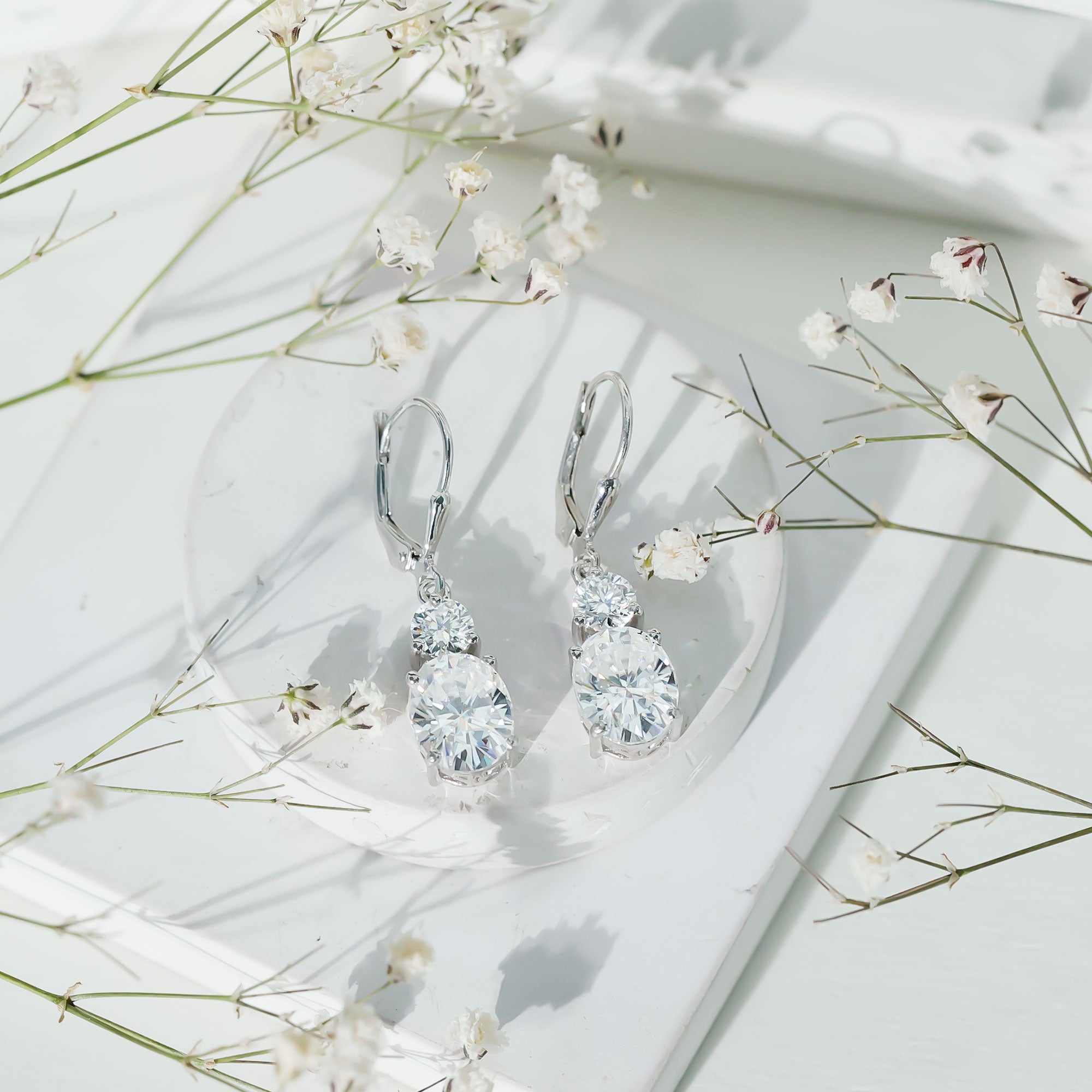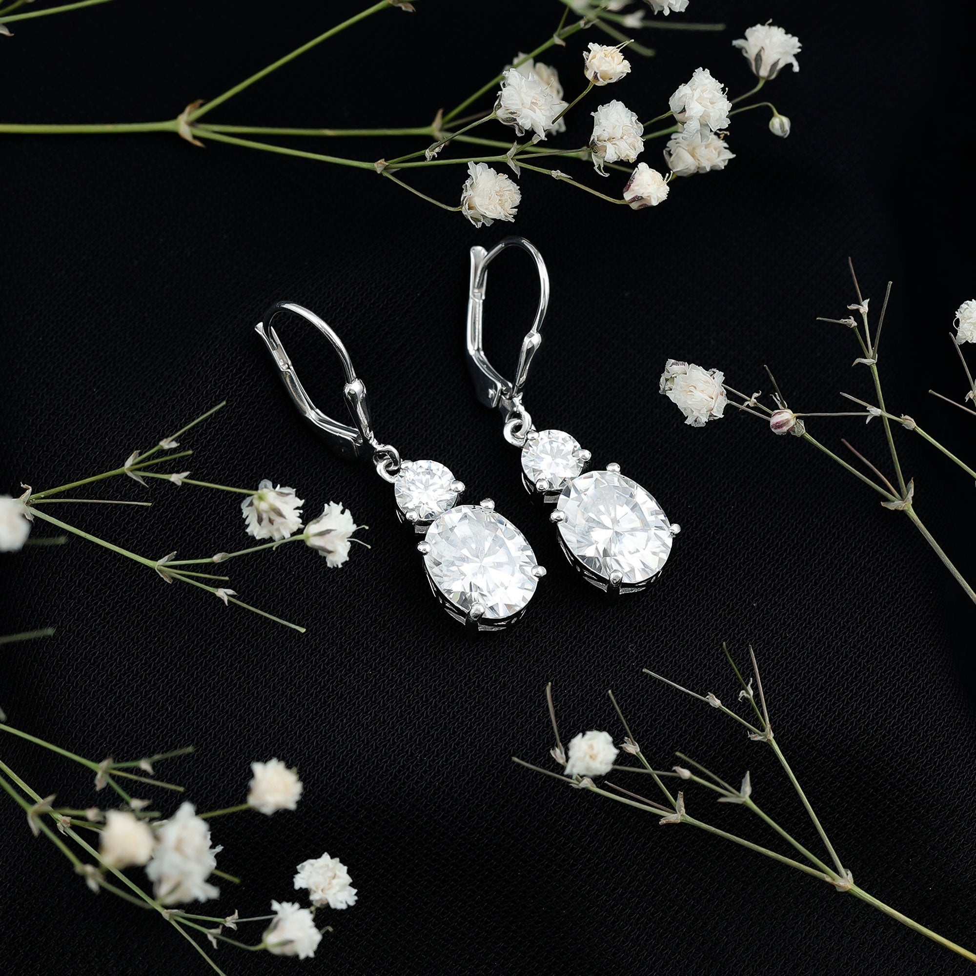 Check out our Sterling Silver Moissanite Earrings that perfectly mix elegance and modern flair, capturing the essence of luxury. Featuring D-VS1 Quality Moissanite, these earrings showcase exceptional brilliance and a captivating interplay of light. Made with 14K White Gold Plated Silver, these Dangle Drop Earrings are adorned with an 8X10 MM oval shaped moissanite, complemented by the dazzling sparkle of 5 MM round brilliant cut stone at the top, set in secure prong setting. The enchanting shimmer of these Bridal Earrings is bound to leave a lasting impression. Enjoy the fashionable style and secure fit of the leverback design, which is sure to attract attention and ignite conversations wherever you wear them.