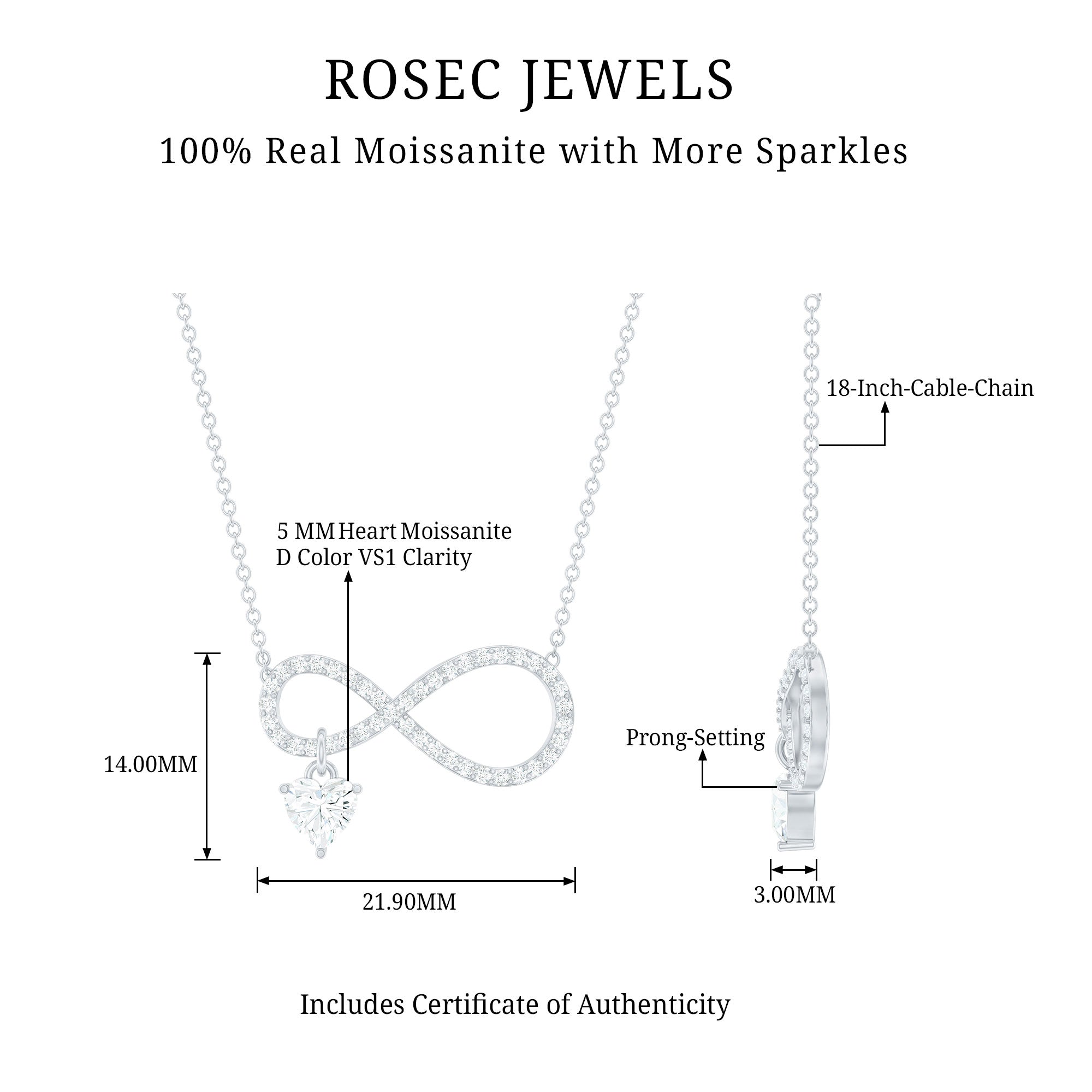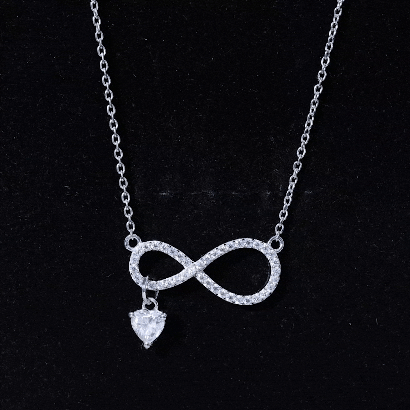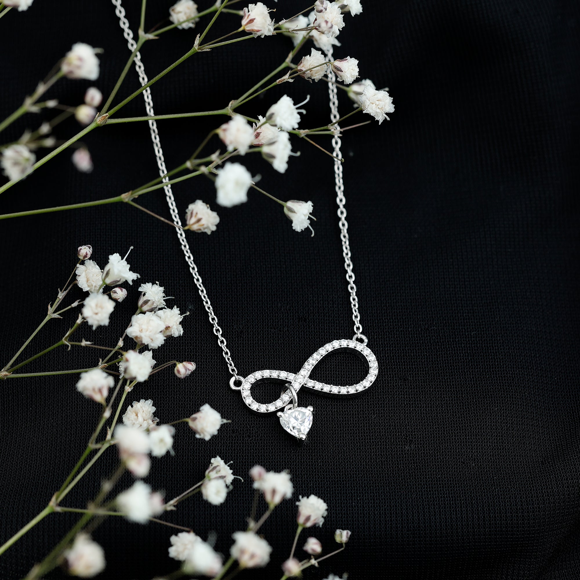 This Infinity Heart Necklace is more than just a regular necklace, it captures a moment in sparkling stones, embodying a graceful dance of love and infinity in pure brilliance. Crafted from 14k white gold plated silver, its smooth design transitions into a refined infinity symbol, adorned with stunning Moissanite stones that glimmer with every flicker of light. Each D color VS1 clarity Moissanite in this White Gold Infinity Necklace is like a soft whisper of feeling, a memory held, a promise kept - together forming a dazzling display that is hard to miss. On one side of the infinity curve, a prong set 5 MM heart-shaped Moissanite hangs, representing eternal love, marked by the forever symbol. The craftsmanship of this Moissanite Stackable Necklace is exceptional, making it a true piece of art. A testament to your everlasting love and commitment, this necklace is destined to be cherished forever.