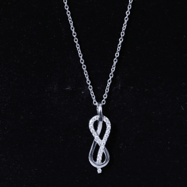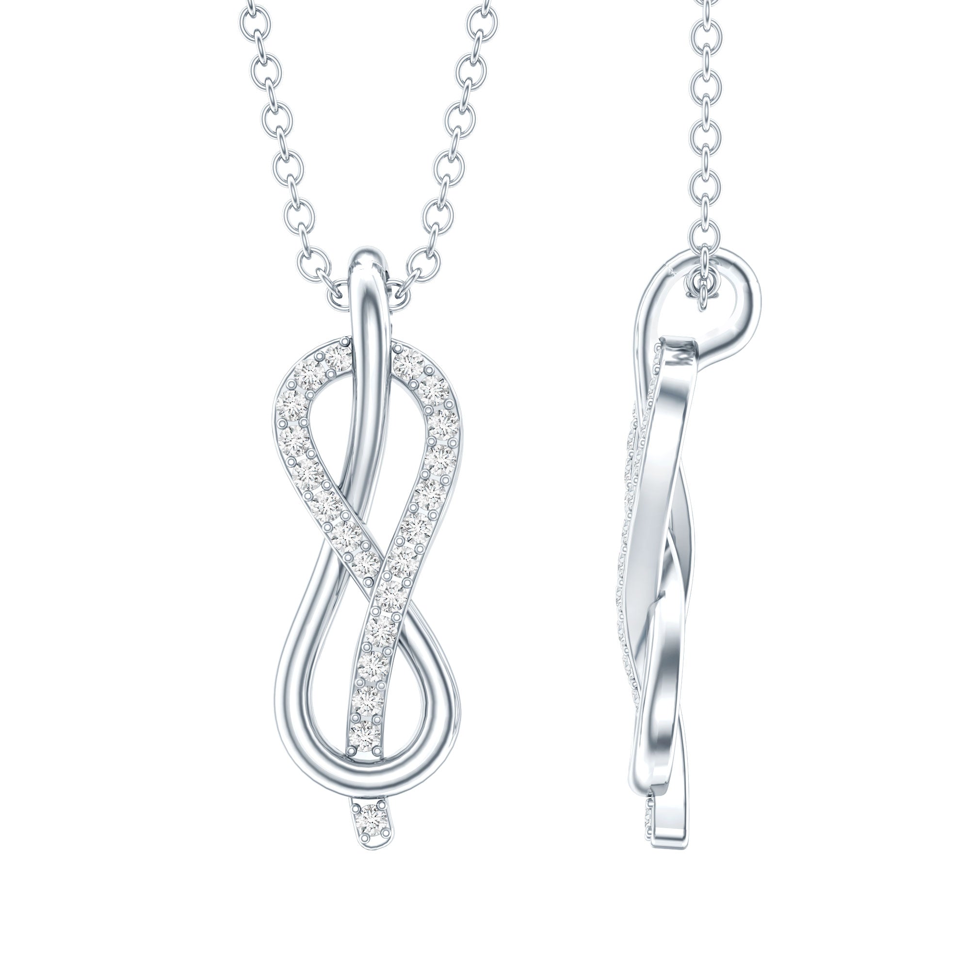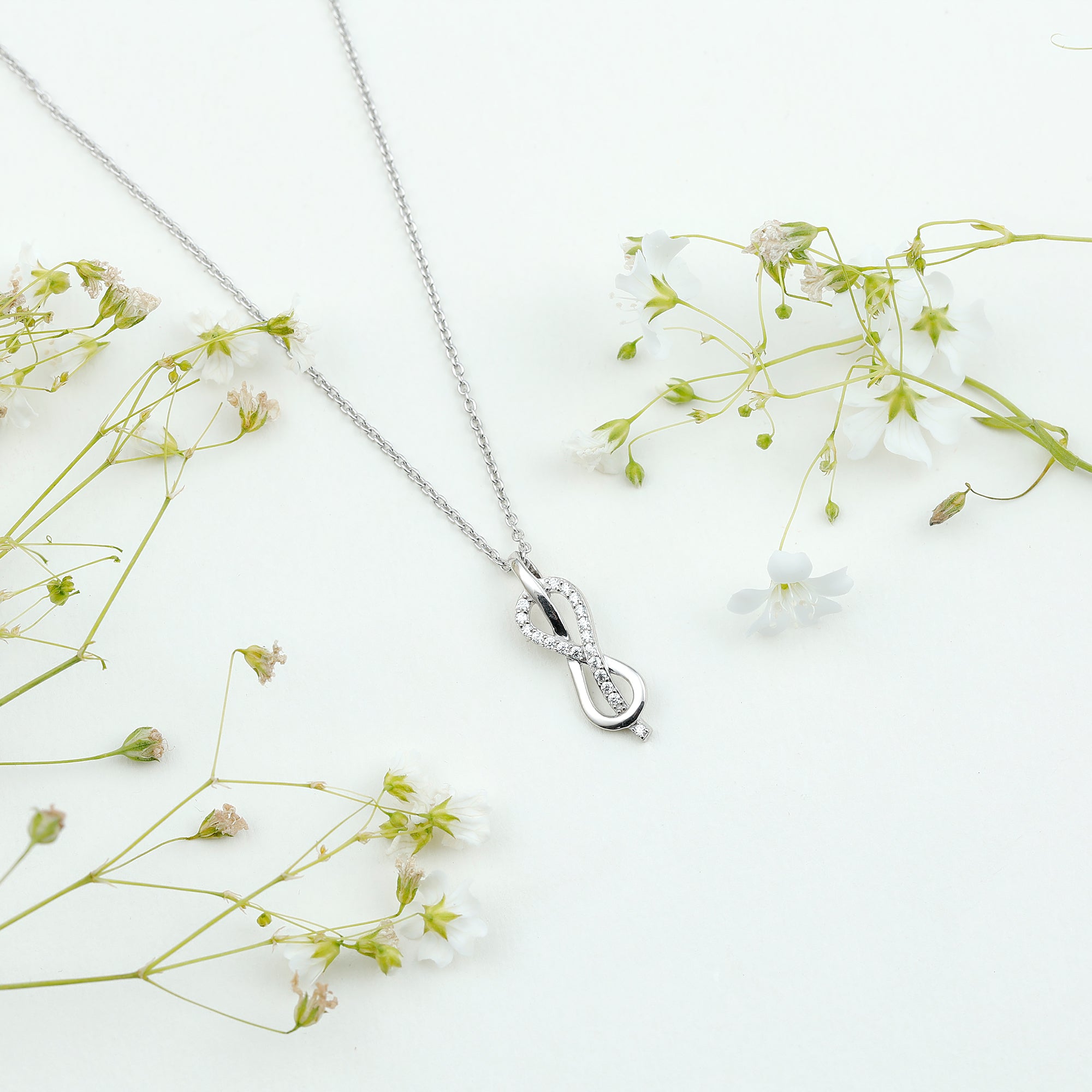 This Moissanite Infinity Pendant can be presented as the symbol of forever love to your special one. The pendant is crafted with 14k White Gold Plated Silver that features Round Shape, Small Pave Set Moissanite of D-VS1 Quality that partially covers the metallic infinity frame to exude a brilliant shine. This Promise Necklace can be presented as a symbol of forever love to your better half. This Pendant with a chain is perfect to complete your look for the special day. It is studded with Moissanites to not only complete the look but also to invoke confidence, which helps you to slay the day with grace and elegance. This Moissanite Pendant Necklace is a classic piece that beautifully embodies the spirit of love. Ideal for both daily elegance and special events, this Infinity Symbol Necklace serves as a heartfelt gift for anniversaries, birthdays, Valentines Day, or any occasion when you wish to express your enduring love and commitment. Symbolizing eternal love with its forever emblem, the craftsmanship of this beauty is outstanding, making it a genuine work of art. A symbol of your lasting love and dedication, it is sure to be treasured for a lifetime.