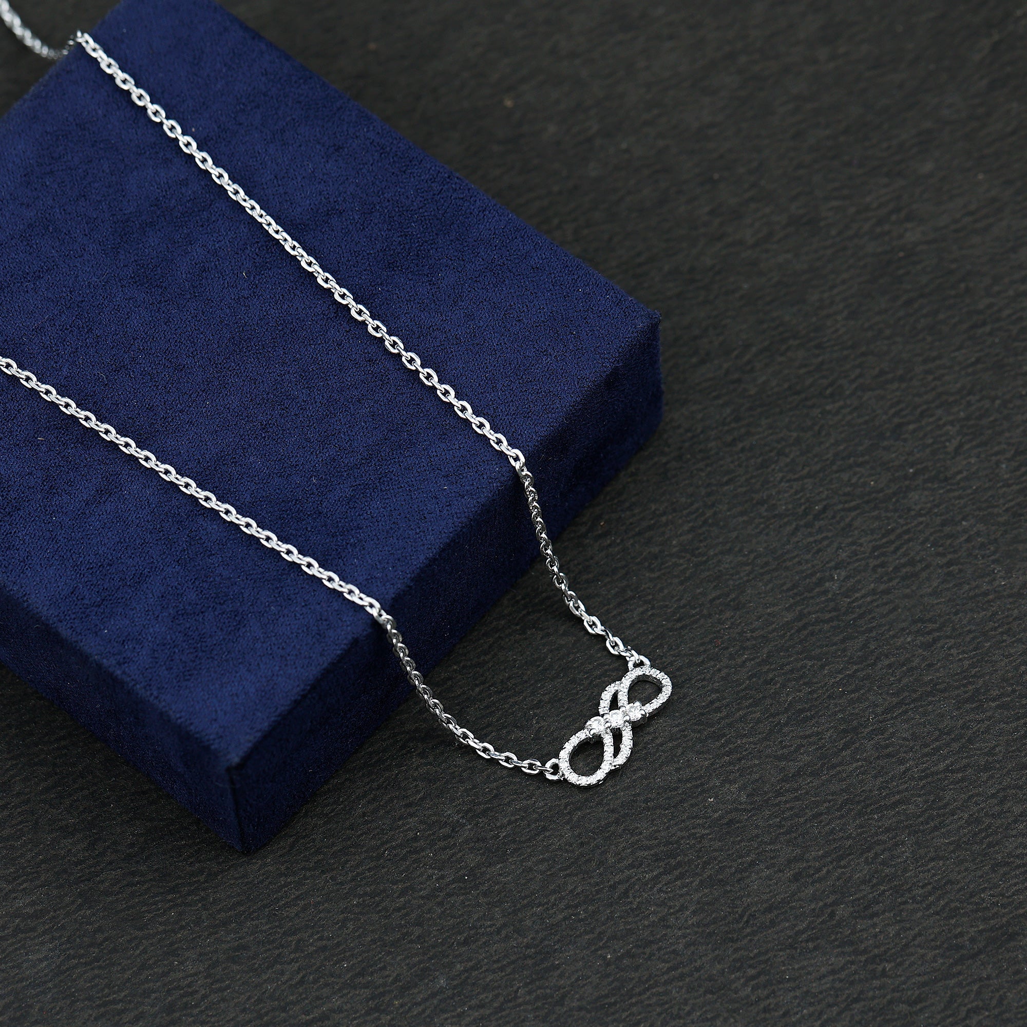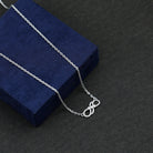 Make yourself the talk of the town with this Moissanite Love Knot Necklace. Handcrafted with care, this Unique Pendant features a sleek, intertwined infinity sign, skillfully designed in 14k white gold plated sterling silver. Sparkling round cut moissanite stones of D-VS1 quality are set in prong setting all over the Double Infinity Necklace. It hangs from a delicate cable chain, ensuring it rests gracefully around her neck. Our minimalist pendant necklace is a symbol of forever love, perfect for gifting on special occasions such as Valentines Day, Anniversaries, Birthdays, New Year, Christmas, and many more.
