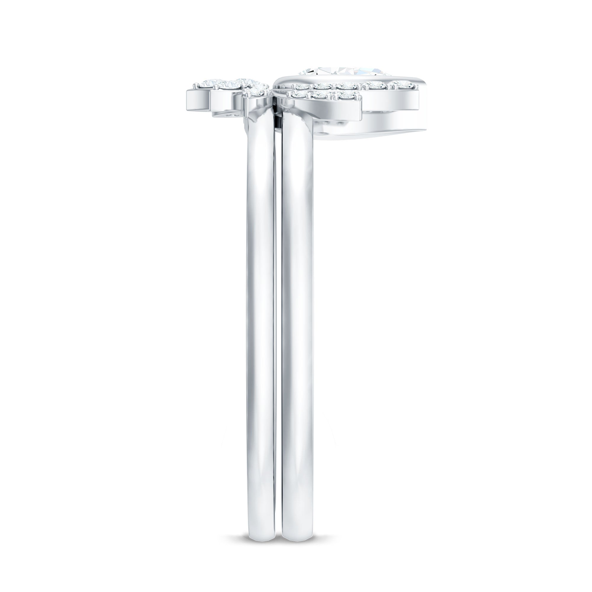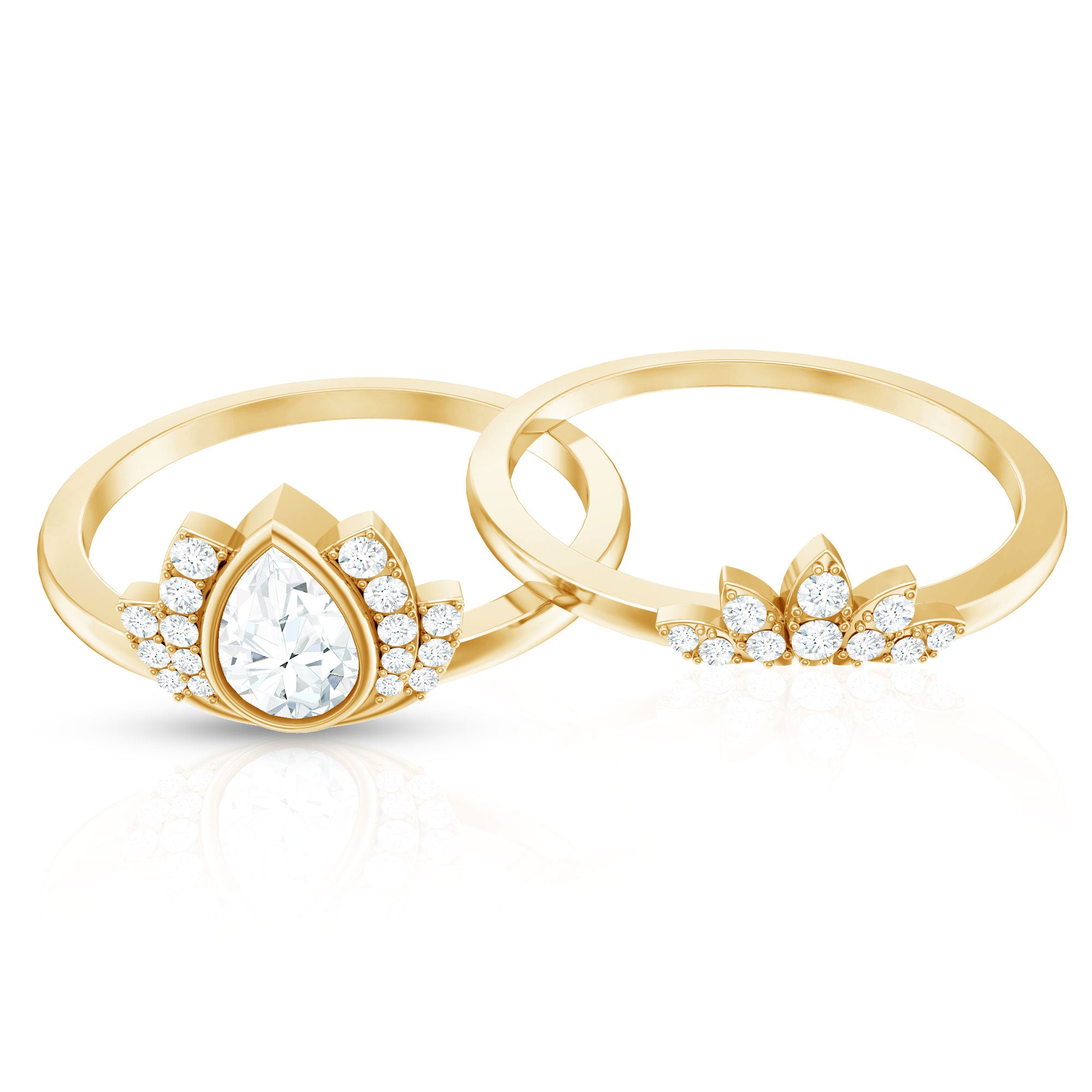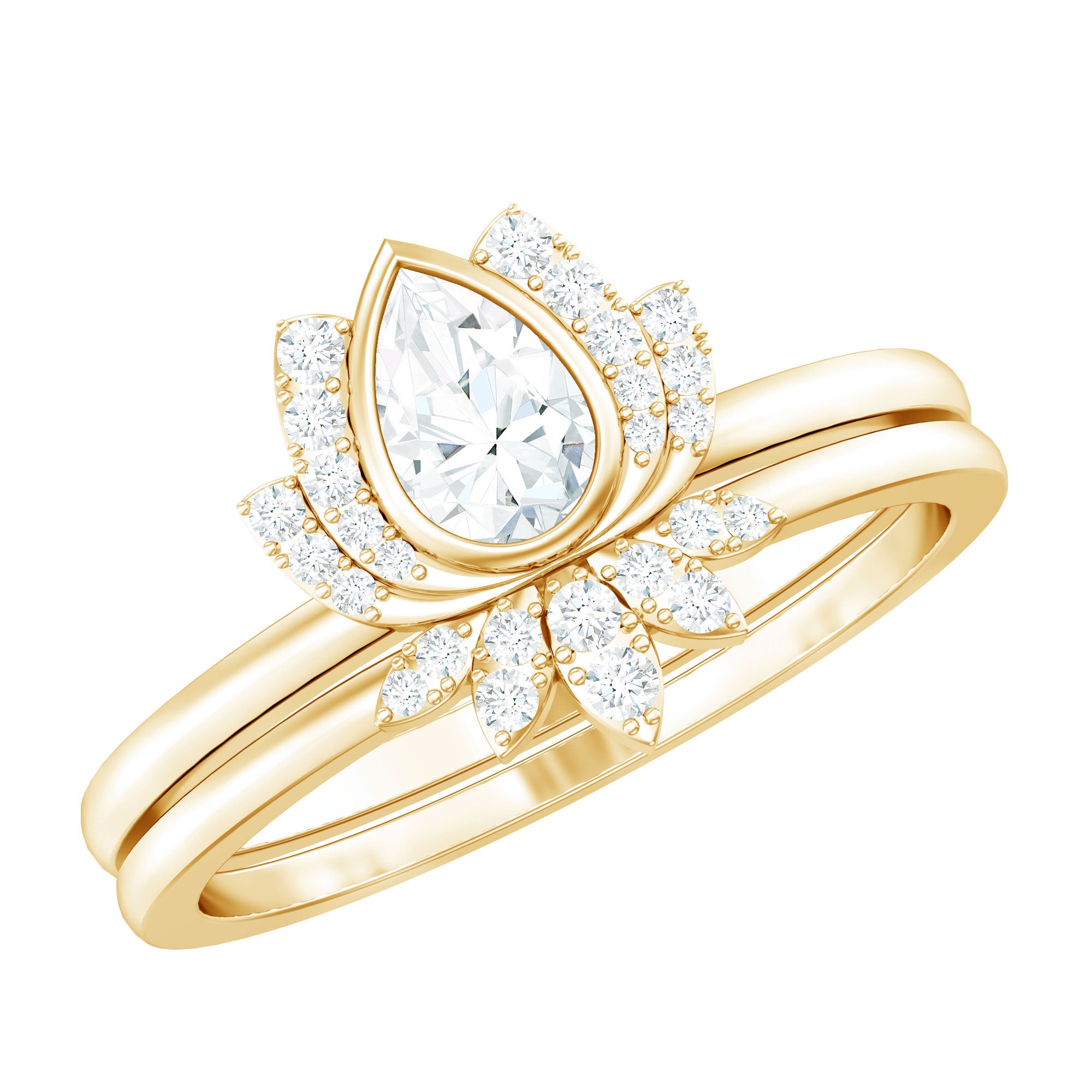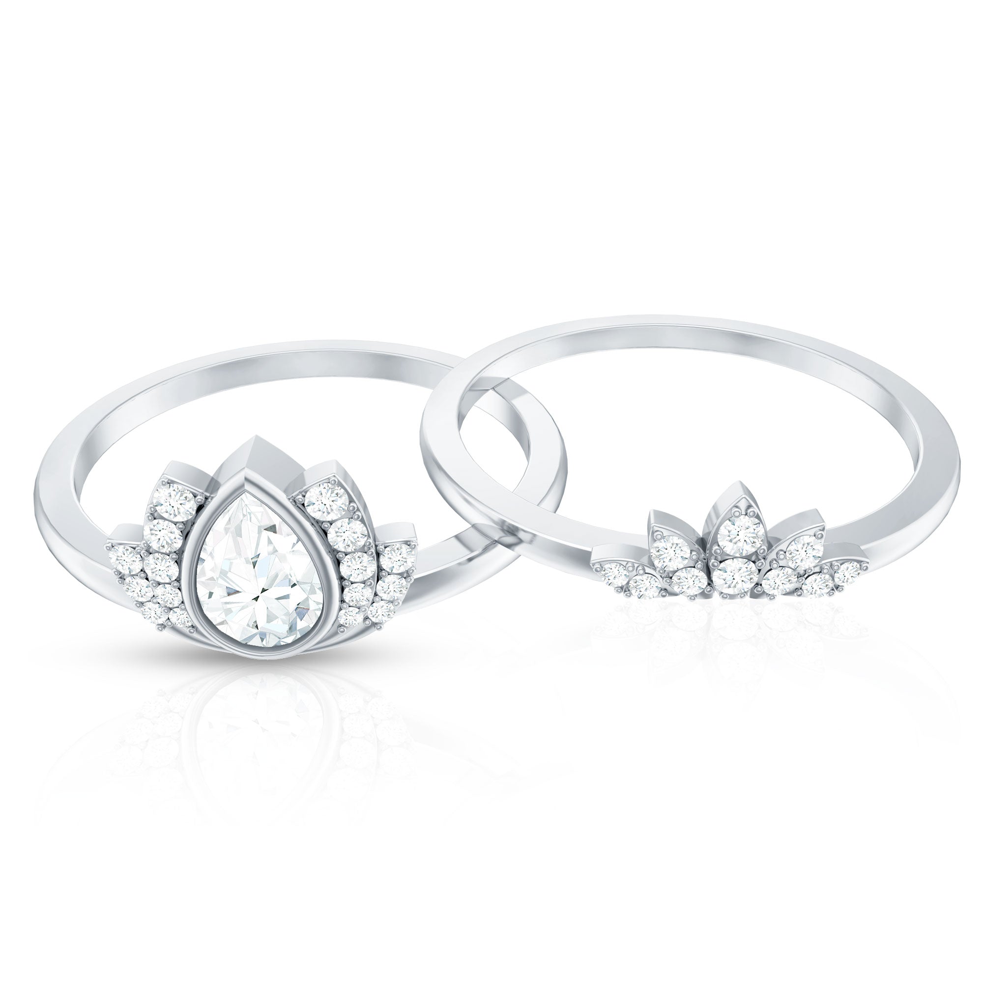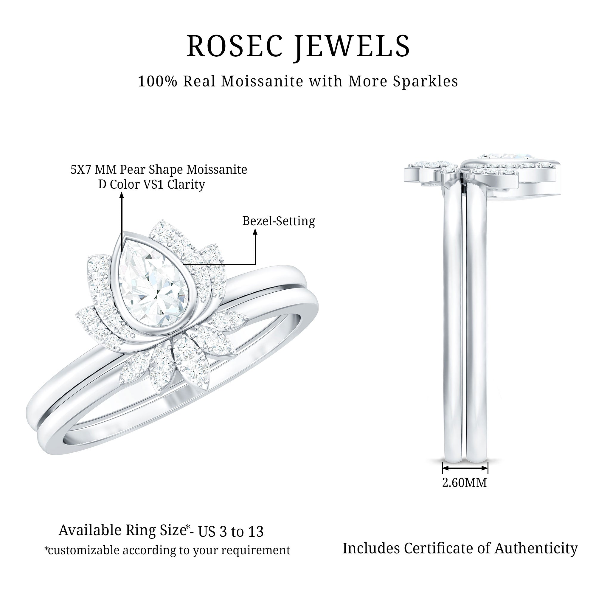 Inspired by the delicate beauty of blooming lotus petals, this Moissanite Engagement Ring Set is a stunning nature-inspired piece for the modern bride. At the heart of the engagement ring lies a brilliant 5X7 MM pear cut moissanite, carefully set in bezel setting to capture light from every angle with its radiant sparkle. Surrounding the center stone are layers of round moissanite stones arranged in a petal-like pattern, mimicking the graceful curves of a lotus flower in full bloom, a symbol of purity, new beginnings, and eternal love. The stackable wedding band is designed to perfectly nestle against the engagement ring, forming a seamless and elegant union. It features round moissanite stones arranged in petal motifs, echoing the organic charm of the lotus flower. Together, the two rings create a Lotus Flower Wedding Ring Set with a timeless design that feels romantic, meaningful, and effortlessly unique. With its soft floral silhouette and sparkling brilliance, this Engagement Ring and Wedding Band Set brings a sense of natural beauty and gentle elegance to any bridal look. It is perfect for the bride who loves nature, finds beauty in detail, and wants a ring that is as symbolic as it is striking. Whether worn together as a set or styled separately, this Flower Bridal Set will always remind her of the love that continues to grow and bloom, just like a lotus rising beautifully and gracefully. A true celebration of love, life, and the journey ahead.