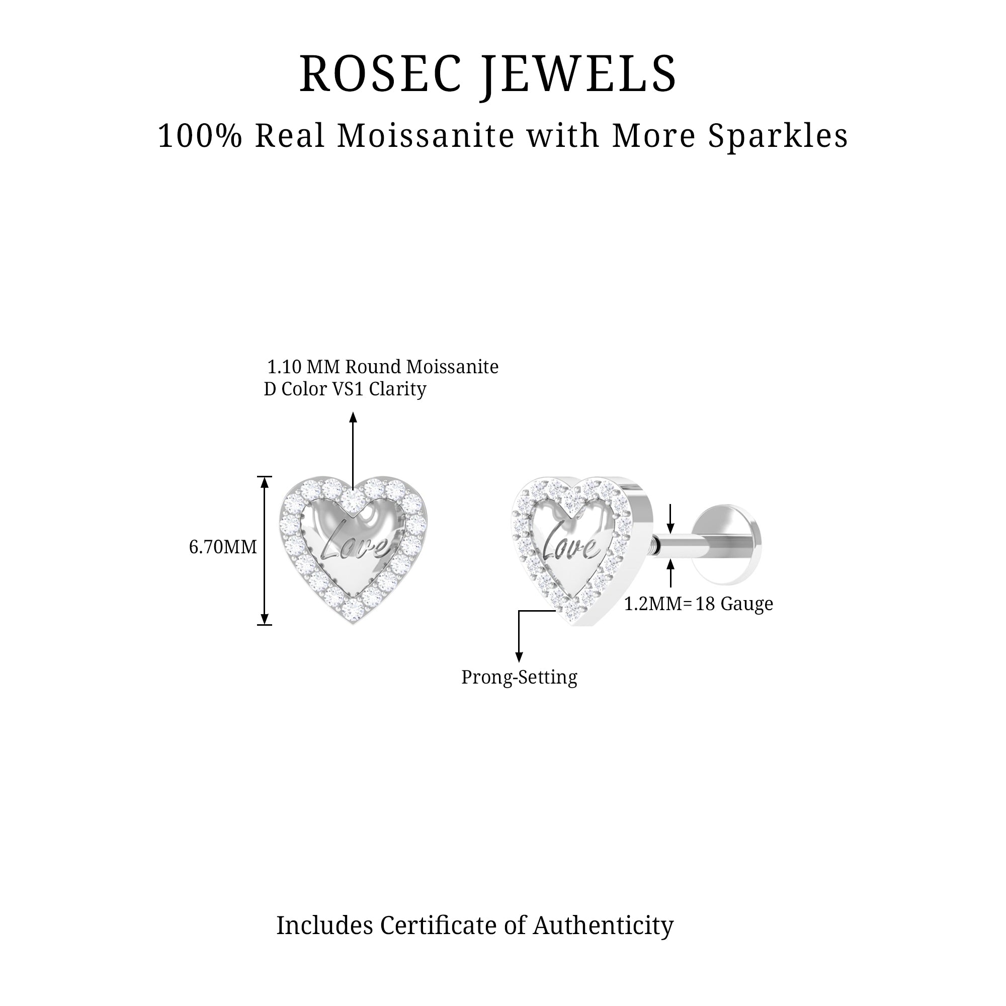 Certified Moissanite Love Heart Earring for Helix Piercing