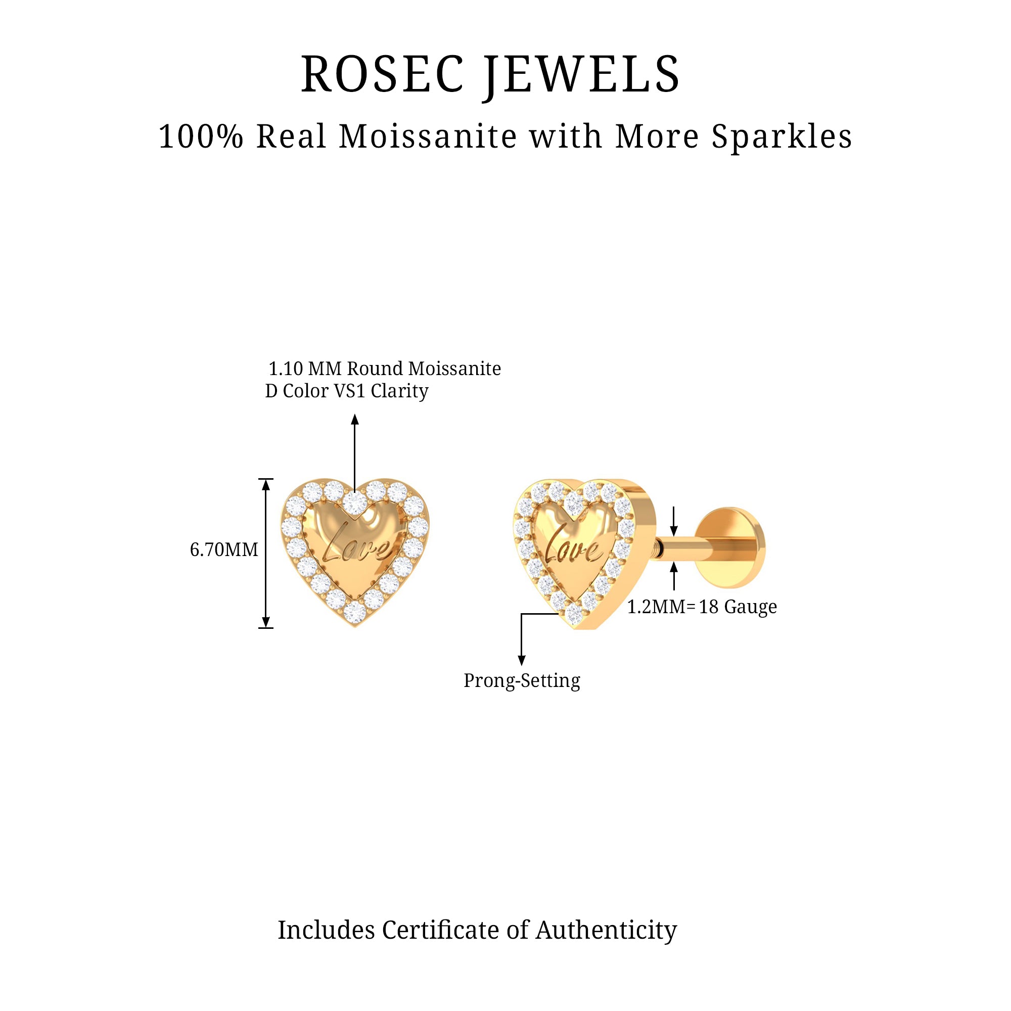 This super adorable Heart Earring is artfully embellished with Round Cut Moissanites at the border of a Heart and engraved with love initials in the center, making it an enchanting piece of jewelry. The Heart Earring is crafted in Gold for a shiny appearance and can be worn on your Helix, Cartilage, or Upper Lobe Piercing.