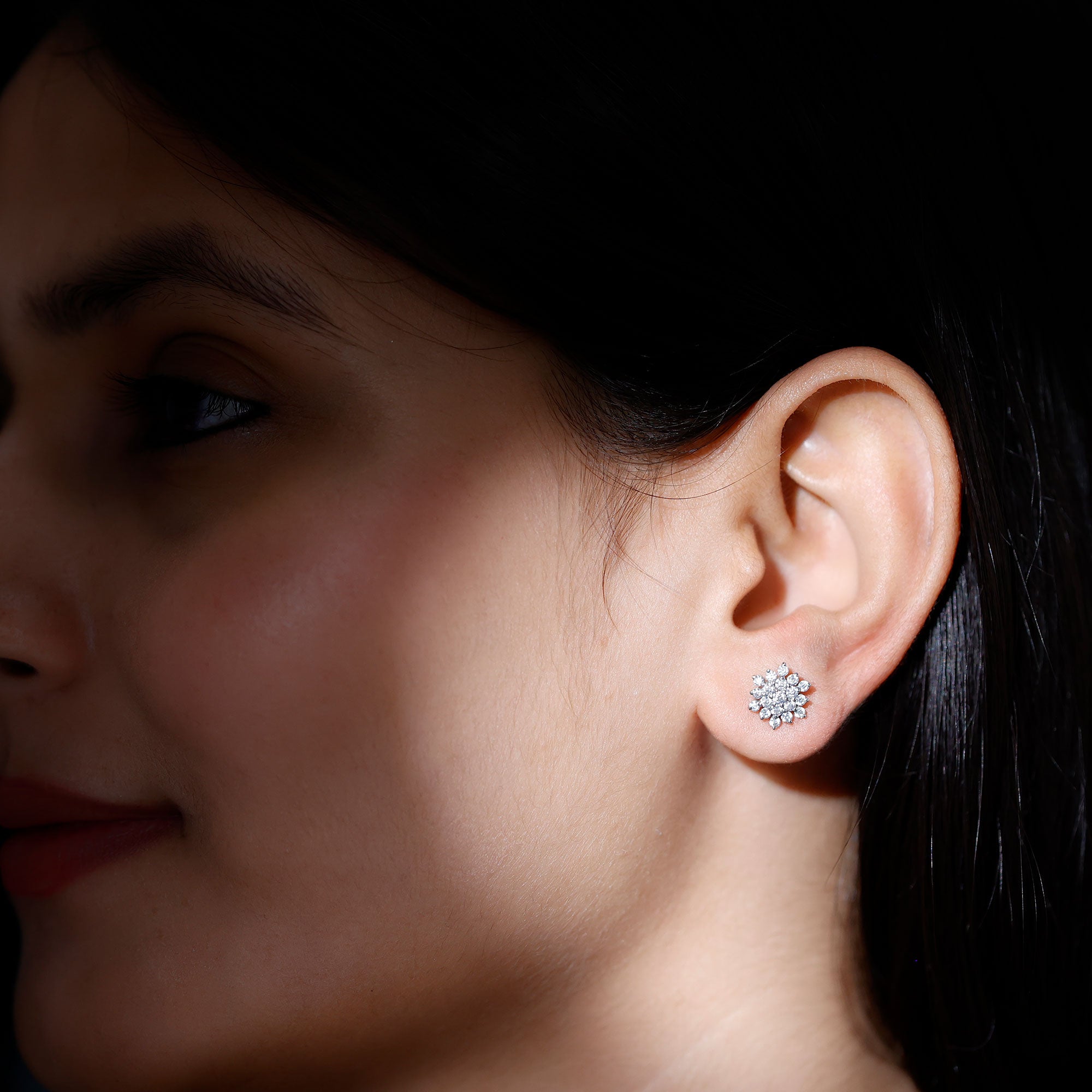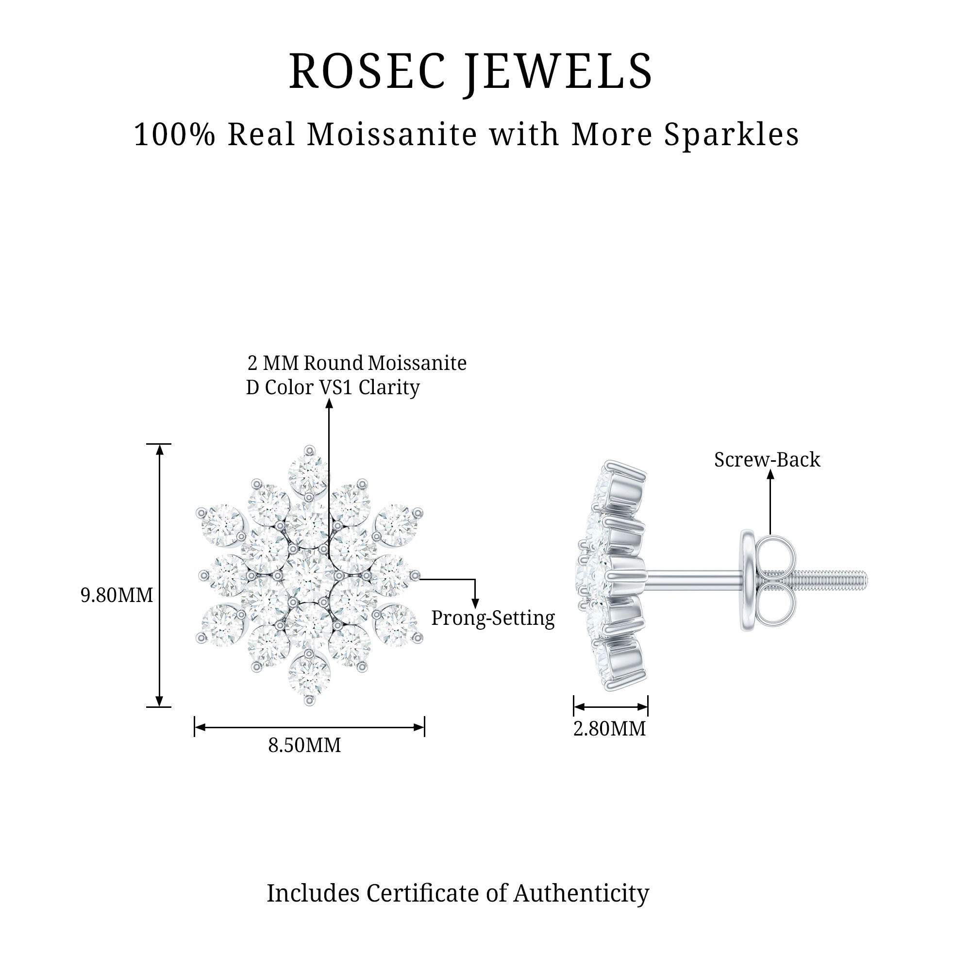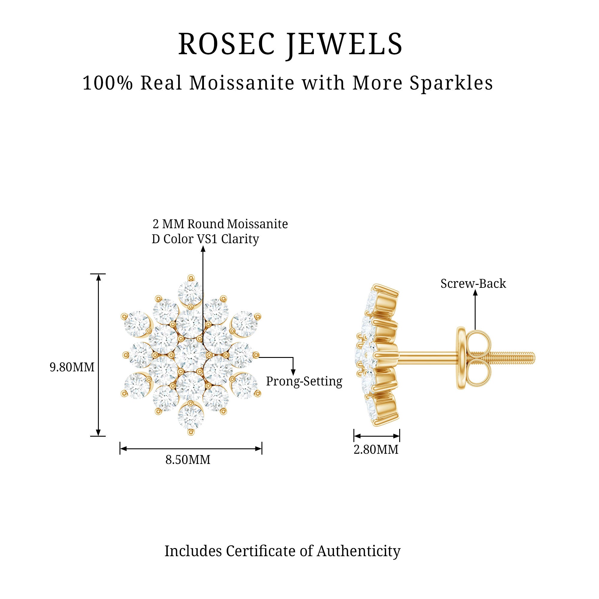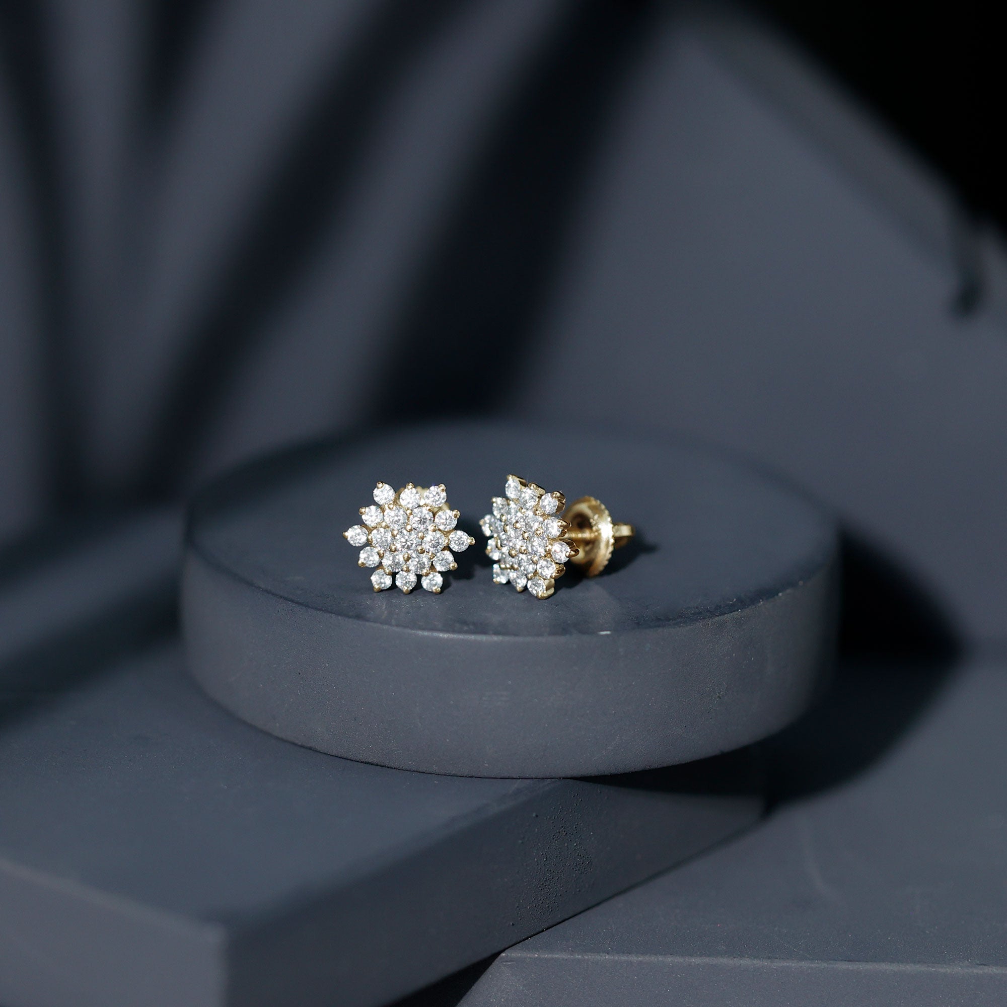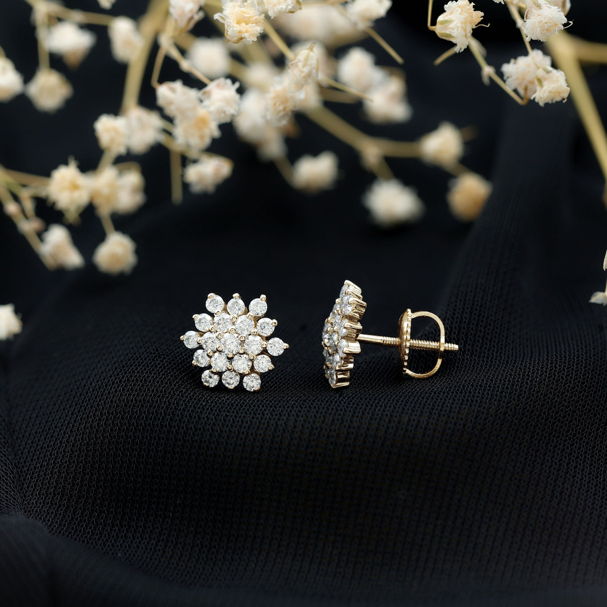 Make a bold statement with your fashion choices by wearing these modern stud earrings, featuring a cluster of round-cut moissanite in a prong setting. Made with solid gold and featuring screw-back closures, these moissanite cluster stud earrings are perfect for those who want to add a touch of elegance and sparkle to their everyday look.
