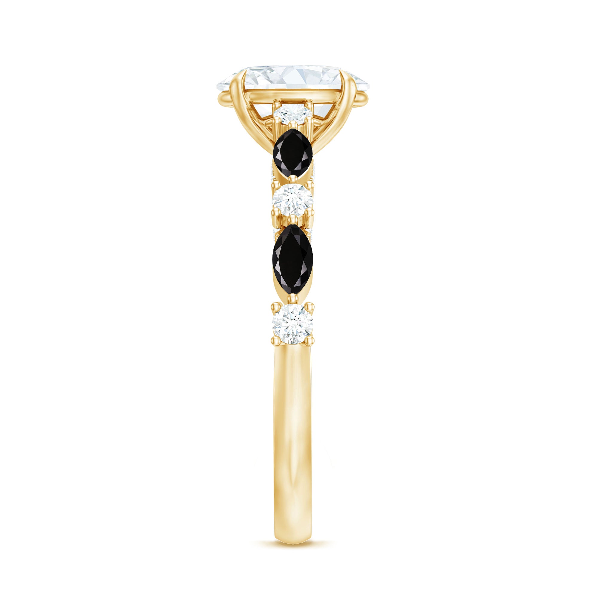 Sparkle meets soul in this breathtaking Oval Engagement Ring designed to celebrate a love that feels truly one of a kind. At the center shines a luminous 6X8 mm Oval Shape Moissanite set in Claw Setting, glowing with brilliant fire and elegance that instantly draws the eye. The band tells its own romantic story, featuring horizontally set Marquise Shaped Black Spinel stones paired with Round Shape Moissanite stones, creating a graceful contrast of light and depth. This unique blend of dark and radiant stones symbolizes balance, passion and the beauty of two hearts coming together. Adding an intimate touch, delicate Moissanite stones adorn the bridge beneath the center gem, offering a hidden shimmer meant to be discovered in meaningful moments. Thoughtfully crafted with comfort and beauty in mind, this Moissanite Engagement Ring feels as magical as the promise it represents. Whether chosen for a heartfelt proposal or to mark a special chapter in your journey, this Solitaire Engagement Ring carries emotion in every detail. Presented in a signature jewelry box and available in a range of ring sizes, this Oblong Engagement Ring with Side Stones is a sparkling expression of devotion, designed to be cherished for a lifetime.