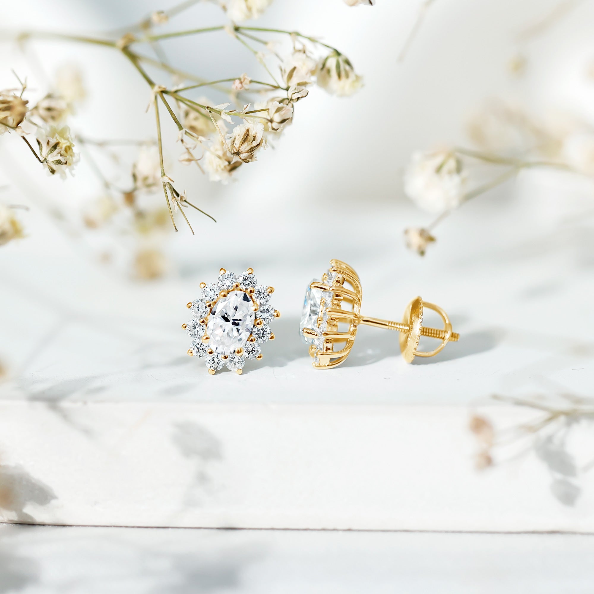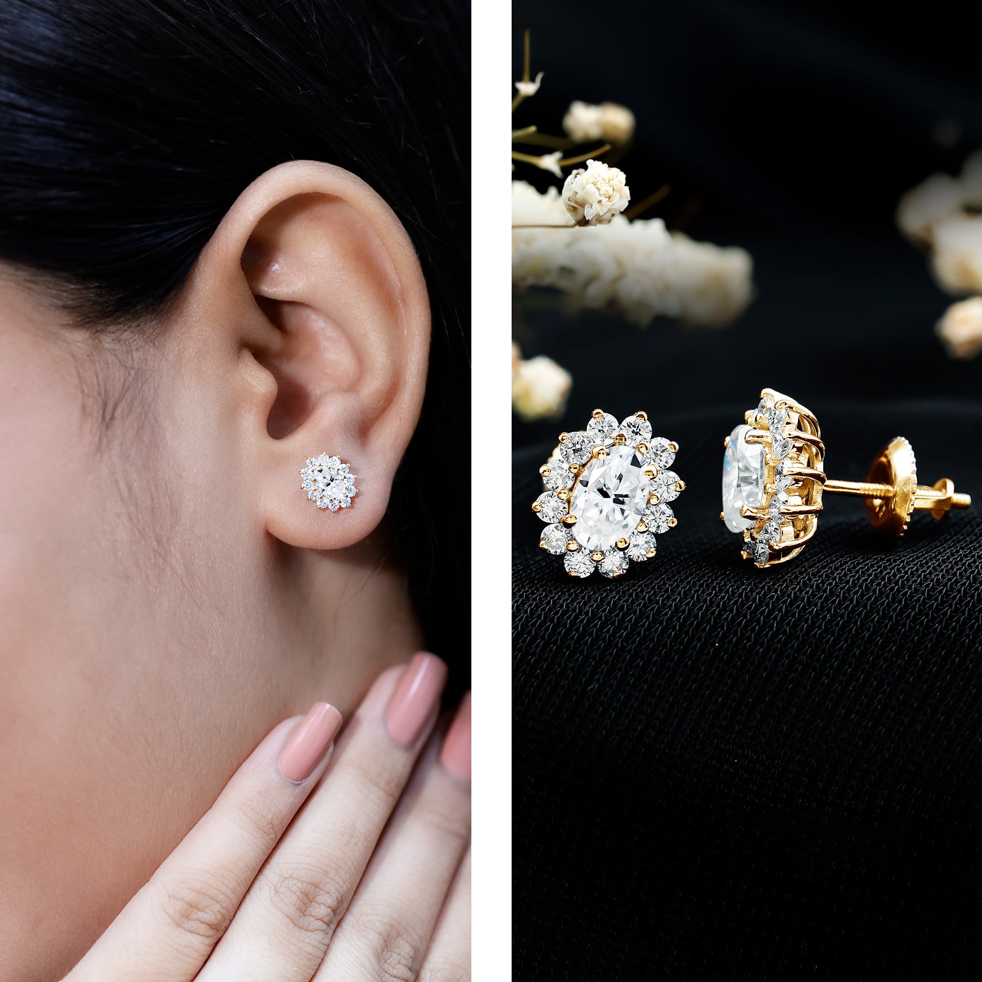 Every jewelry lover will appreciate the charm and elegance of these Moissanite Stud Earrings, designed to add sparkle and sophistication to any outfit. Curated with a 4X6 MM oval shaped moissanite, set in secure prong setting. Surrounding the center stone is a delicate halo of smaller round moissanite stones, creating a shimmering effect that enhances the beauty of the Oval Stud Earrings. The earrings are designed with a screw back closure, ensuring they stay comfortably in place throughout the day. Lightweight and easy to wear, they are perfect for daily use as well as for special occasions. Their versatile design allows them to complement both casual and formal outfits, making them a timeless addition to any jewelry collection. These Halo Stud Earrings make a thoughtful and meaningful gift for birthdays, anniversaries, or other special moments, celebrating love, commitment, and enduring beauty.