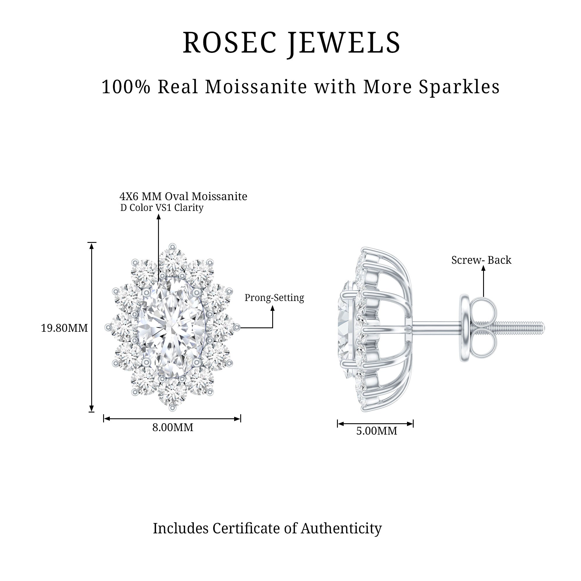 Every jewelry lover will appreciate the charm and elegance of these Moissanite Stud Earrings, designed to add sparkle and sophistication to any outfit. Curated with a 4X6 MM oval shaped moissanite, set in secure prong setting. Surrounding the center stone is a delicate halo of smaller round moissanite stones, creating a shimmering effect that enhances the beauty of the Oval Stud Earrings. The earrings are designed with a screw back closure, ensuring they stay comfortably in place throughout the day. Lightweight and easy to wear, they are perfect for daily use as well as for special occasions. Their versatile design allows them to complement both casual and formal outfits, making them a timeless addition to any jewelry collection. These Halo Stud Earrings make a thoughtful and meaningful gift for birthdays, anniversaries, or other special moments, celebrating love, commitment, and enduring beauty.