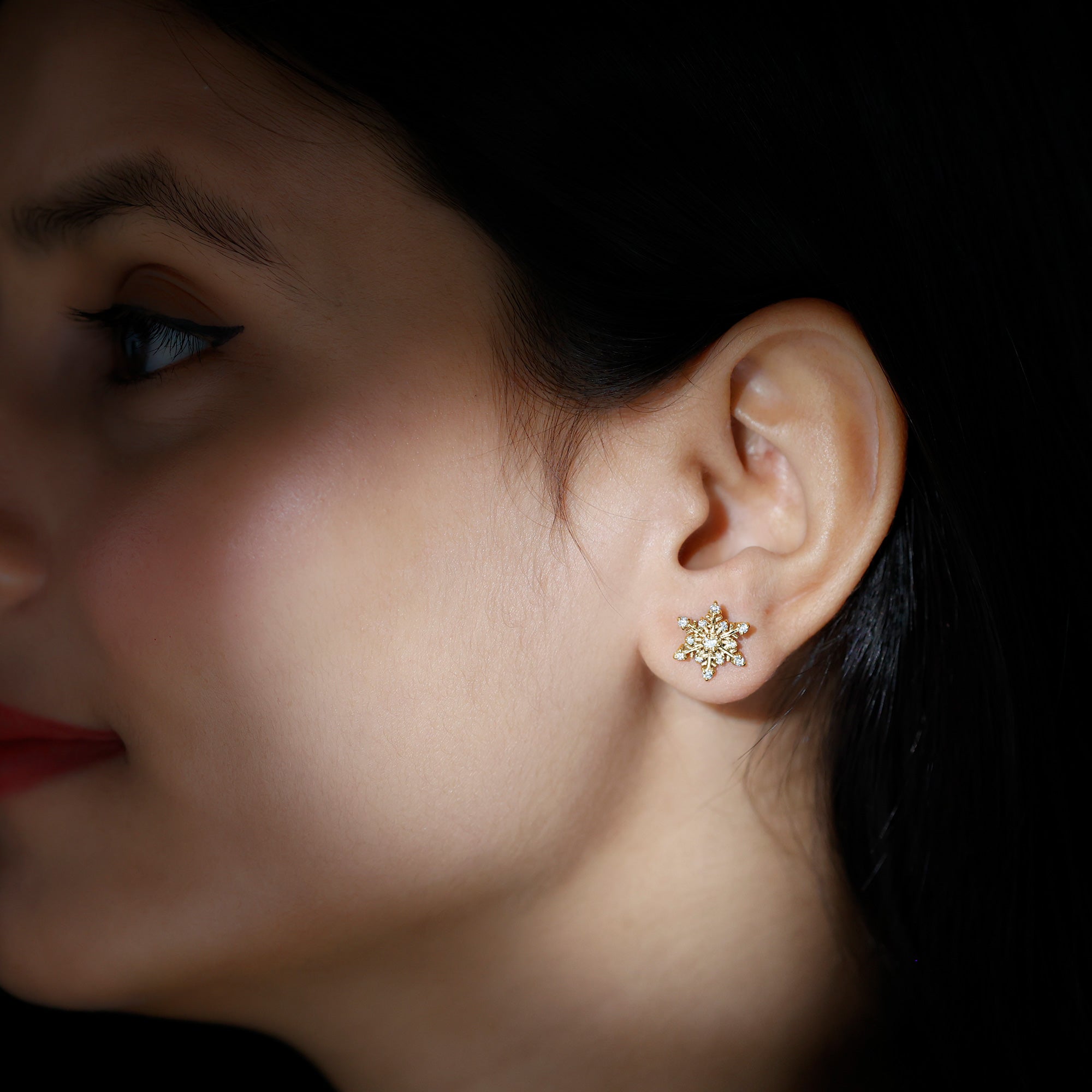 Sparkle like a winter morning with these charming Snowflake Stud Earrings. Designed to bring a soft and magical glow to your style, they capture the quiet beauty of falling snow in a piece you can wear every day. The snowflake shape is crafted with fine detail, creating a delicate and graceful look that feels both festive and timeless. Set at the center and along each tiny branch of the snowflake are brilliant round moissanite stones. Their bright shimmer adds a touch of light to your face, making the Moissanite Earrings perfect for moments when you want something subtle yet eye-catching. Whether you are heading to a cozy holiday gathering, a fun winter date, or simply adding a sweet sparkle to your daily outfit, these Moissanite Stud Earrings bring a gentle charm to every moment. Made with careful craftsmanship, the Snowflake Earrings feel sturdy yet lightweight, making them easy to wear from morning to night. The secure screw-back closure ensures they stay in place comfortably, giving you the confidence to go about your day without worry. Pair them with casual look or dressier outfits, they adapt effortlessly while adding a gentle sparkle every time you wear them.