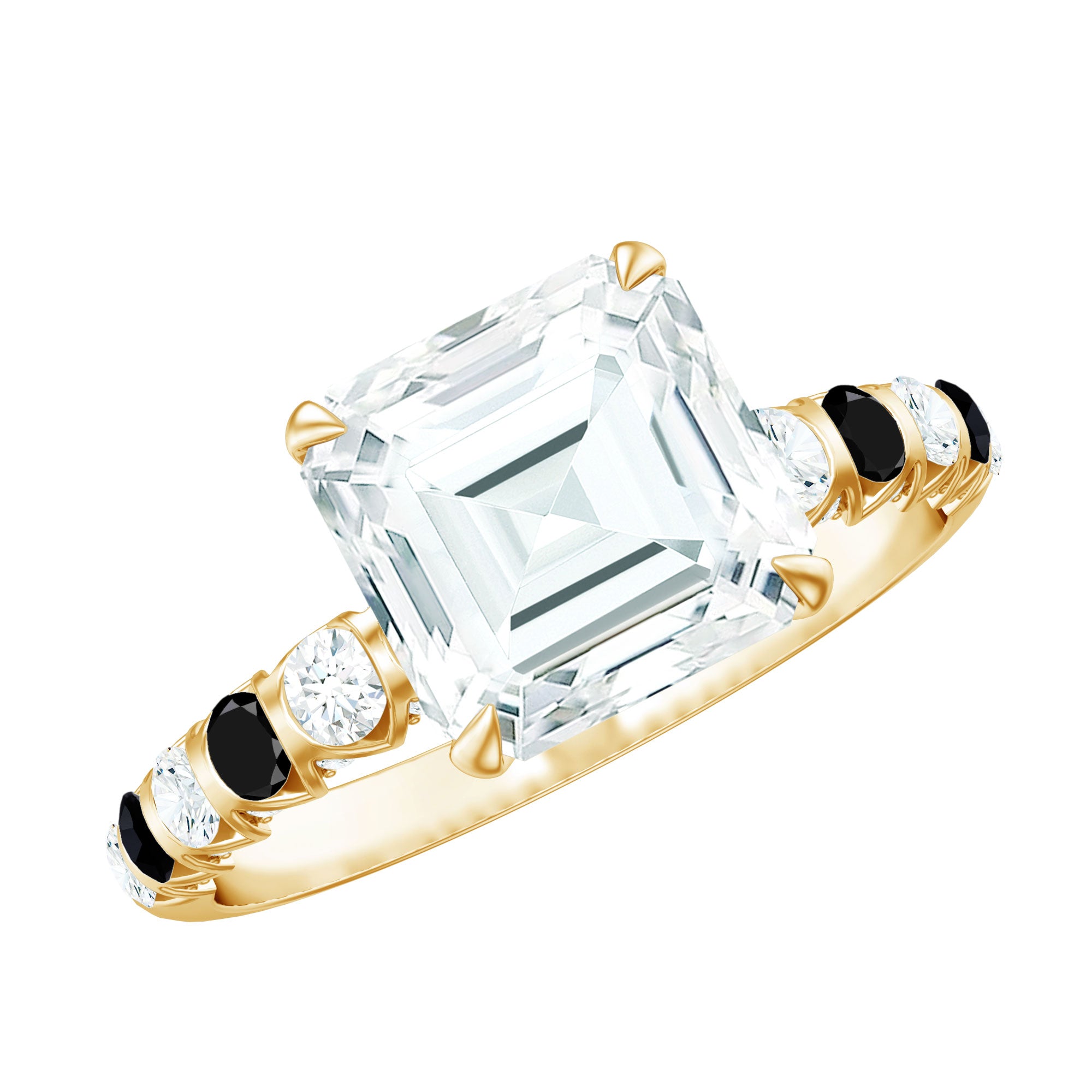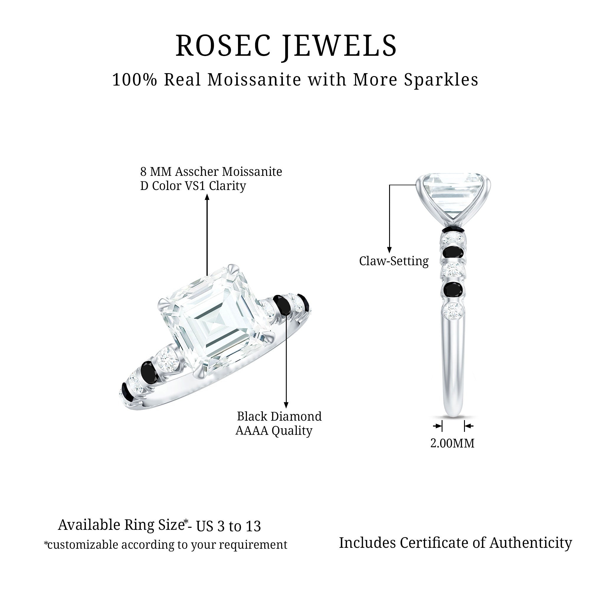 Get this Moissanite Engagement Ring that is as special as your lady love. Adorned with asscher cut moissanite claw set in the center, the shank is lined with created black diamond and moissanite making this ring a captivating piece of jewelry that deserves to be in her jewelry wardrobe. Crafted with proper care and precision, the D-VS1 Moissanite boosts the quality and adds an extra touch of elegance and charm. Celebrate this wedding anniversary or present the moissanite ring to your beloved and show her how much you love her.