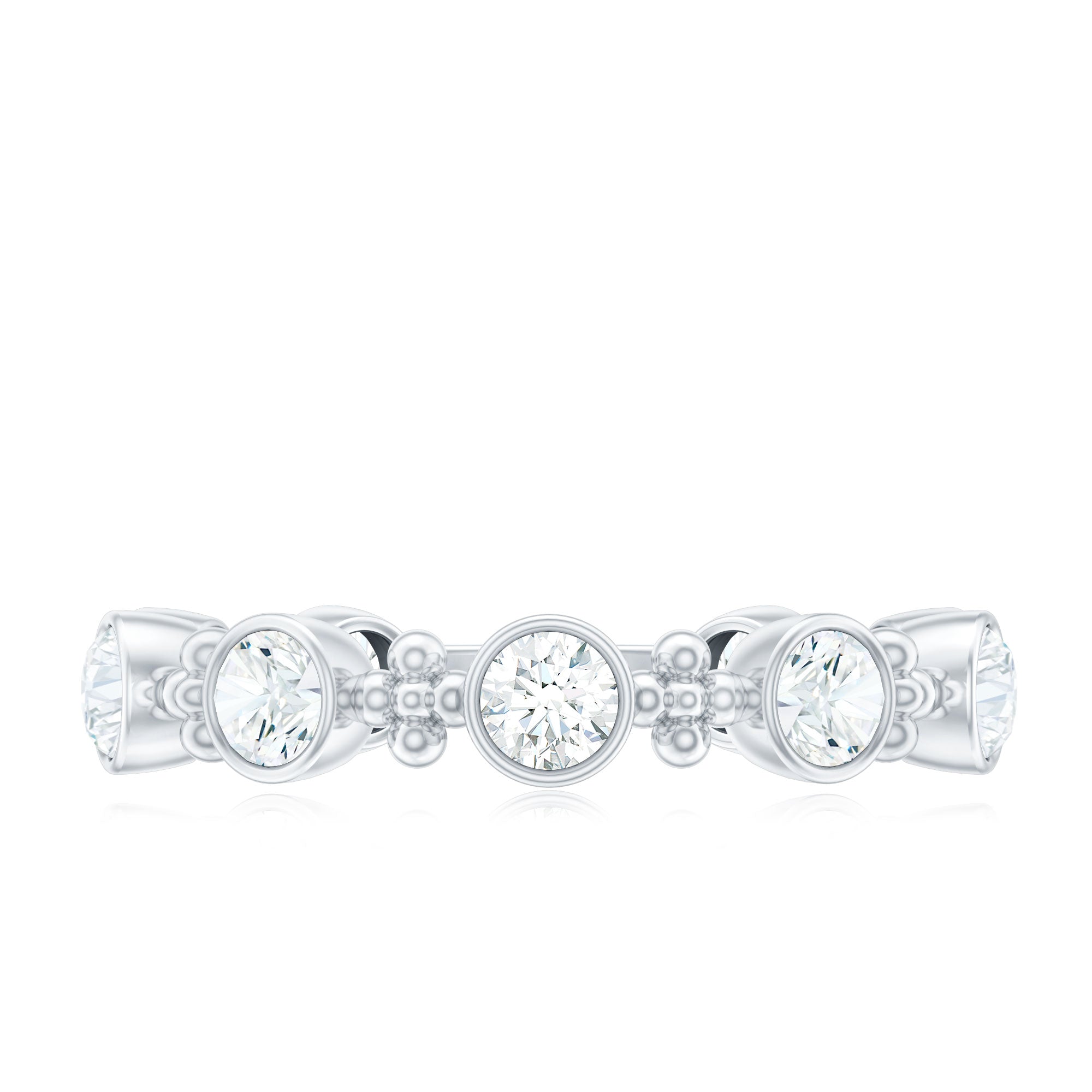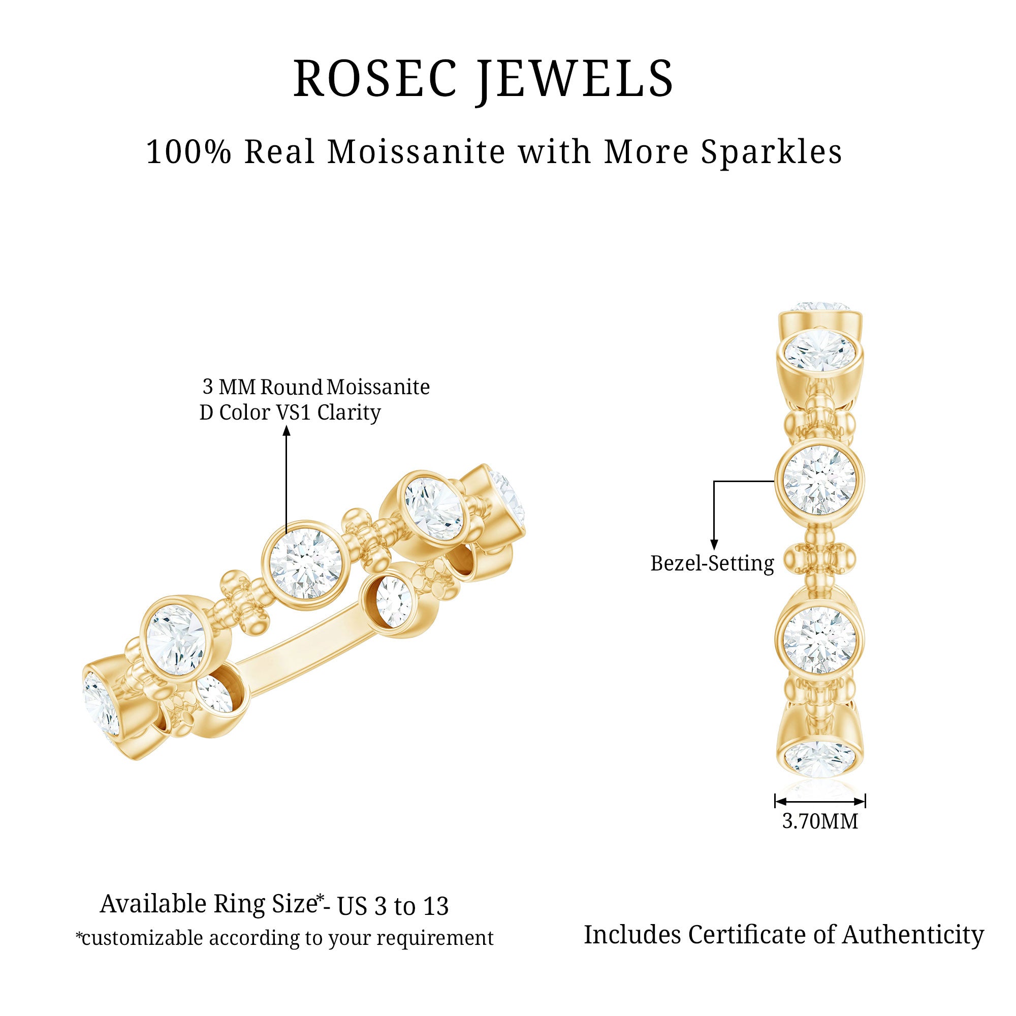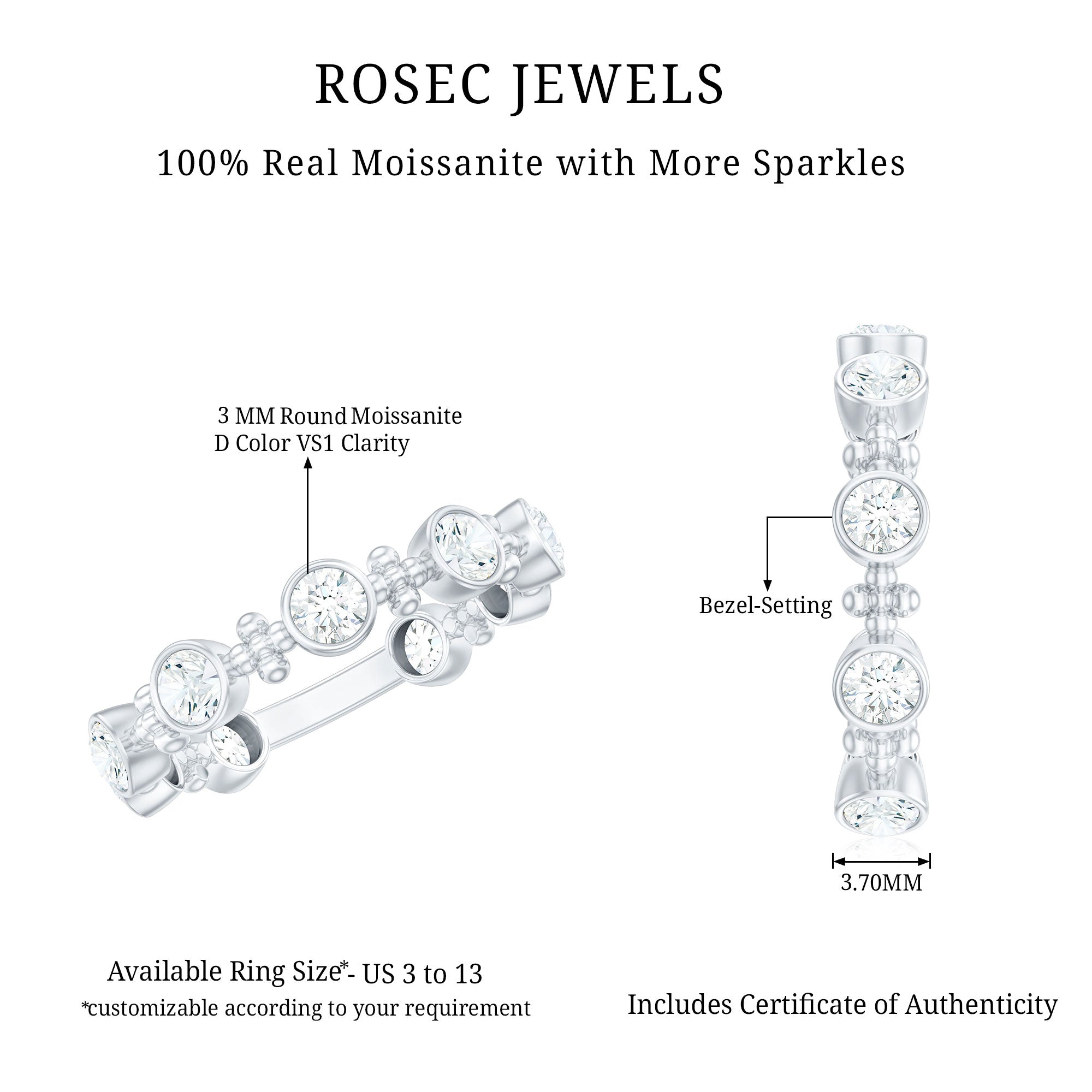 This Moissanite Eternity Band radiates elegance from every angle, blending timeless sparkle with a modern design. Featuring alternating beaded flowers and 3 MM round cut moissanite stones set in bezel setting over half the band, it creates a stunning rhythm of shine and style. Each D-VS1 quality moissanite stone captures light with incredible brilliance, making this Eternity Wedding Band a gorgeous choice for weddings, anniversaries, or any special occasion you want to celebrate. The eternity design symbolizes everlasting love, making it a truly meaningful gift for occasions like birthdays, Valentines Day, Mothers Day, New Year, or Christmas. Whether worn alone or stacked with your favorite rings, this Bezel Set Eternity Ring adds a soft, glowing touch to both casual outfits and dress ensembles. It is comfortable to wear, thoughtfully crafted, and designed to last a lifetime. Your Moissanite Wedding Band comes in an elegant jewelry box, ready to be gifted and sure to impress. With its unique sparkle and smooth, classic design, this Moissanite Stackable Ring serves as a simple yet powerful symbol of love, beauty, and forever.