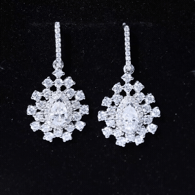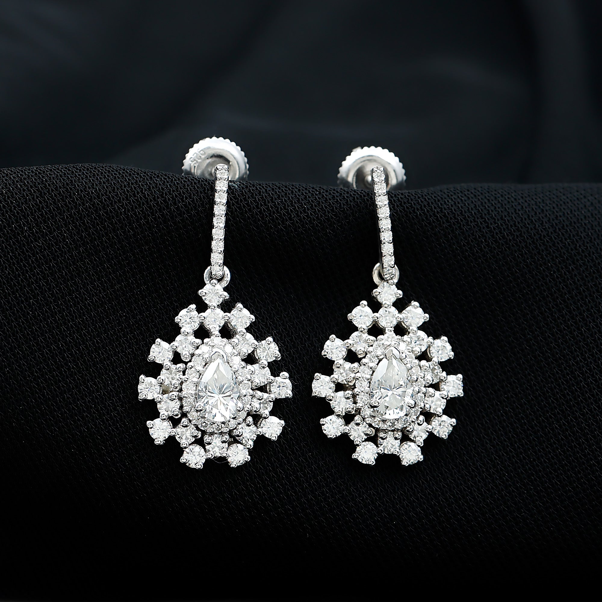 Complete your look for D-Day with these Moissanite Earrings, precisely handcrafted with 14K White Gold Plated Silver. These earrings feature a 4X6 MM Pear Shape secured in Prong Setting and decorated with petite stones that embrace the beauty of the earrings. The striking shine of D-VS1 Quality Moissanite makes it perfect to pair with the wedding jewelry set. These Drop Earrings dangle with a stone studded metallic bar, which makes it a perfect statement piece.