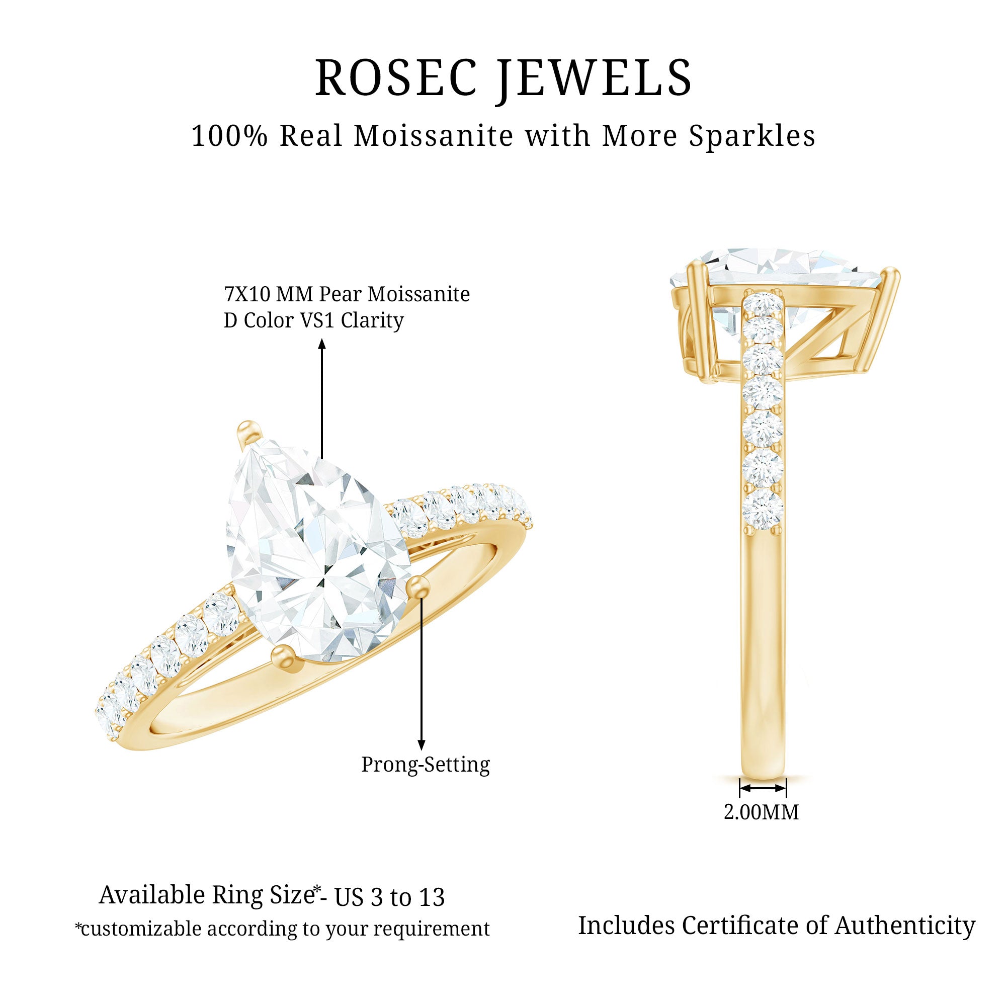 This Moissanite Engagement Ring is a classic piece that will definitely capture her heart for a lifetime. Mark your romantic journey with this Solitaire Engagement Ring, which is a perfect choice for the sophisticated bride. Express the depth of your love with this Teardrop Engagement Ring, leaving a lasting impression that elegantly blends grace and charm. The ring showcases a 7X10 MM Pear Shaped Moissanite set in 3 prong setting as a Solitaire. The band is adorned with round cut Moissanite Side Stones, creating a dazzling look that serves as a beautiful reminder of your forever with every glance. As a gorgeous 2 Carat Moissanite Ring for Women, it ensures you will shine in any crowd. We provide a range of ring sizes for the perfect fit and can send a free ring sizer kit upon request before we dispatch the final product. Whether it is for an Engagement, Mothers Day, Anniversary, Valentines Day, Christmas, or Birthday, this Pear Shaped Engagement Ring is the ideal way to commemorate the wonderful memories of joy and laughter shared throughout your journey.