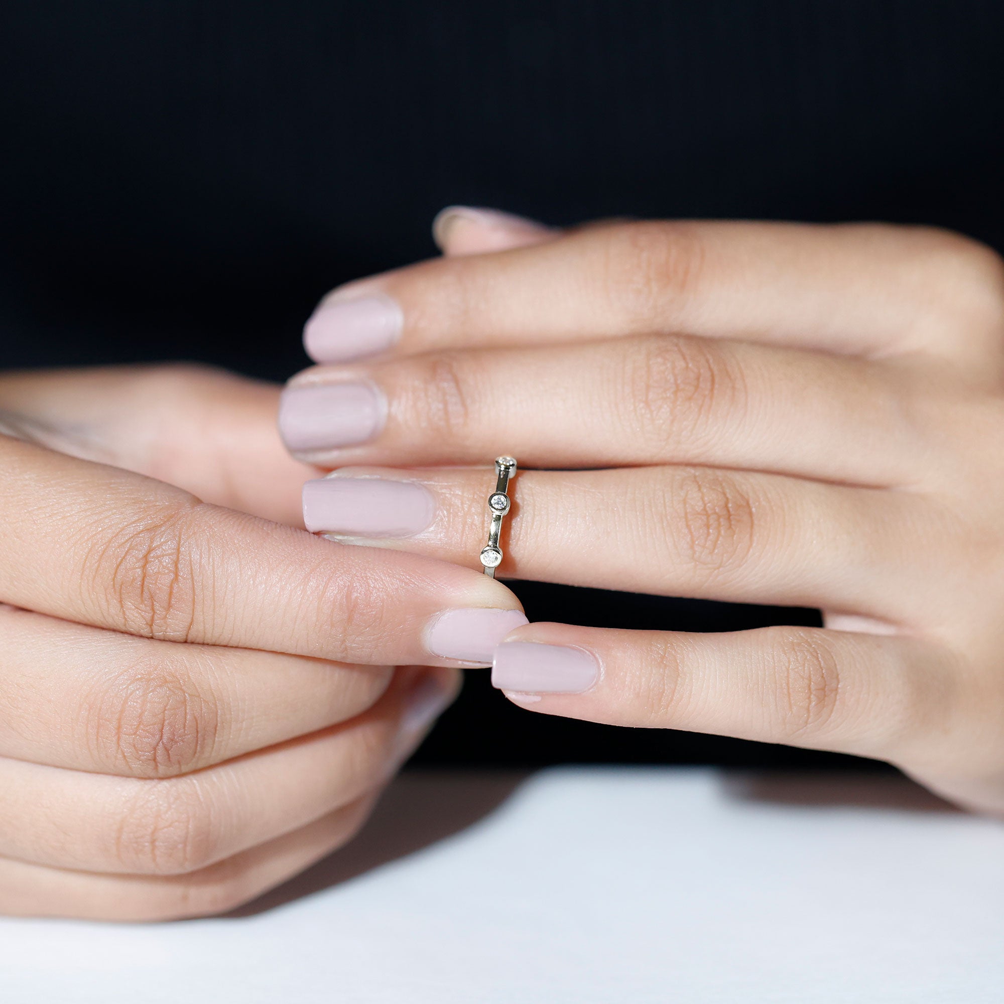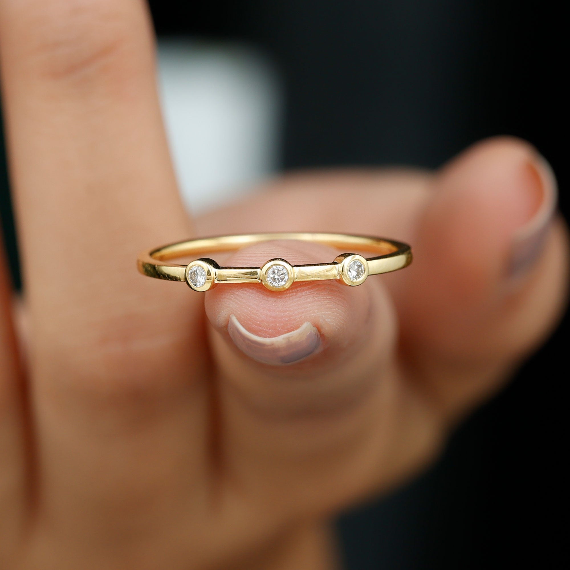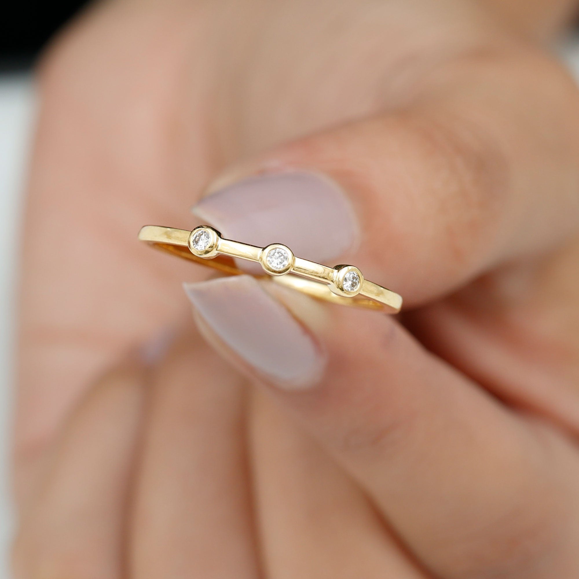 The stunning Three Stone Ring is an astonishing piece to accessorize with your attires embellished with Round Cut Moissanite uniquely set on the shank in bezel setting. Grab this Moissanite Stackable Ring for your special person on an important day.