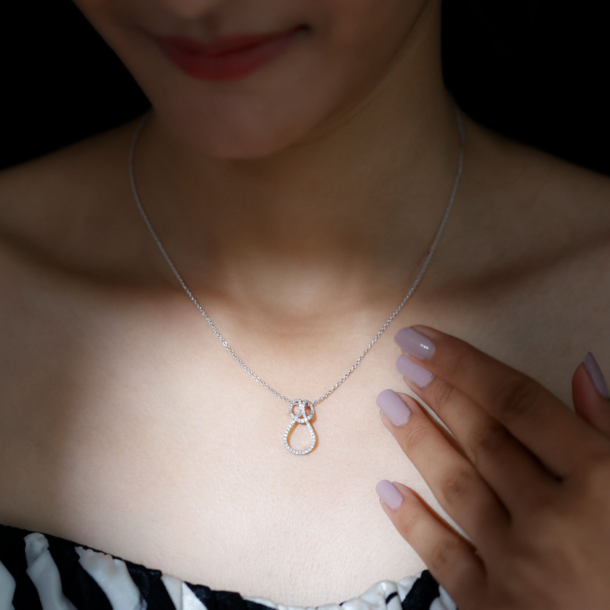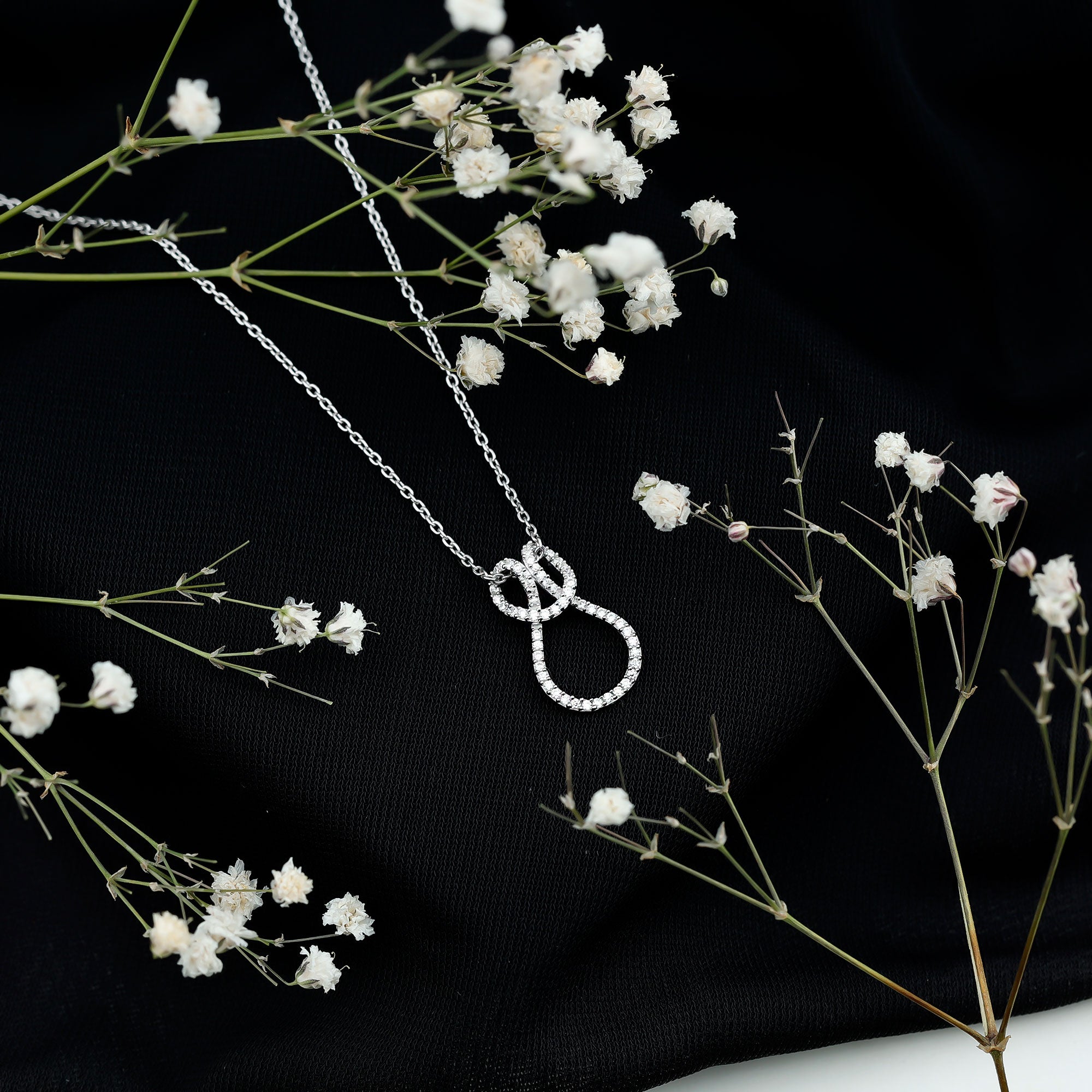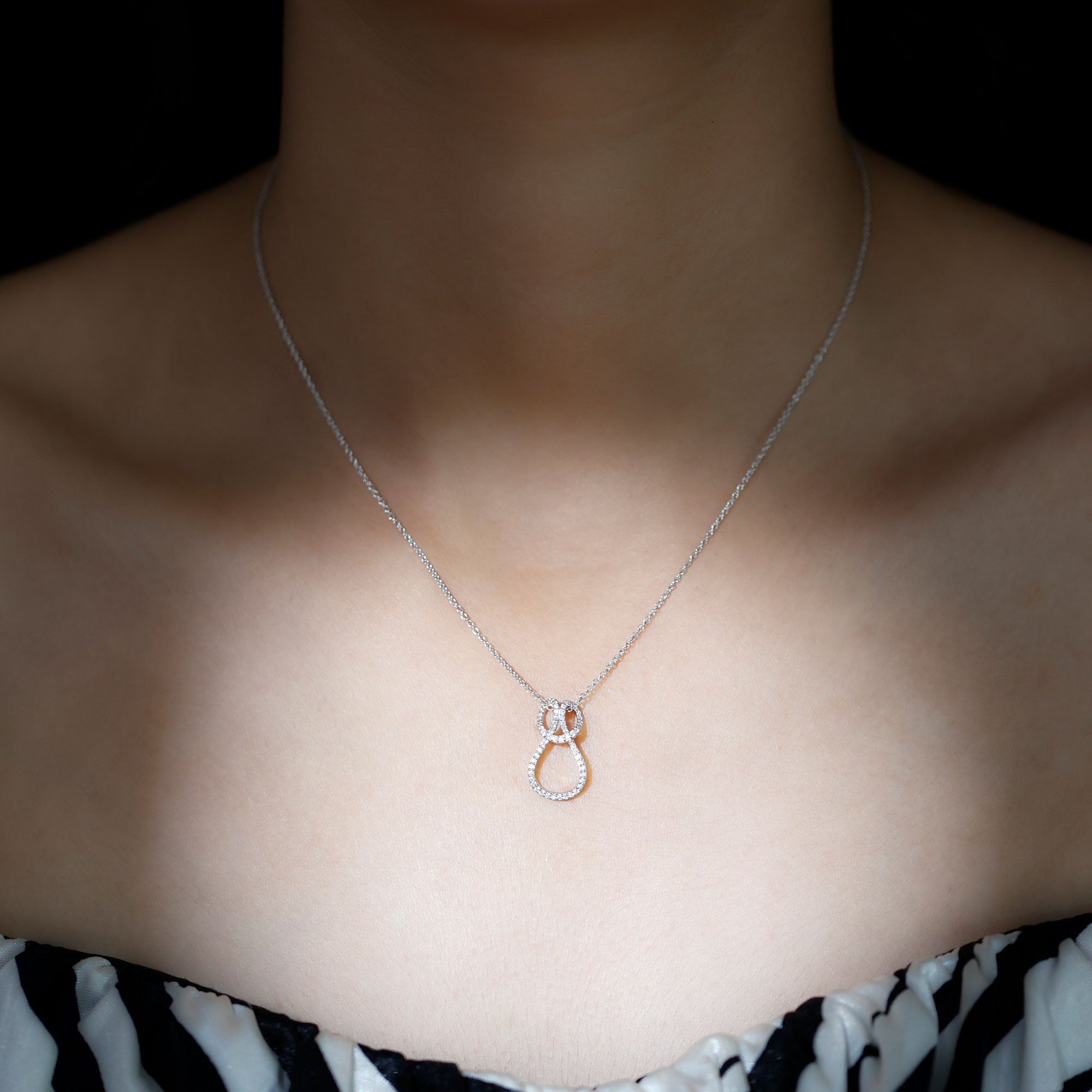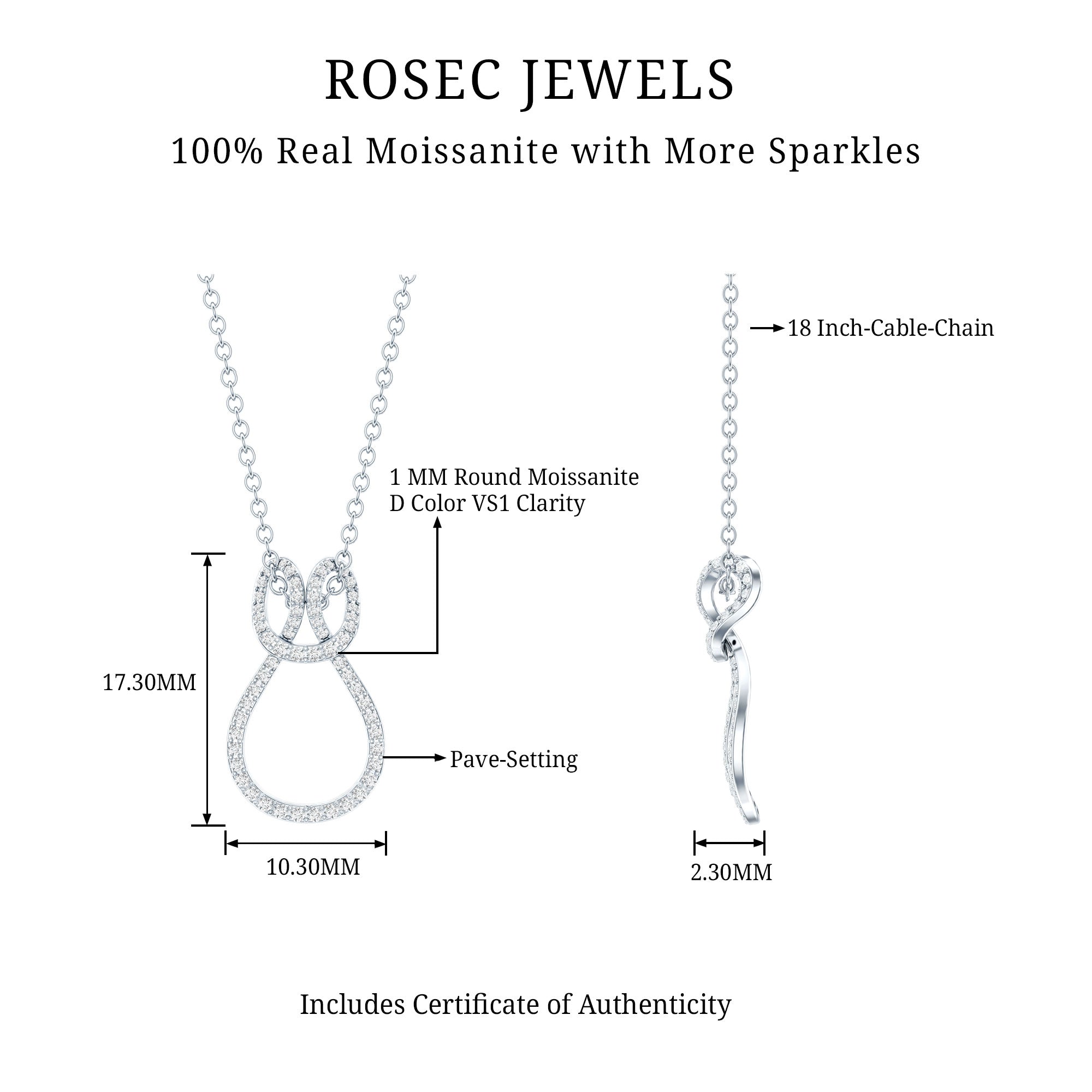 This Moissanite Love Pendant features a knot studded with smaller Moissanite, depicting the strength and power. The pendant is crafted with 14K White Gold Plated Silver, which is embedded with smaller Moissanite in Pave Setting. The D-VS1 Quality Moissanite reflects the timeless elegance and classic brilliance that adorns the neckline beautifully. This Infinity Pendant dangles in a sturdy cable chain and makes it perfectly sits on the neckline and completing the look for the special day. The infinity knot symbolizes eternity and forever, making it a delightful emblem of love, connection, and unity. Whether you are off to brunch, heading to work, or dressing up for a special night out, this Moissanite Pendant adds an elegant touch to any ensemble. Searching for a charming and considerate gift? This Moissanite Infinity Pendant is ideal for birthdays, anniversaries, Valentine’s Day, or simply as a surprise to show someone you care. It makes a wonderful present for your partner, wife, girlfriend, mom, sister, or any special woman in your life. This Love Knot Necklace comes exquisitely packaged in a jewelry box, ready for gifting and guaranteed to bring a huge smile the moment it is unwrapped.