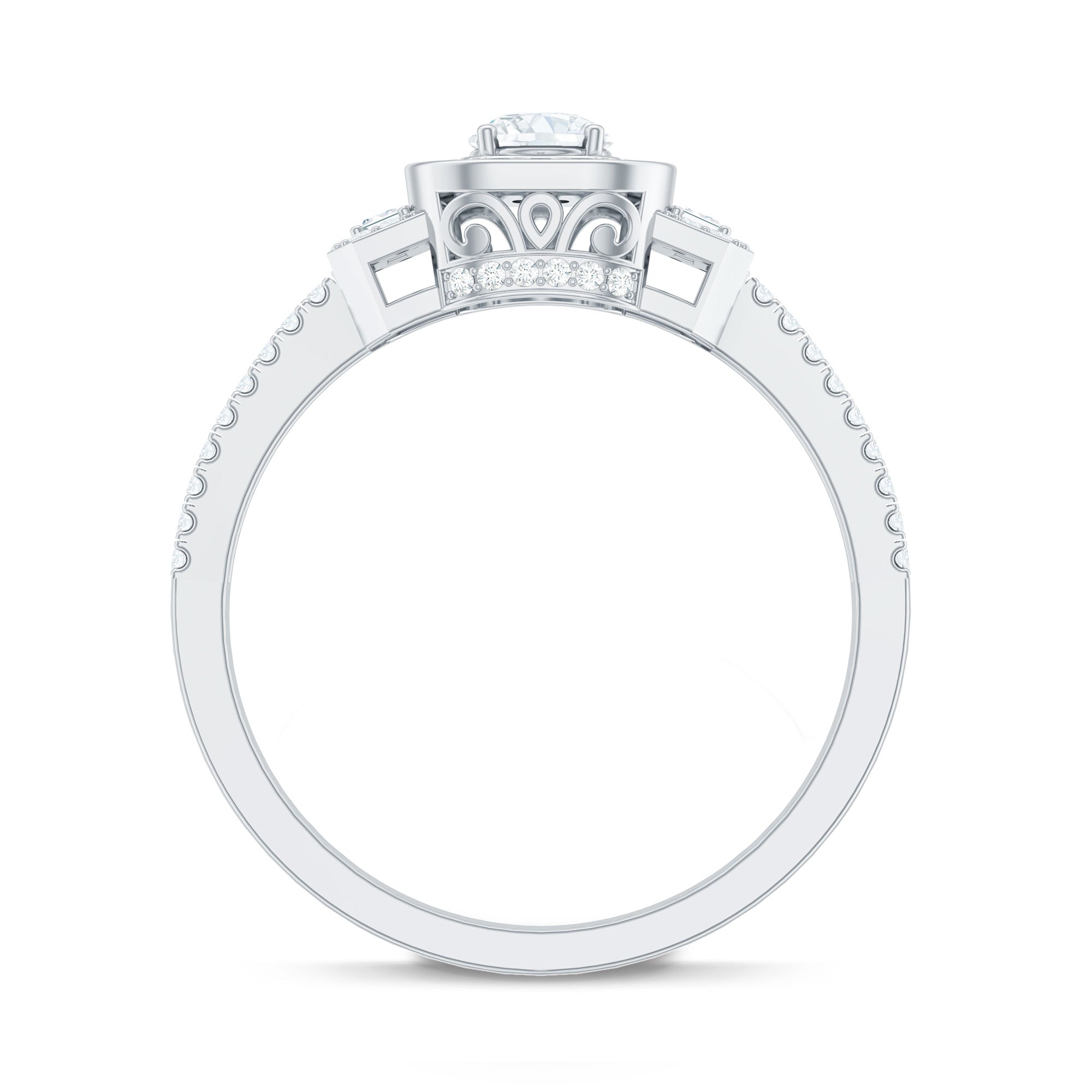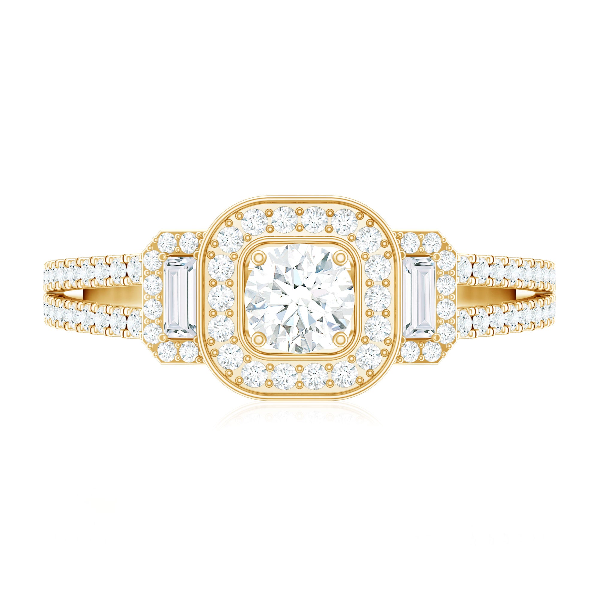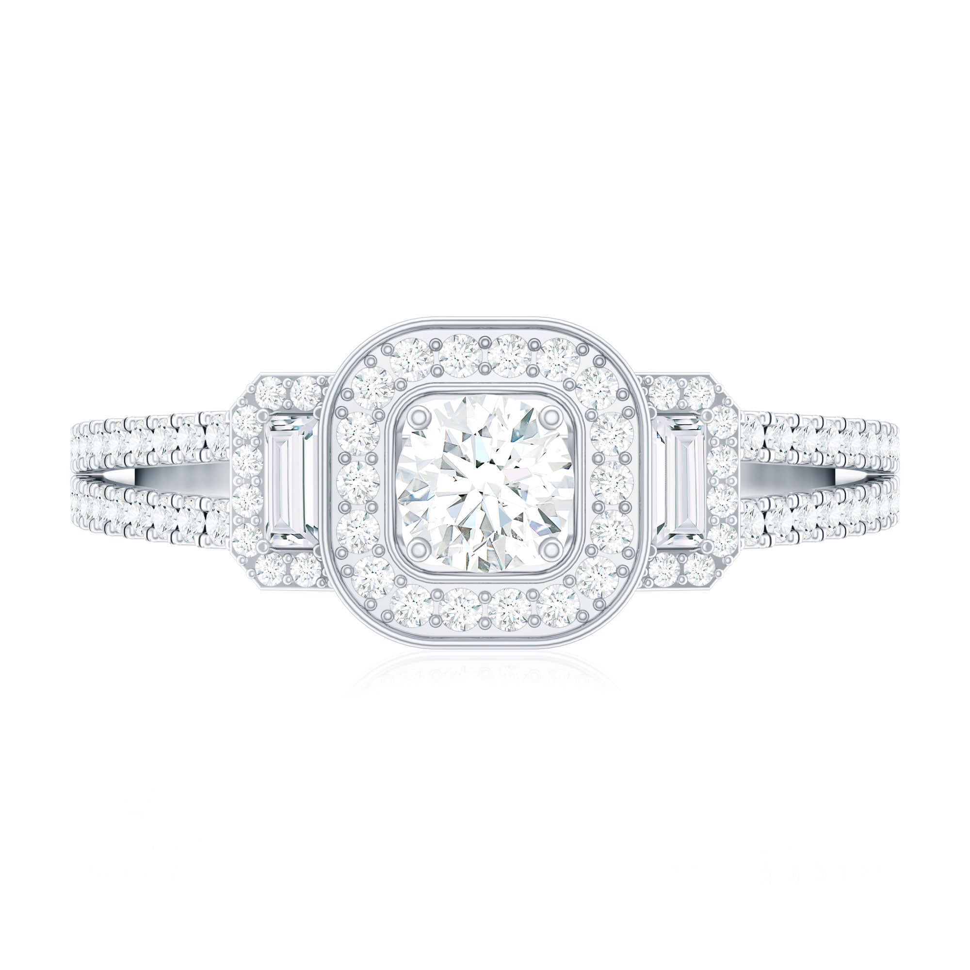 Surprise your lady with this stunning Moissanite Vintage Ring that features intricate details with a mesmerizing design. The ring features a 4 MM Moissanite securely placed at the center of the ring in Prong Setting. The center stone is encircled by a Halo of petite moissanites and Baguette Shape Moissanites are set on both the sides of center stone which embraces the look of the ring. The split shank of this Halo Moissanite Ring is embedded with the smaller Moissanites which gives a luxury look to the ring. This Split Shank Ring beholds the shine of D-VS1 quality Moissanites which makes it perfect to present on the special day.