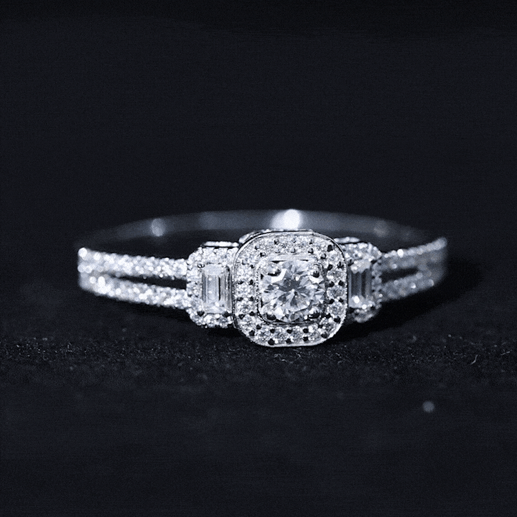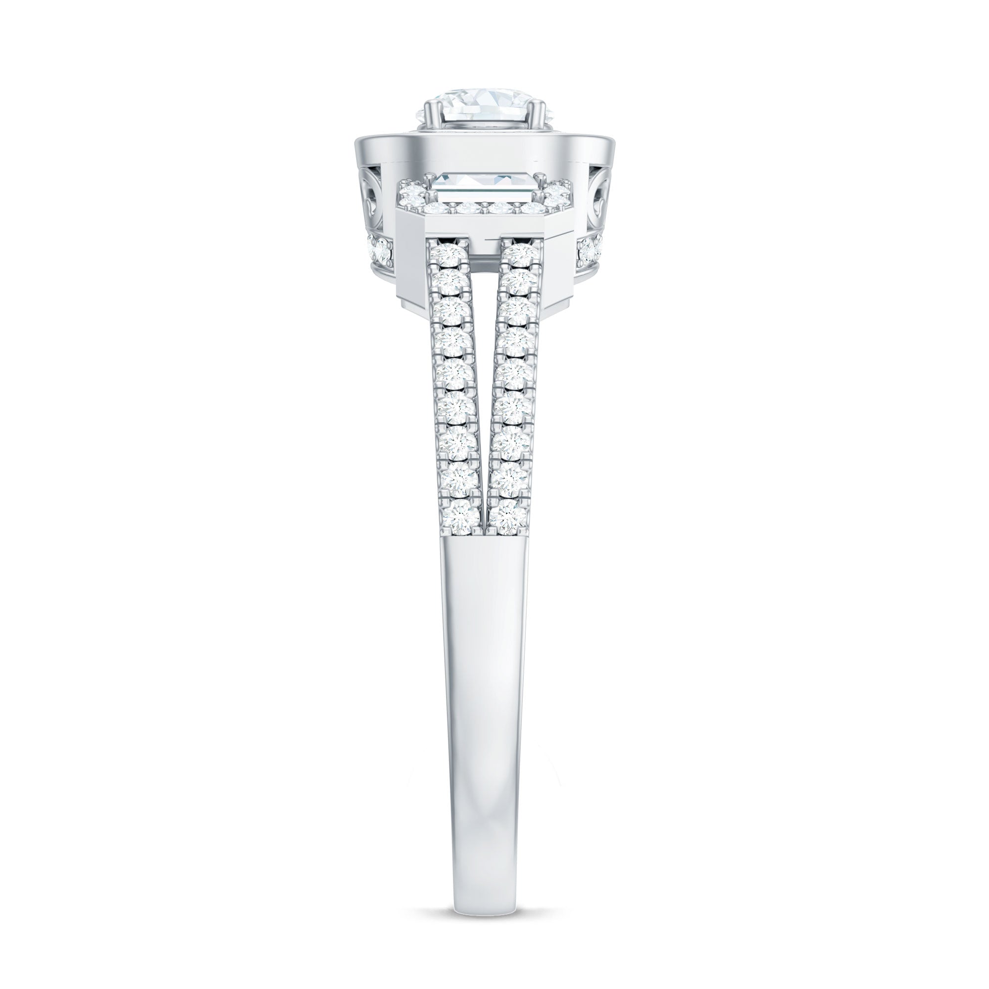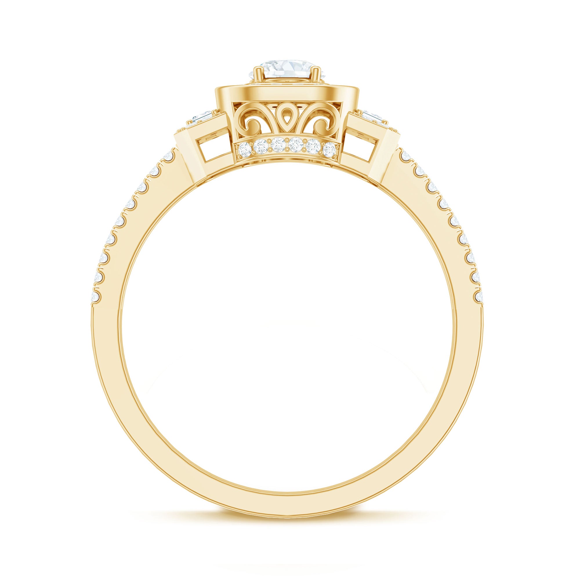 Surprise your lady with this stunning Moissanite Vintage Ring that features intricate details with a mesmerizing design. The ring features a 4 MM Moissanite securely placed at the center of the ring in Prong Setting. The center stone is encircled by a Halo of petite moissanites and Baguette Shape Moissanites are set on both the sides of center stone which embraces the look of the ring. The split shank of this Halo Moissanite Ring is embedded with the smaller Moissanites which gives a luxury look to the ring. This Split Shank Ring beholds the shine of D-VS1 quality Moissanites which makes it perfect to present on the special day.