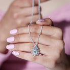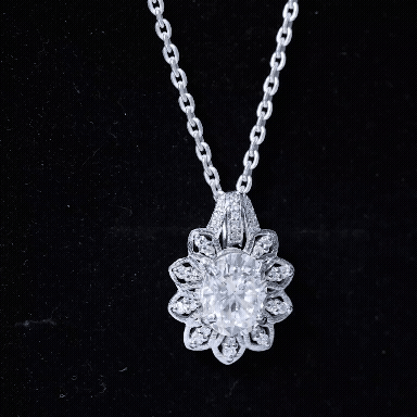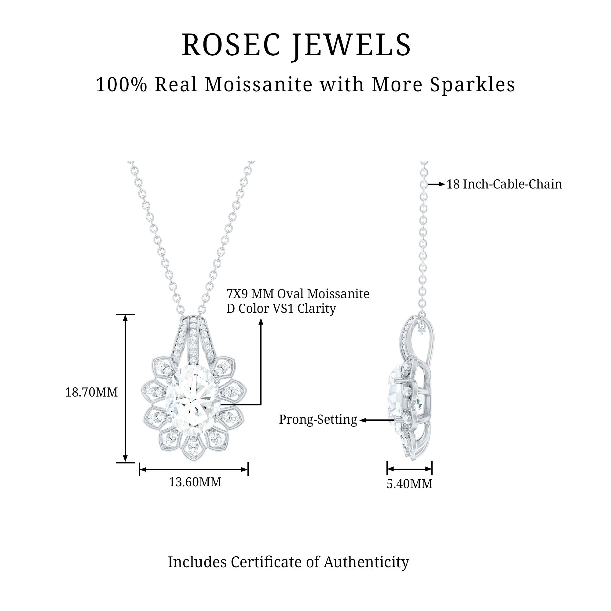 This stunning Art Deco Pendant made of 14K White Gold Plated Silver is just what you need to elevate your neckline for that special occasion. It features a gorgeous 7X9 MM Oval Moissanite stone held securely in prong setting, surrounded by intricate designs and smaller Moissanite stones that enhance its beauty. Drawing inspiration from the elegant vintage era, this pendant is truly eye-catching. The bail with three bars, adorned with sparkling stones, connects the Oval Shaped Necklace to a delicate cable chain. This Wedding Moissanite Pendant is the perfect finishing touch for your big day. Every detail of the necklace reflects superior craftsmanship, making it a perfect gift for milestones, celebrations, or simply as a treat for yourself. Evoke the elegance and glamour of a bygone era by making this perfect choice for the brides-to-be who love to wear the piece of jewelry that uniquely blends retro elements with a modern twist. The Moissanite has D Color VS1 Clarity grade with fiery brilliance. Enjoy a touch of timeless luxury with this Bridal Pendant Necklace, which comes beautifully packaged along with a certificate of authenticity.