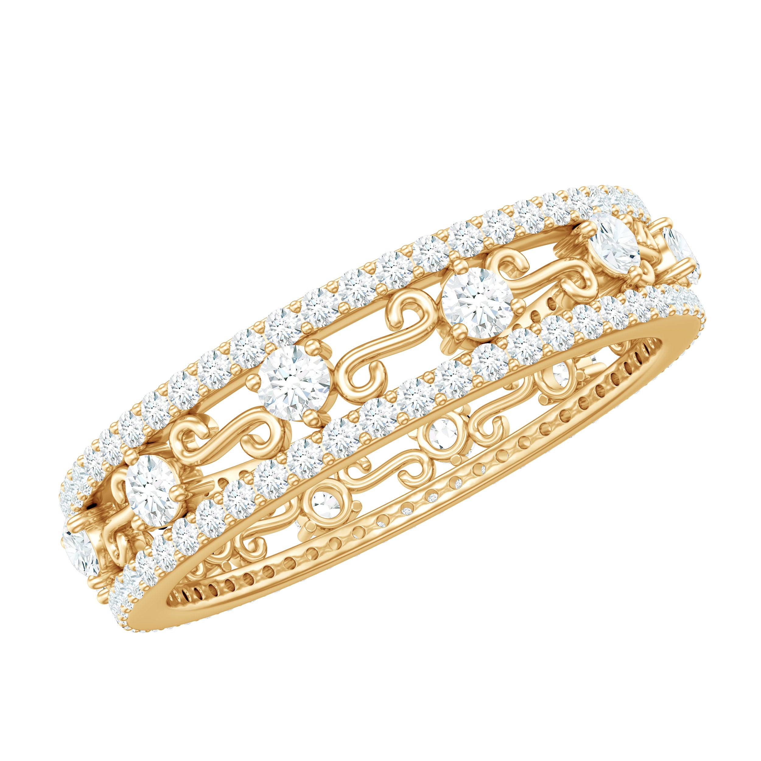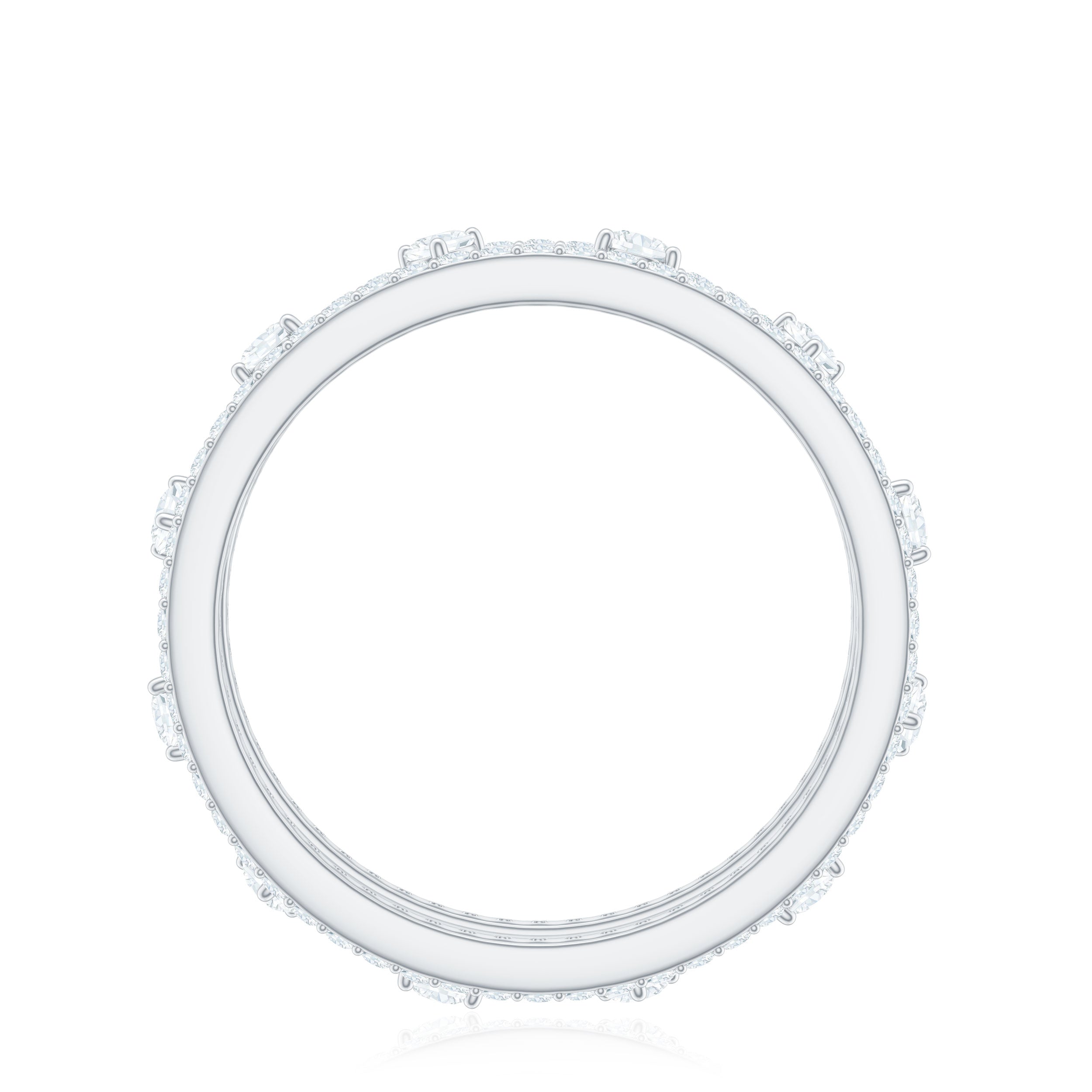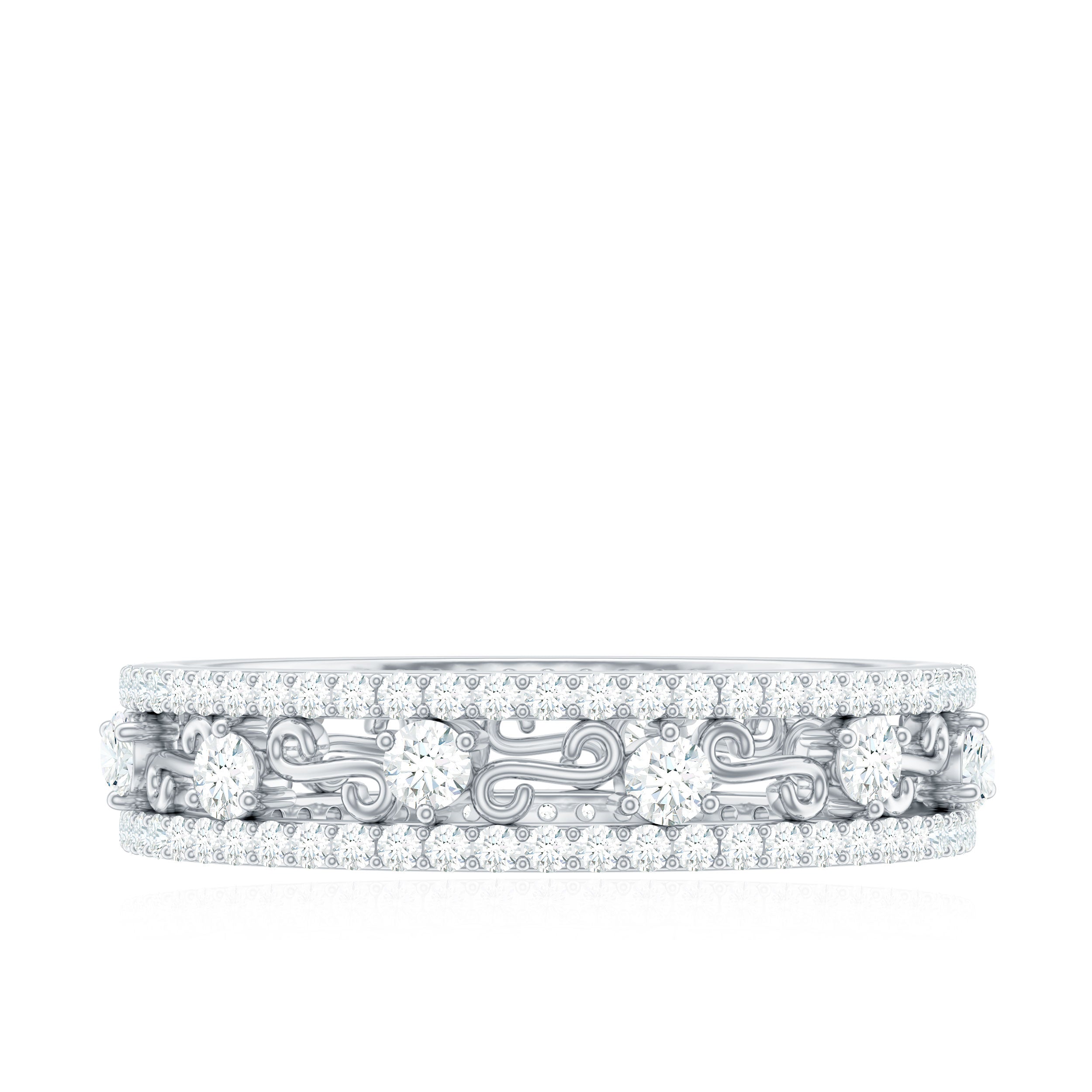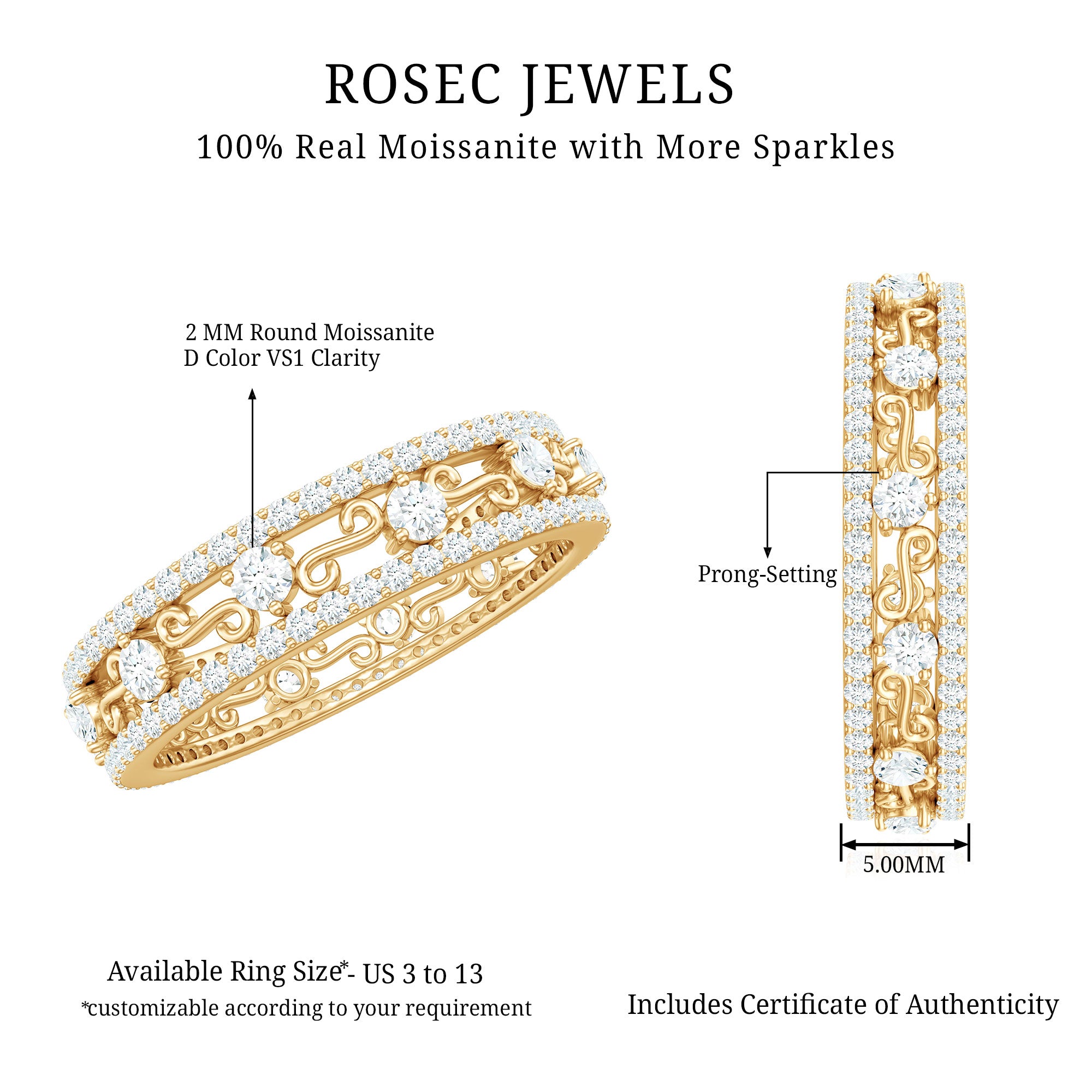 Amorous and graceful, this Wedding Band brings a soft, feminine allure to a timeless design. Featuring round shape moissanites, securely set in a prong setting that allows the stone to shine with extraordinary brilliance. This Minimal band ring is embraced with metal infinite style piece in an alternate pattern with moissanite, that adds a subtle but eye-catching sparkle. This Moissanite Wedding Band Ring is perfect for someone who values delicate details and distinctive craftsmanship since the infinite components provide a whimsical touch while still keeping a polished elegance. Crafted with care and kindness, this Moissanite Band Ring offers the brilliance of a diamond while being sustainable and budget-friendly. The band is designed for all day comfort, so it is perfect for everyday wear while still standing out during your most memorable moments.