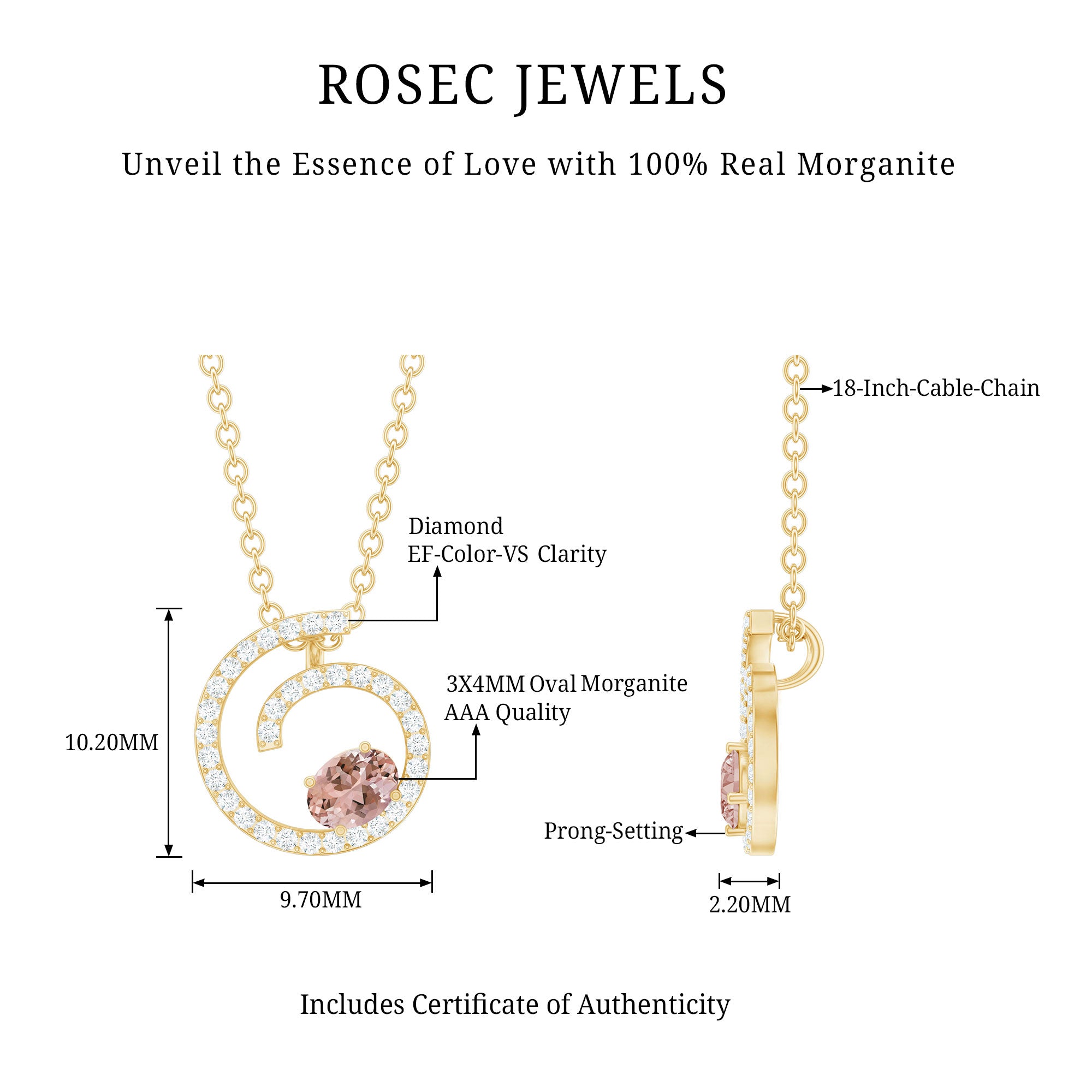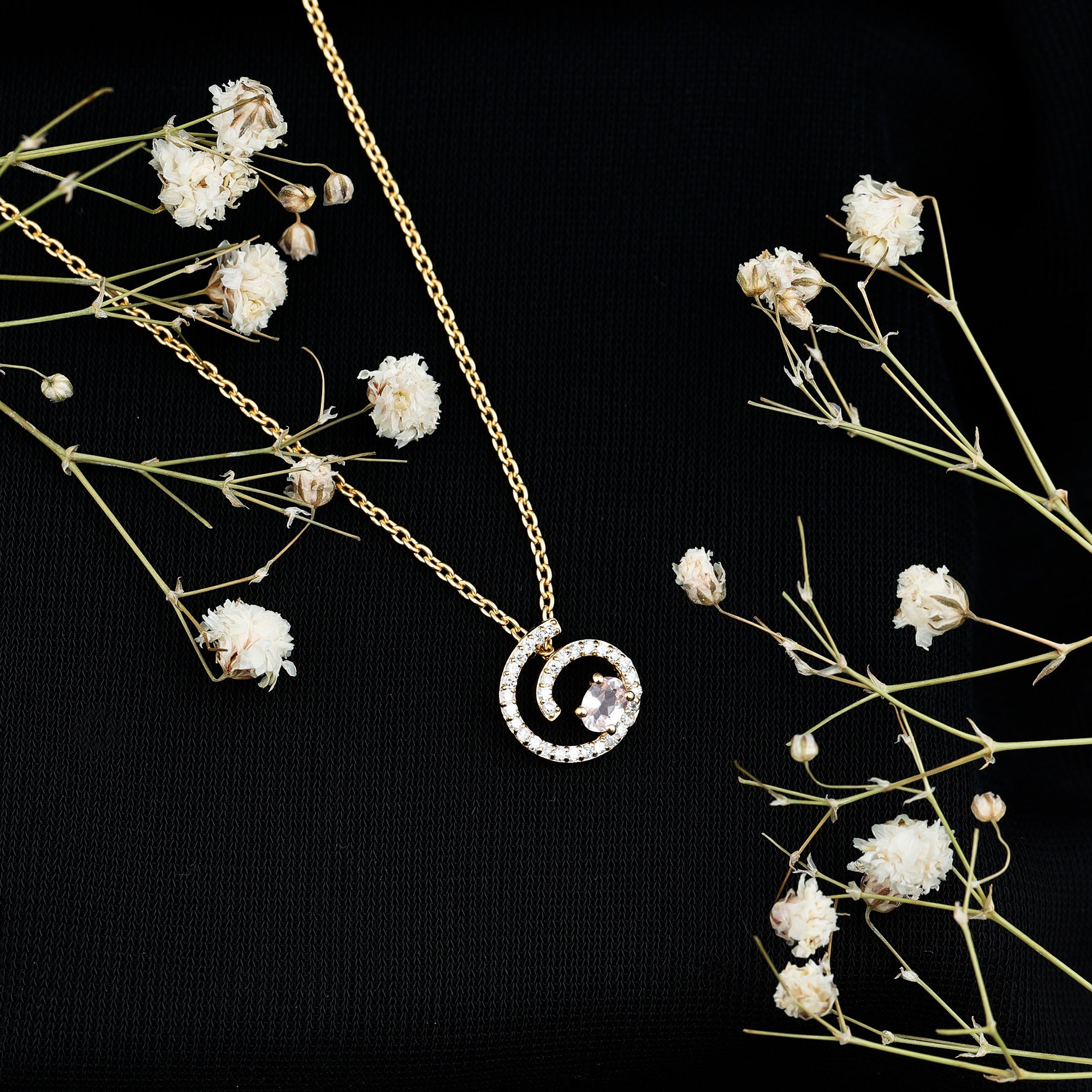 Let your style flow effortlessly with this beautifully crafted Swirl Pendant Necklace, designed to add a graceful touch to any look. Made in yellow gold plated silver, this Morganite and Diamond Necklace brings together thoughtful details and elegance in a design that is perfect for everyday wear or special moments. At the heart of the pendant is a 3X4 MM oval shaped AAA quality morganite, gently set in secure prong setting. It sits at the base of a sparkling swirl, perfectly lined by round lab grown diamonds that add subtle brilliance and movement to the design. The swirl shape creates a flowing pattern that feels modern yet timeless, just the right mix of simplicity and charm. What makes this Spiral Necklace even more special is the hidden bail at the back of the pendant. It keeps the focus entirely on the pendant itself, allowing the delicate design to shine without distraction. The Oval Morganite Necklace is attached to a sleek cable chain, comfortable to wear. The swirl design is a beautiful symbol of flow, continuity, and quiet strength, making this necklace not only a stylish accessory but also a meaningful one.