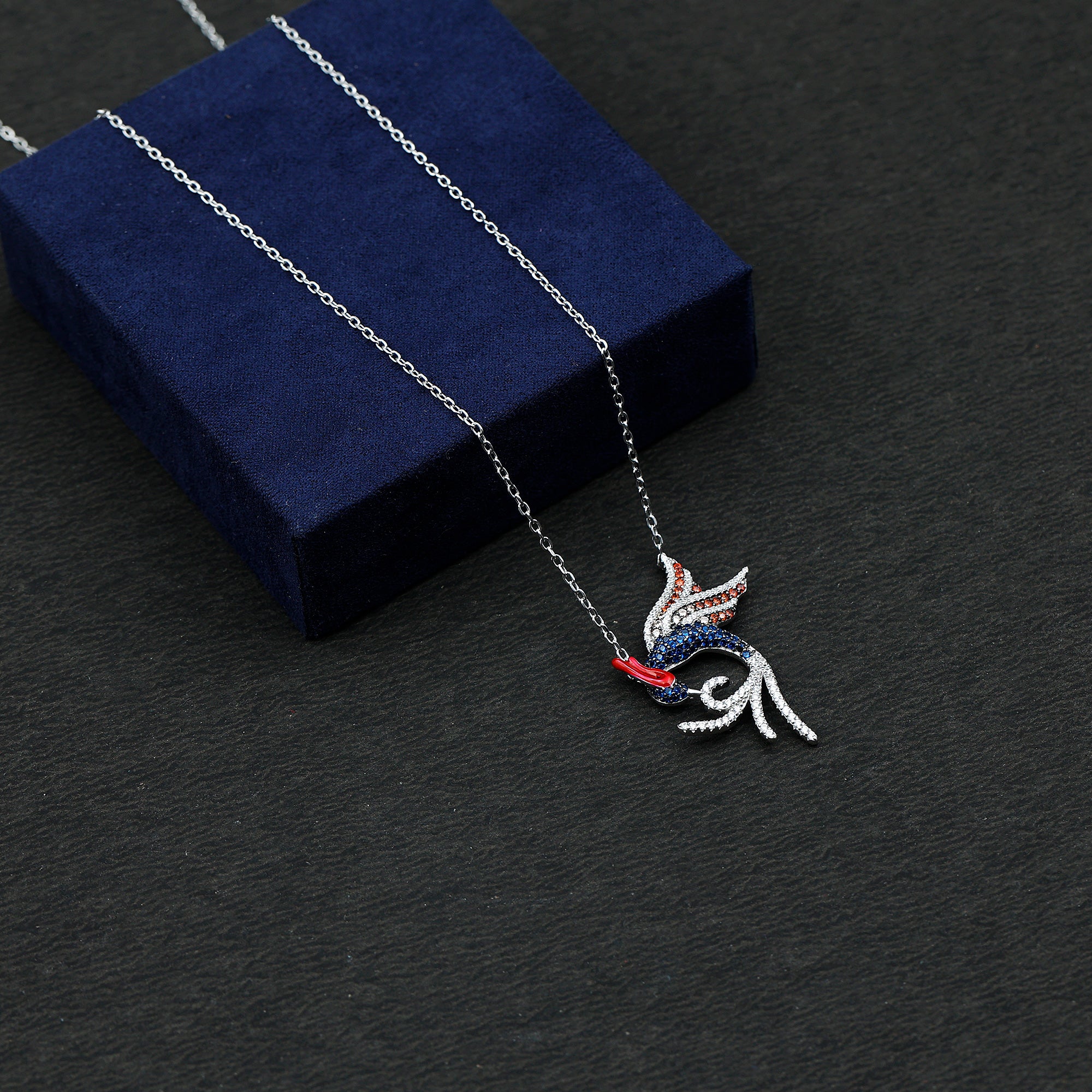 Get ready to ignite your style with this stunning Bird Necklace, a vibrant symbol of strength, renewal and fearless beauty. Crafted in gleaming 925 Sterling Silver, the phoenix design bursts to life with an array of radiant Lab Blue Sapphire, Lab Orange Sapphire, Lab Yellow Sapphire and Zircon stones, each one adding a unique splash of color that makes the piece feel bold, artistic and full of energy. The detailed wings and flowing shape create a captivating design that instantly draws attention, whether you are dressing up for a special occasion or elevating a simple everyday outfit. Pair it with a classic outfit or even a casual dress to give your look a touch of mystical charm and modern flair. Presented in an elegant jewelry box, this Multi Gemstone Necklace is ready to gift, making it a meaningful choice for birthdays, holidays, graduations or any moment when you want to celebrate someone’s inner fire. With its symbolic design and eye-catching sparkle, this Sterling Silver Bird Necklace is a statement of resilience, beauty and transformation, ready to become a treasured part of any collection.