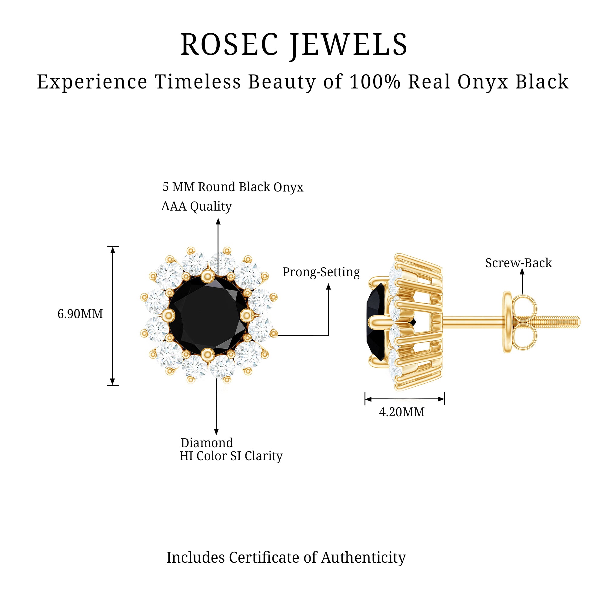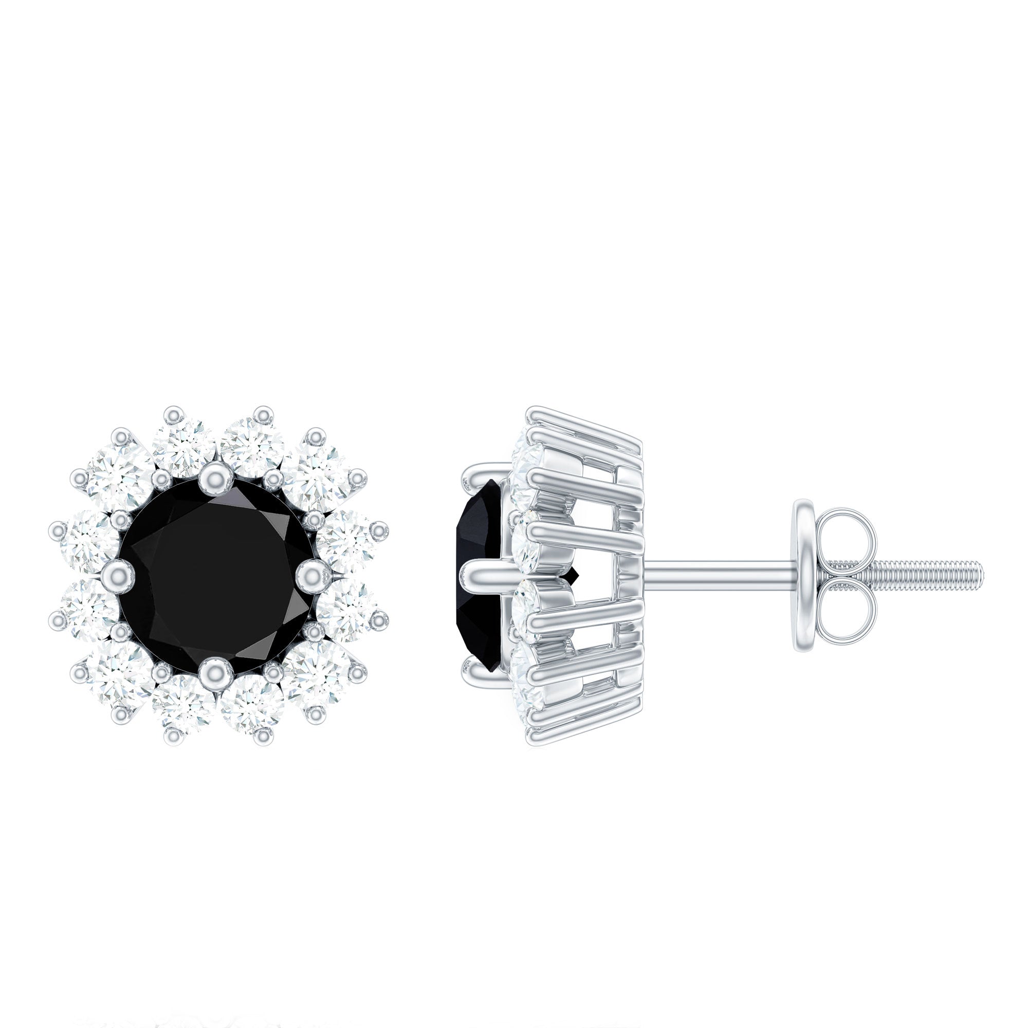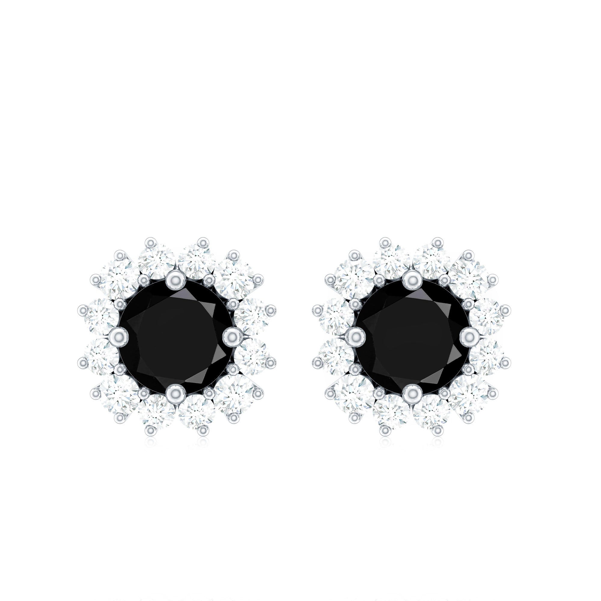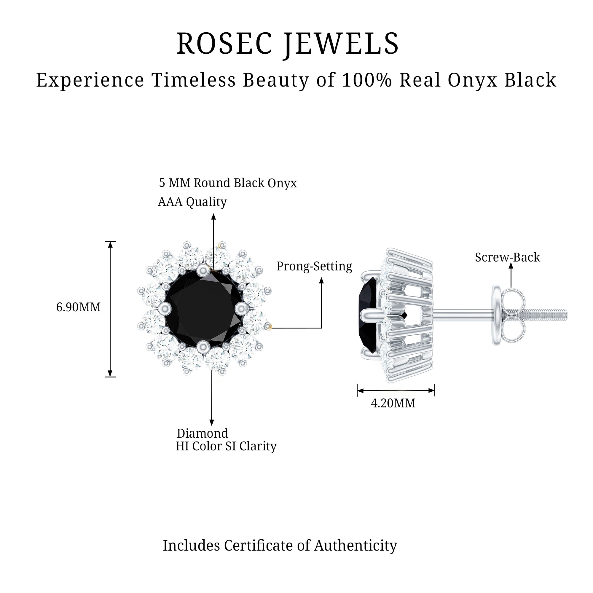 A stunning contrast of deep elegance and radiant sparkle, these Black Onyx Earrings bring timeless beauty to every moment. The rich 5 mm Round Shape Black Onyx at the center in Prong Setting exudes mystery and sophistication, while the surrounding Halo of dazzling Diamond stones adds the perfect touch of brilliance, creating a look that is both bold and refined. Crafted with precision and Secured with Screw Back Closure, these Black Onyx Diamond Earrings ensure comfort and confidence for all-day wear. Whether you are dressing up for a special event or adding a polished finish to your everyday style, these Black Onyx Studs effortlessly elevate any outfit with their classic charm. Thoughtfully packaged in a signature jewelry box, these Black and White Earrings are ready to gift and sure to make a lasting impression. The harmonious blend of dark AAA Quality Black Onyx and sparkling HI-SI Diamond stones symbolizes strength, balance and eternal love, making them a meaningful gift for someone special or a well-deserved treat for yourself.