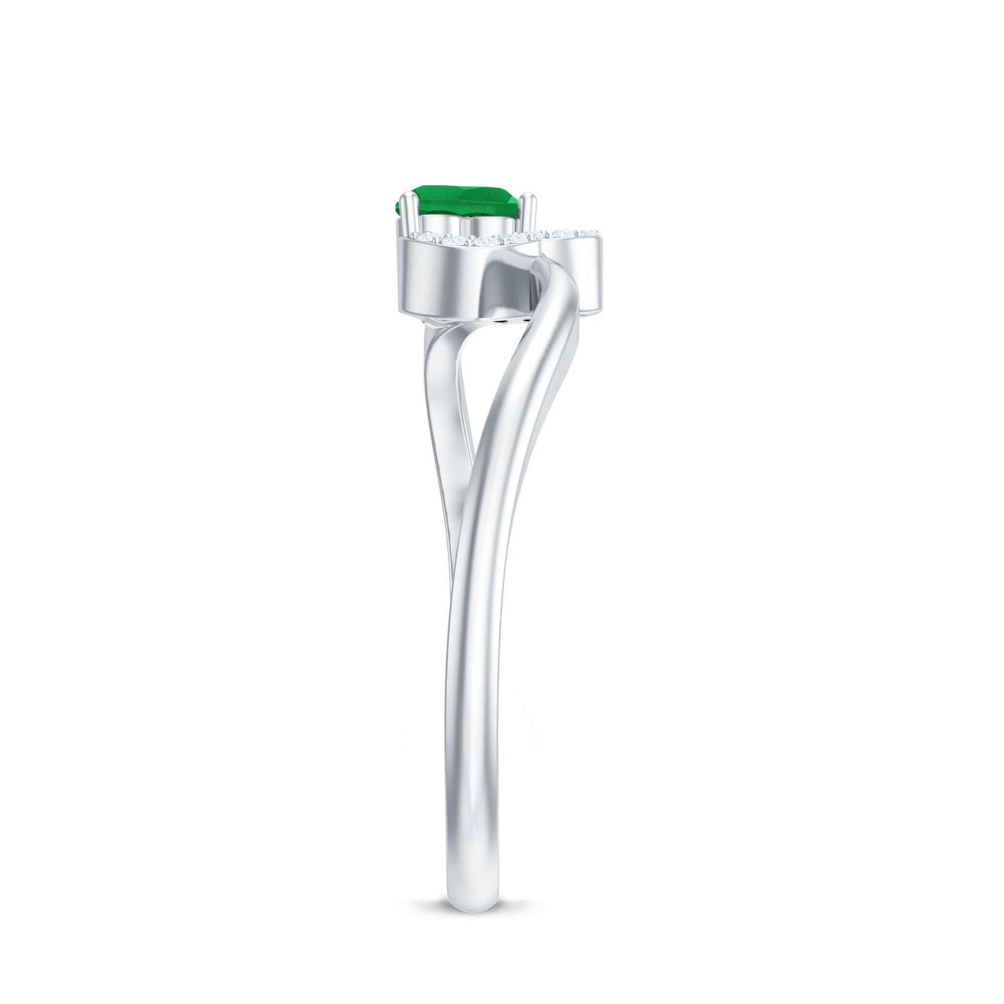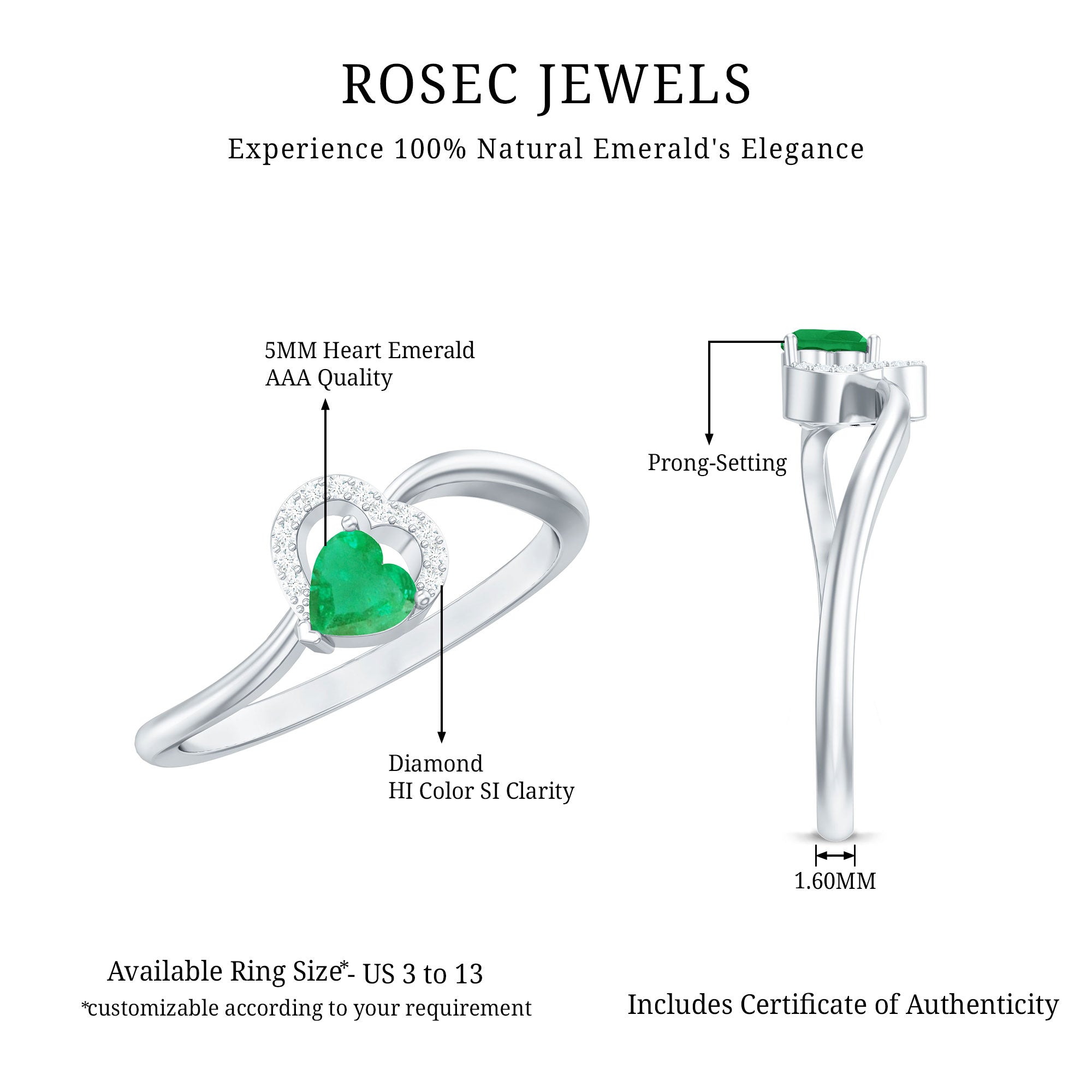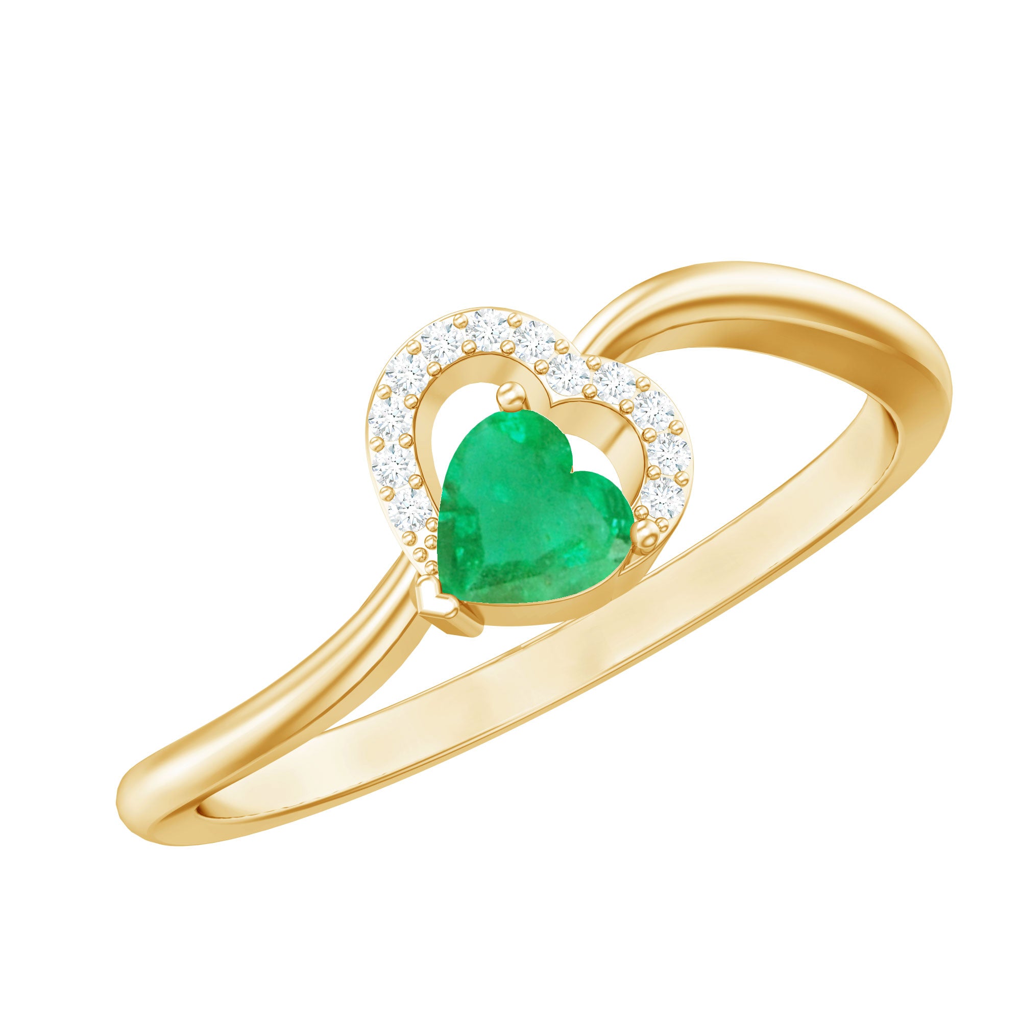 Ignite a spark of everlasting affection with this Heart Promise Ring, a delicate celebration of love in its most heartfelt form. At the center is a horizontally set 5 mm Heart Shape Emerald in Prong Setting, its vibrant green glow capturing the depth of true devotion. Encircling the AAA Quality Emerald, a shimmering heart shaped frame of Diamond stones adds a touch of brilliance, reflecting the endless light that love brings into our lives. The gracefully Curved Band creates a flowing design that symbolizes two hearts intertwined in perfect harmony. This enchanting Emerald Heart Ring is a promise and a keepsake of shared moments that last a lifetime. Whether given as a token of love, a meaningful gift or a romantic gesture to mark a special occasion, this Emerald Proposal Ring carries a message of eternal devotion. Presented in a signature jewelry box and available in multiple sizes, this Emerald Diamond Ring is designed to be treasured, worn and admired. With every glance, this Commitment Ring for Her whispers a story of romance and a love that grows brighter and more beautiful with each passing day.