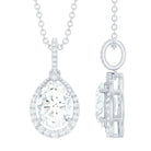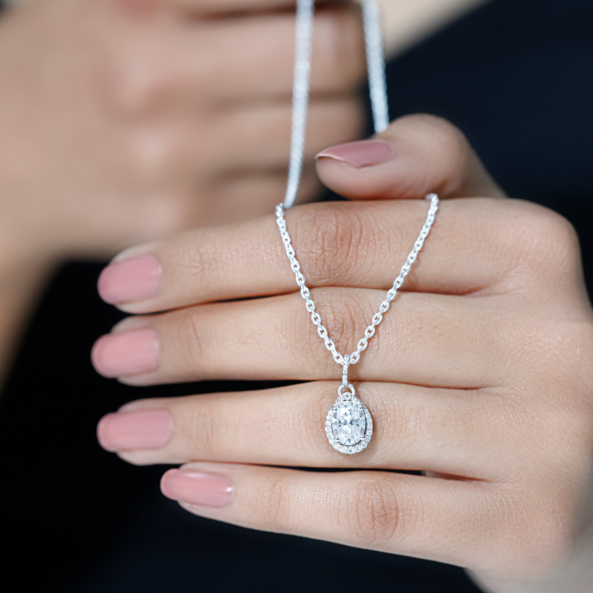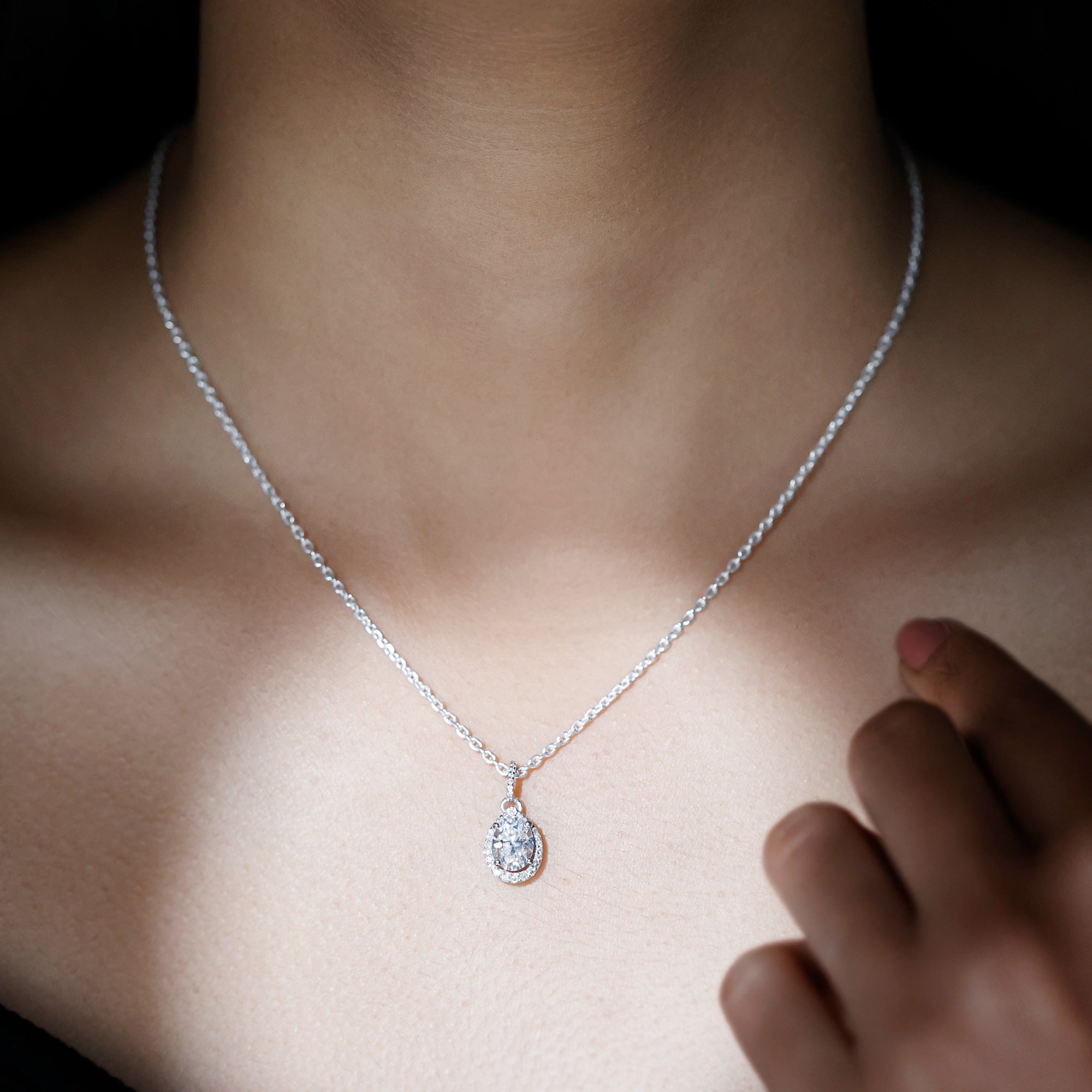 Enhance your casual or formal attire with this exquisite Moissanite Teardrop Necklace. Crafted from 14K white gold plated silver, this stunning piece showcases a 6X8 MM oval moissanite encased in a teardrop-shaped frame adorned with round moissanites. With its D Color VS1 Clarity stones and brilliant polished finish, this Oval Cut Pendant hangs gracefully from a cable chain secured by a lobster clasp. Elegant yet striking, it features a gemstone-studded bail that adds to its charm. Wear this Bride Necklace for Wedding with confidence and let it catch the light, captivating everyone around you. Transform any outfit with this unique accessory. Win her affection with this stunning Moissanite Necklace that elevates her fashion game. Transform classic beauty by highlighting everlasting sophistication with this pendant, a striking jewelry piece that radiates sparkle and style.