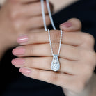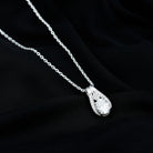 When the moment is once in a lifetime, your jewelry should be too - add that unforgettable sparkle to your big day with this enchanting Moissanite Drop Necklace. It features a 7X9 MM oval shaped moissanite in the center set in prong setting, surrounded by a beautifully sculpted teardrop frame, lined with shimmering round cut stones. Handcrafted in 14k white gold plated sterling silver, this Bride Necklace for Wedding hangs from a cable chain with a secure lobster clasp for easy length adjustment. Timeless with a modern touch, this Teardrop Necklace completes your wedding look with sophistication and grace.
