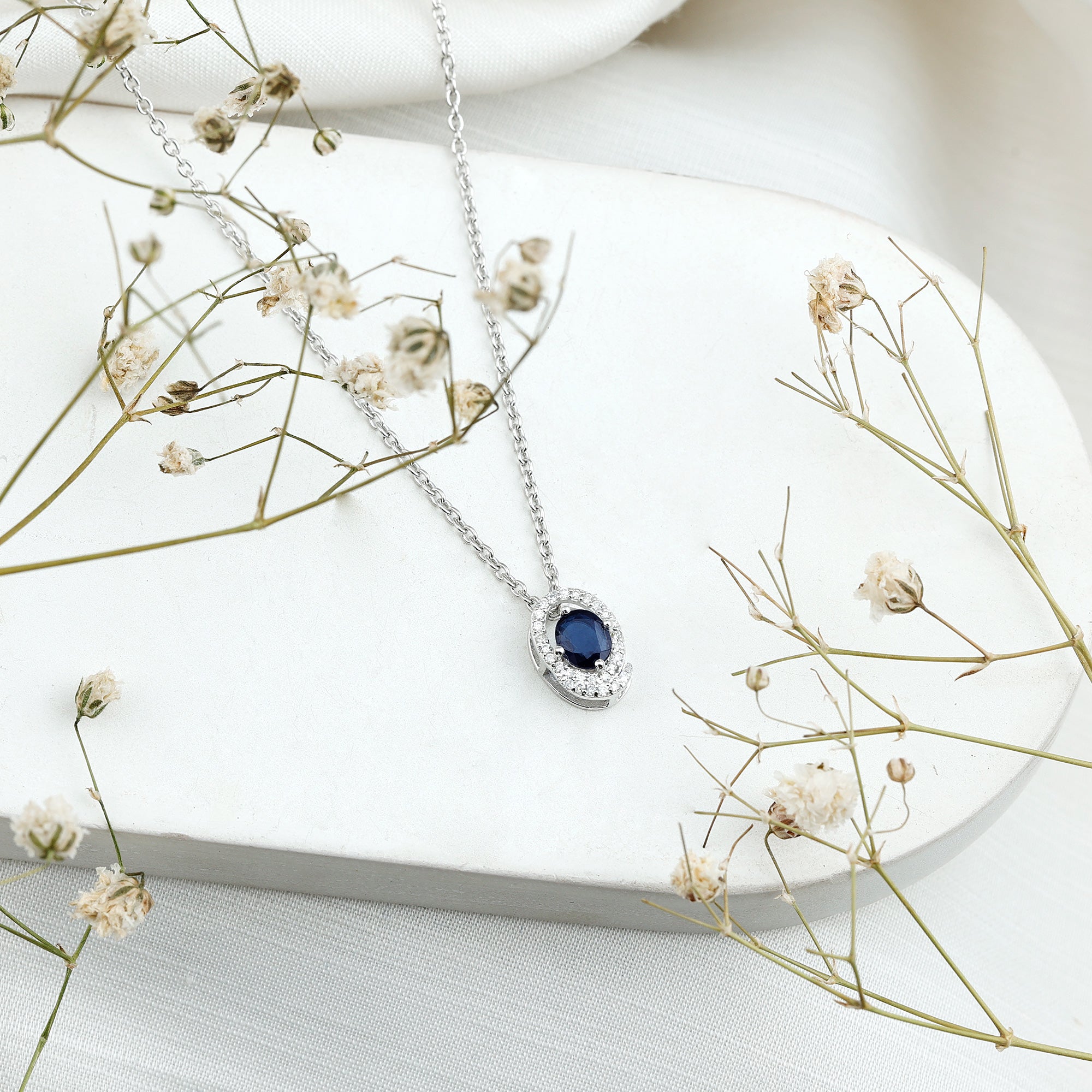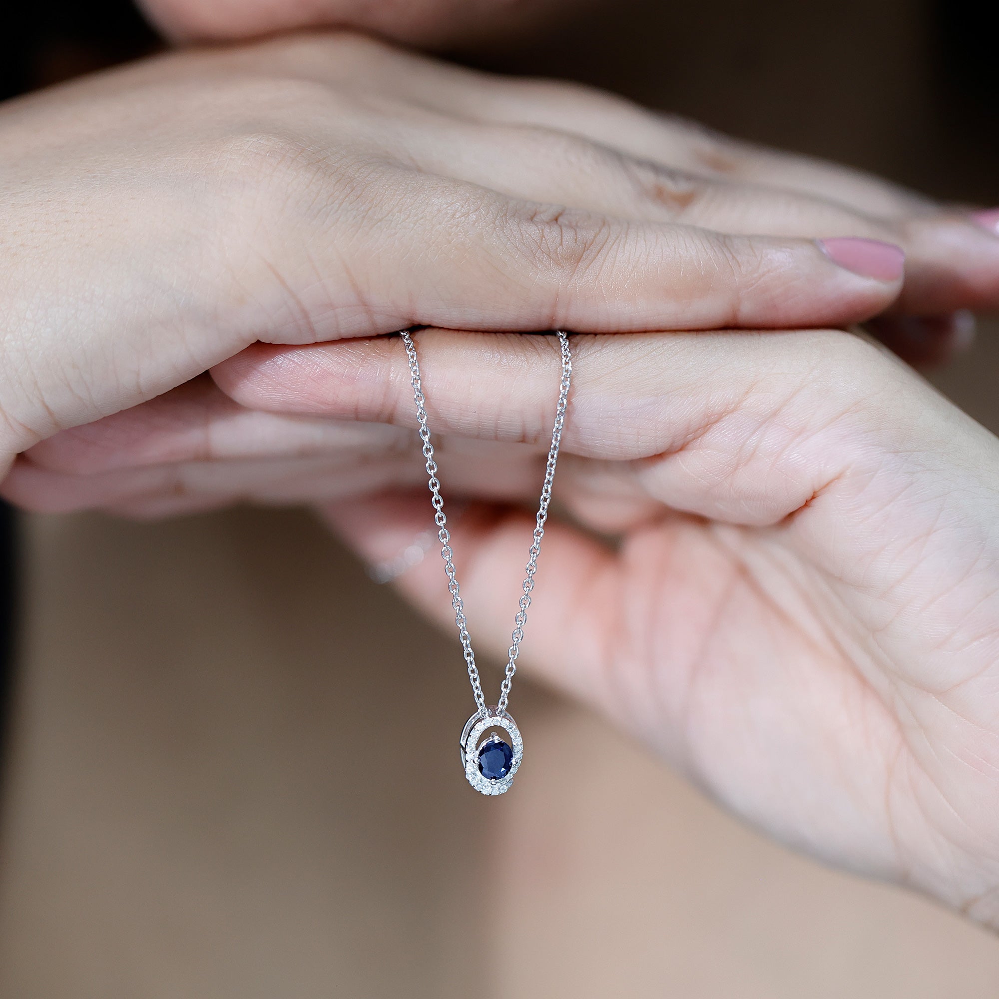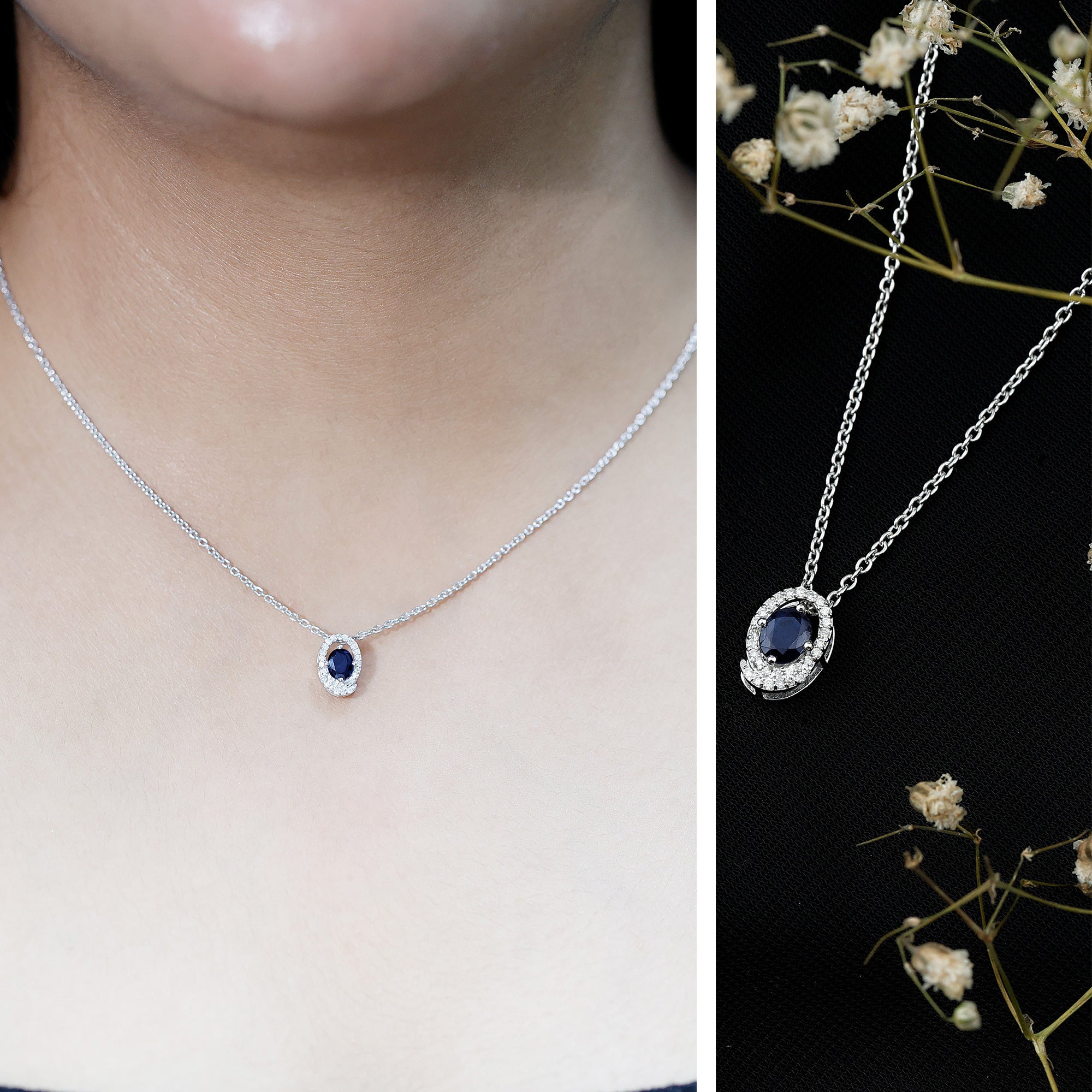 Elevate your elegance with this stunning Blue Sapphire Pendant, a perfect blend of sophistication and timeless beauty. The dazzling 4X5 mm Oval Shape Blue Sapphire of AAA Quality, renowned as the stone of royalty, is beautifully set in an Open Oval Shaped frame lined with shimmering Lab Grown Diamond stones, creating a captivating contrast that draws every eye. The deep blue hue of the Sapphire symbolizes wisdom and loyalty, making it a meaningful and regal addition to your jewelry collection. Beyond its breathtaking appearance, the Blue Sapphire is believed to promote mental clarity, emotional balance, and calming energy, ideal for those seeking both beauty and positive vibes. This Blue Sapphire Diamond Necklace hangs gracefully from a delicate chain, offering a versatile piece that complements any special occasion, from weddings and anniversaries to elegant parties or formal events. Presented in an elegant signature jewelry box, this Real Sapphire Pendant is ready to gift or keep as a cherished personal treasure. Whether worn as a statement piece or layered with other accessories, this Sapphire Blue Necklace brings an air of royalty and positive energy, making every moment shine a little brighter.