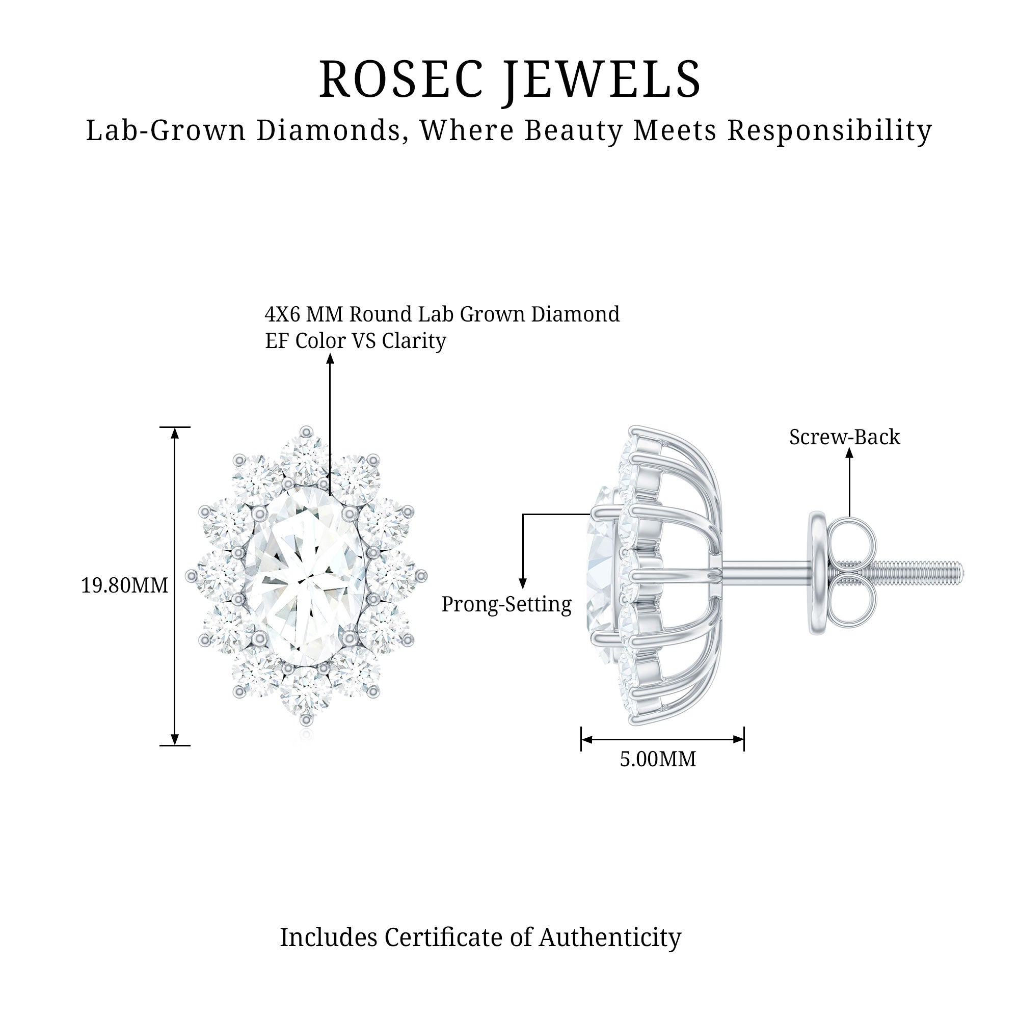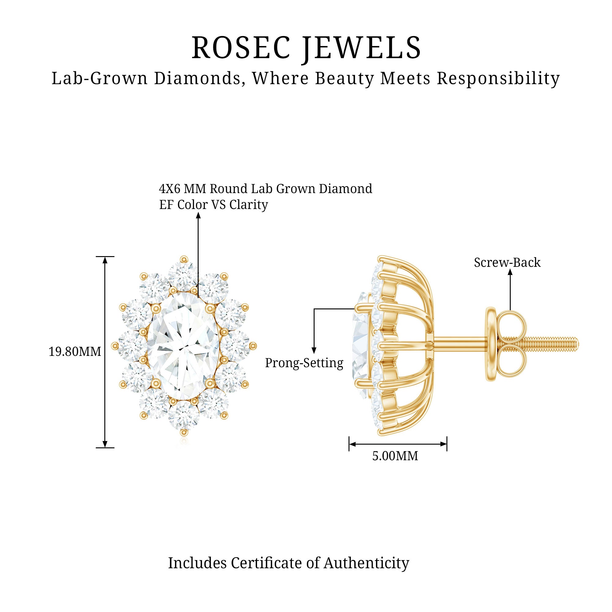 Make the occasion sparkling with this Oval Diamond Studs handcrafted by Rosec Jewels. These Statement Studs are featured with 4x6MM Oval Shape Lab Grown Diamond in the center, encircled with the petite Round Diamond Halo. This Screw Back Earrings holds EF-VS Quality Diamonds making it dazzling in the crowd. The Screw Back Closure of these earrings ensures to keep on the place throughout. These Halo Diamond Earrings are perfect to be gifted on your anniversary to your lady love. These Diamond Studs Earrings will delivered to you in the Premium Quality Gift Box.
