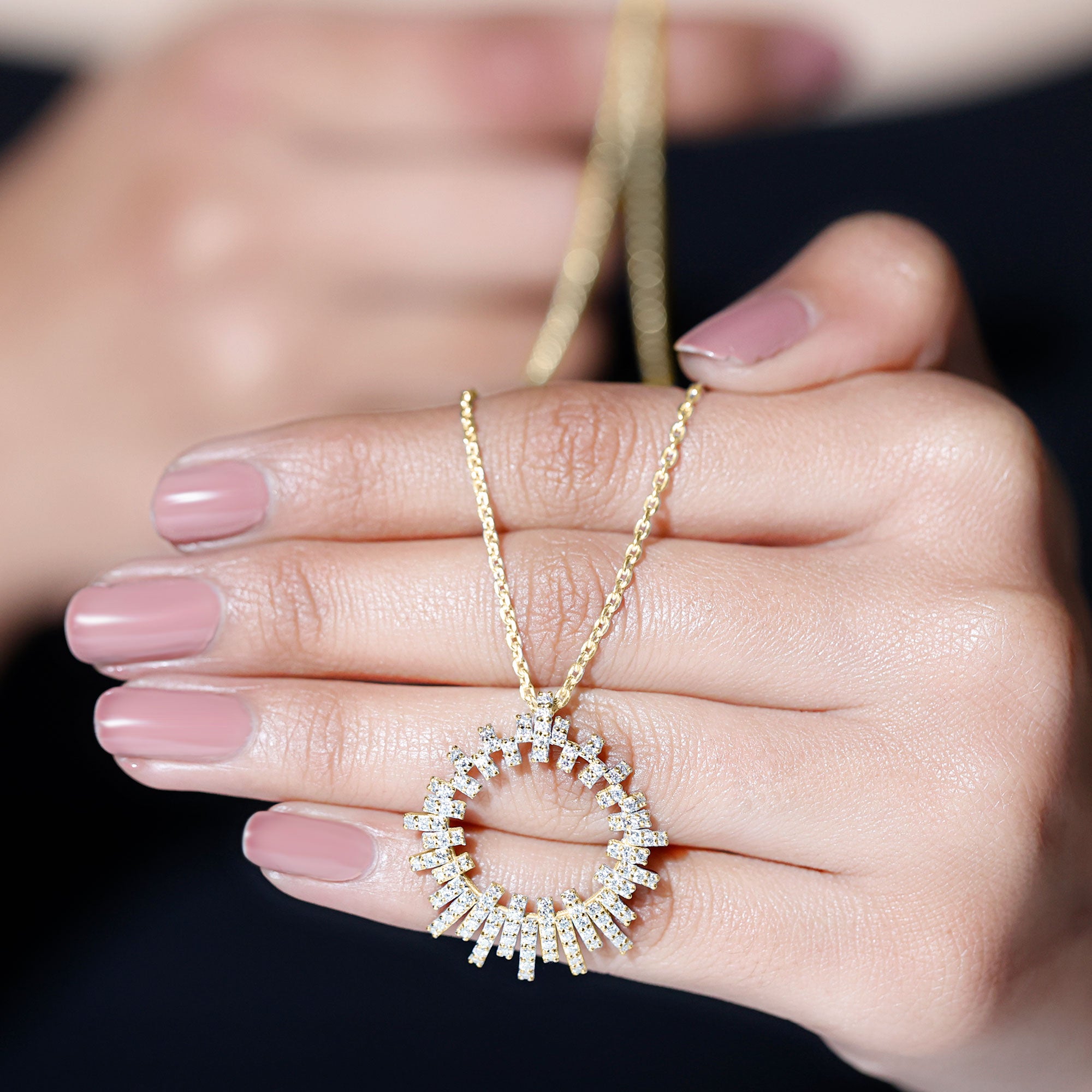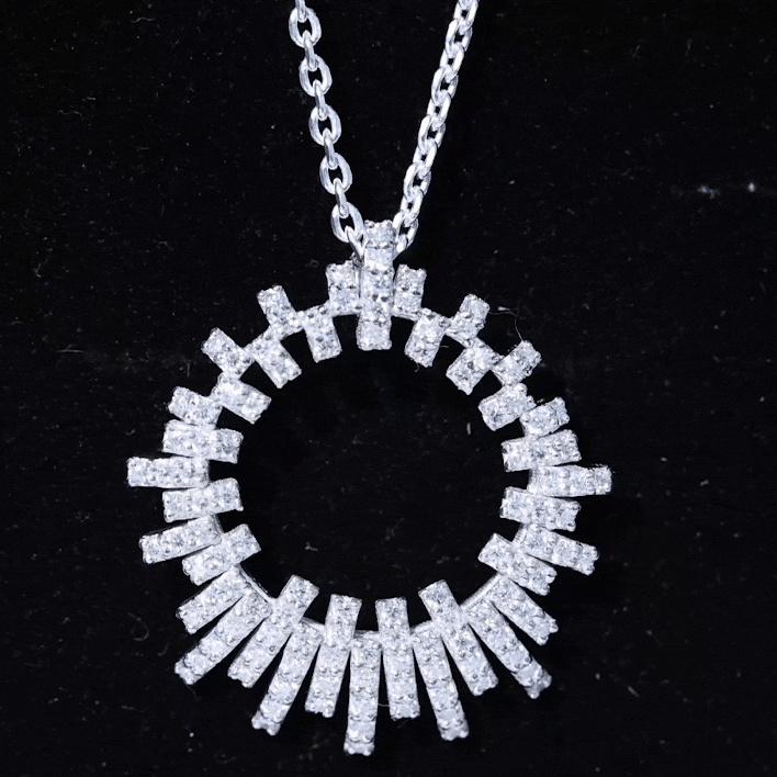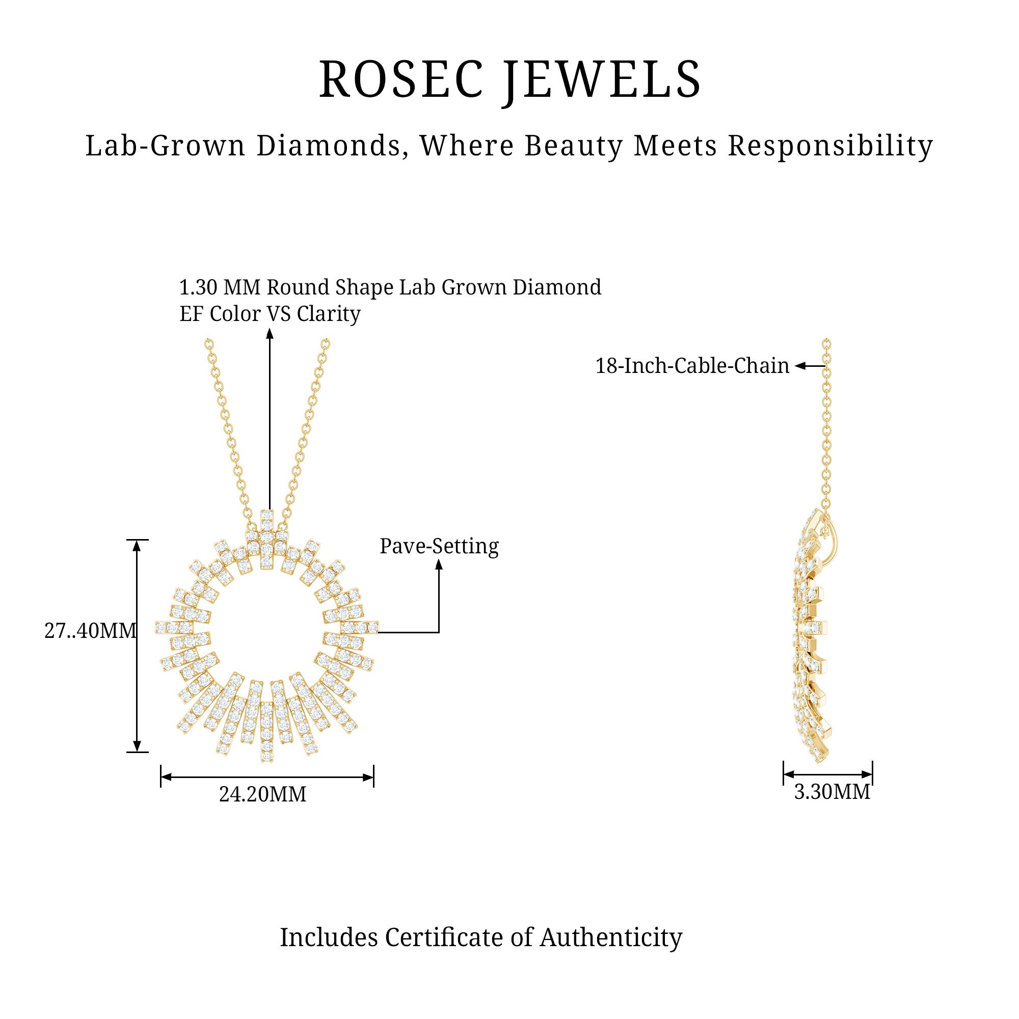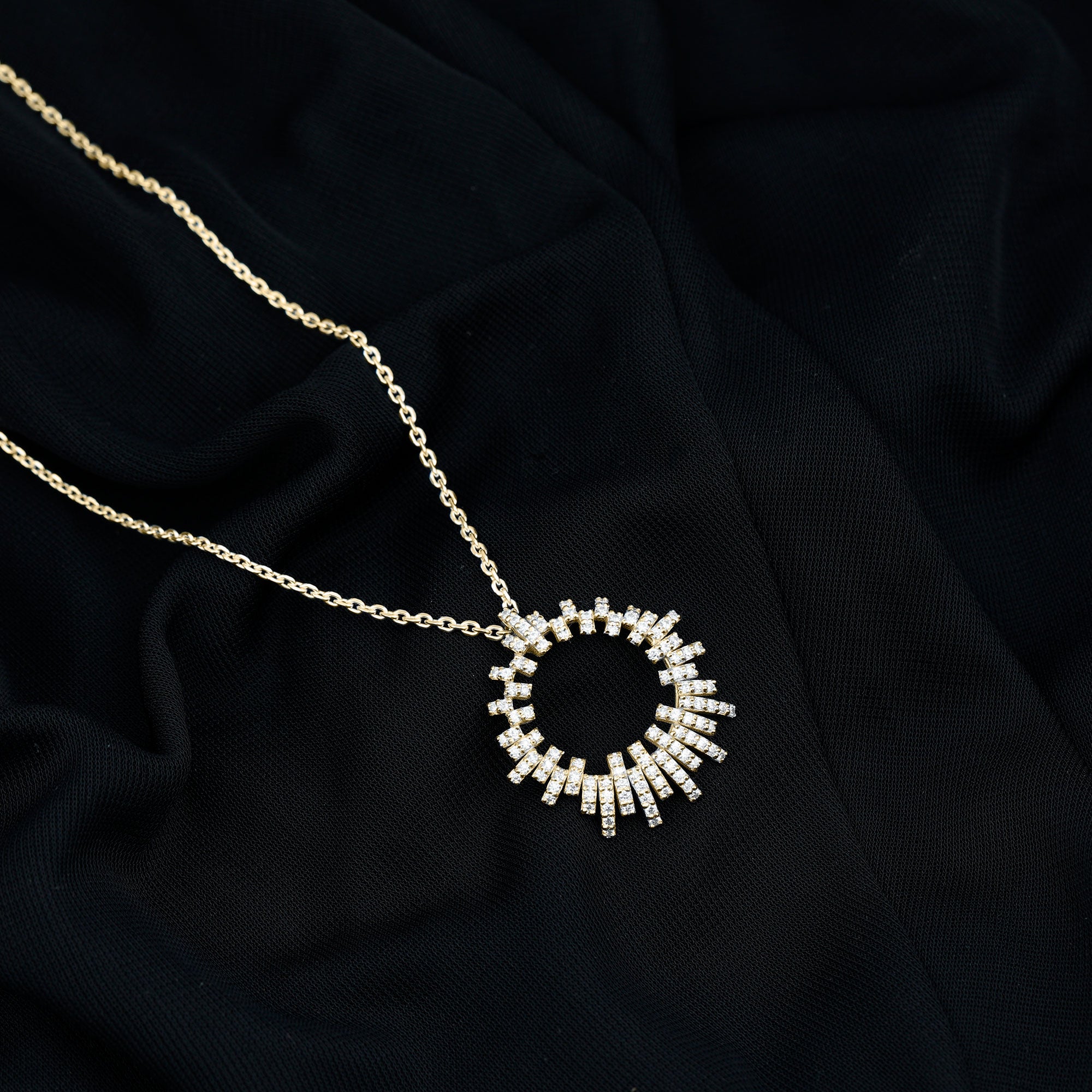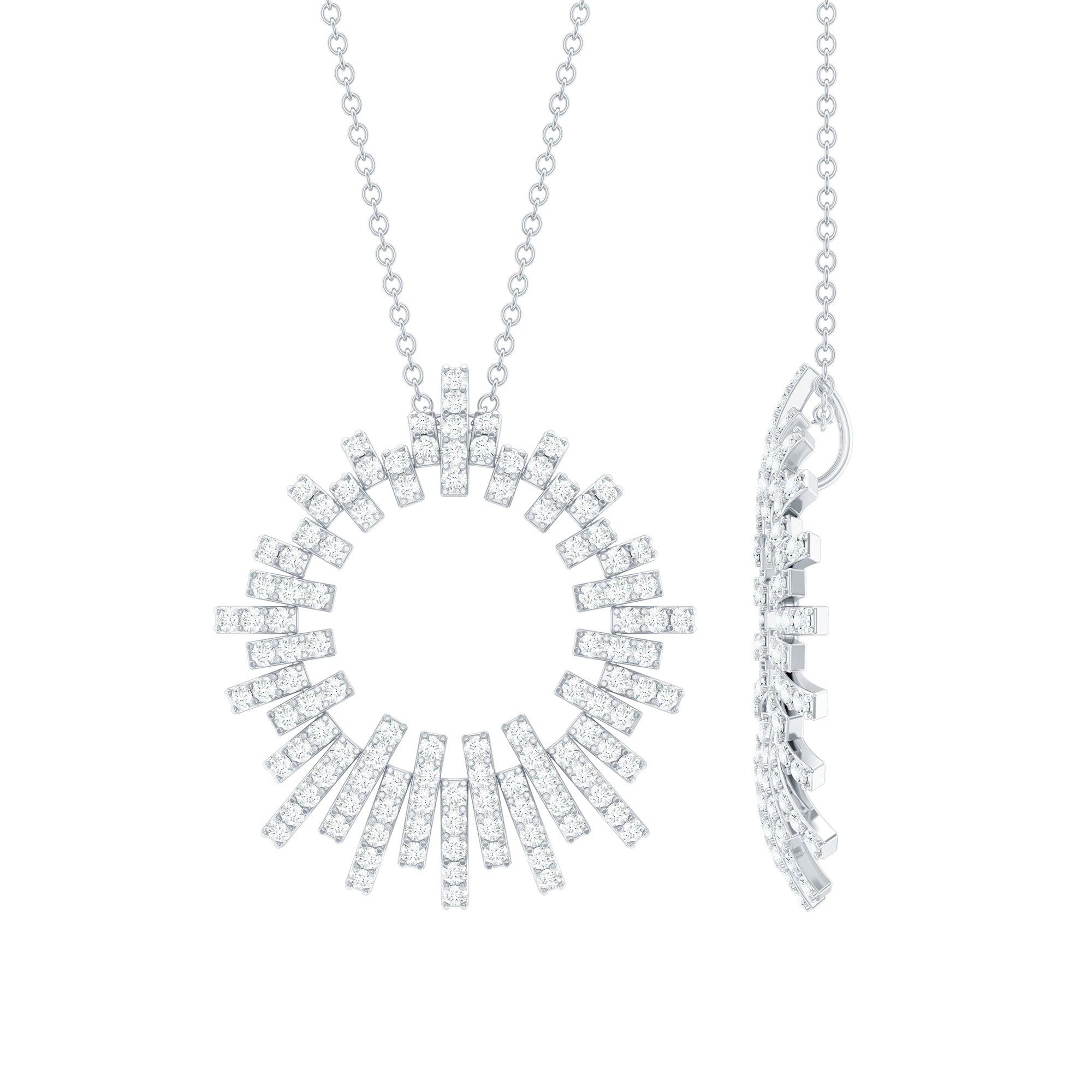 Show your never ending love to your lady by presenting this stunning Diamond Eternity Necklace. This Statement Pendant features a sunburst like design created with connected bars, decorated with dainty round shaped pave set diamonds. A hidden bail connects with the Lab Grown Diamond Pendant Necklace to provide a classic and modern look. Whether you are celebrating an anniversary, a milestone, or simply expressing your love, this Diamond Round Necklace is the perfect symbol of eternity. Gift her something that shines as brightly as she does, because she deserves nothing but the best.