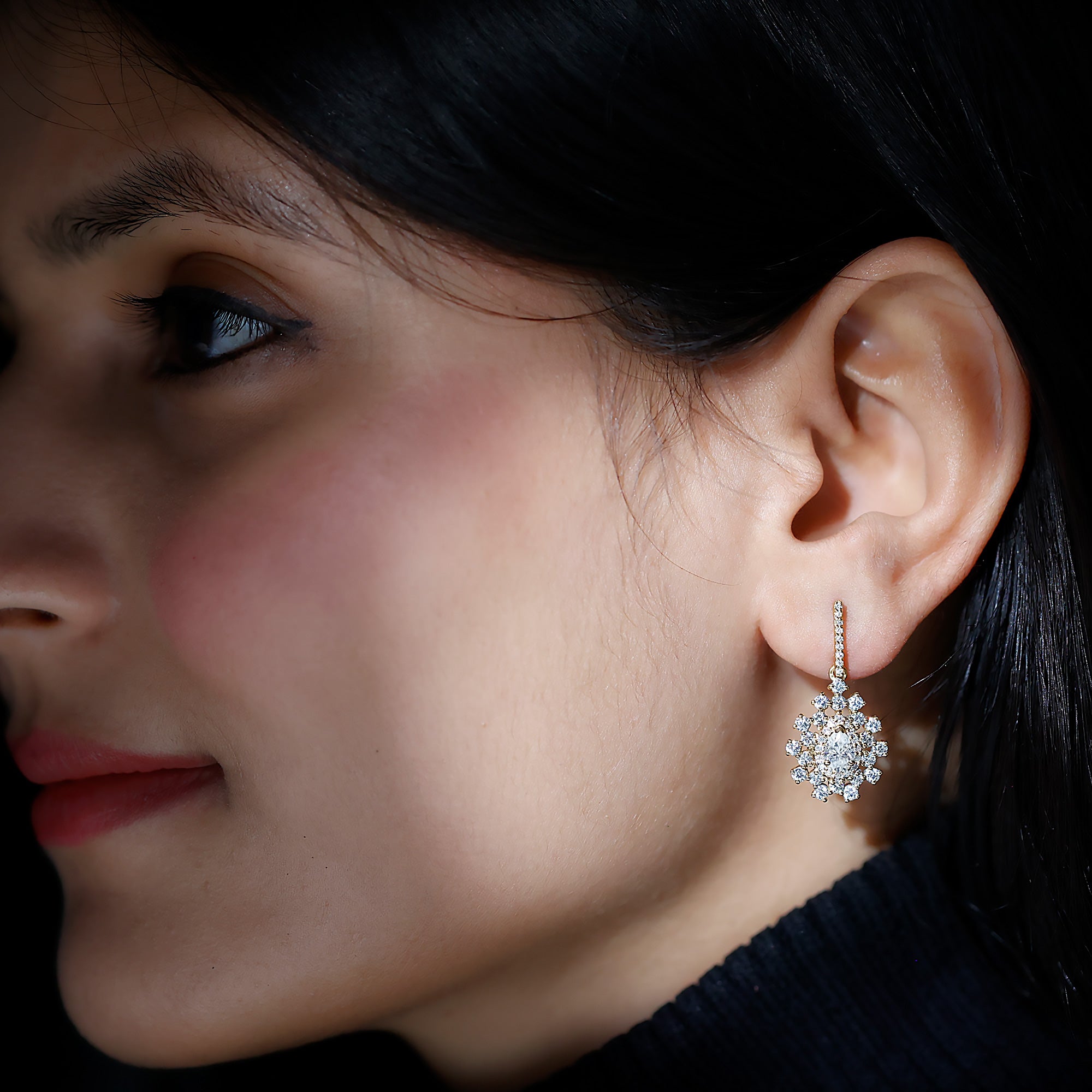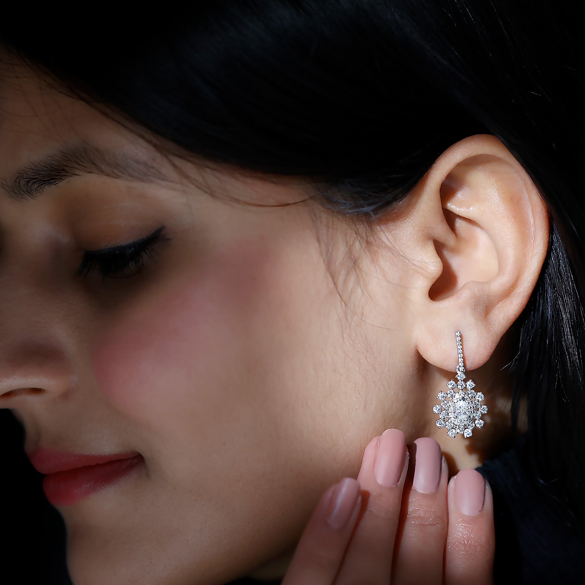 In these Bridal Earrings, a 4X6 MM pear shaped diamond takes center stage, beautifully framed by layers of round cut diamond halo and dangling from a decorative bar at the top. Secure prongs gracefully holds each gemstone in place, enhancing its brilliance, while the screw back closure ensures the earrings sit safely on your earlobes, offering a flawless fit with every wear. Our Diamond Wedding Earrings will add the perfect sparkle to your bridal glow. The Lab Grown Diamond Earrings are an affordable option for those born in April or those whose zodiac sign is Aries, these Drop Earrings hold even deeper meaning, representing clarity, love, and strength.