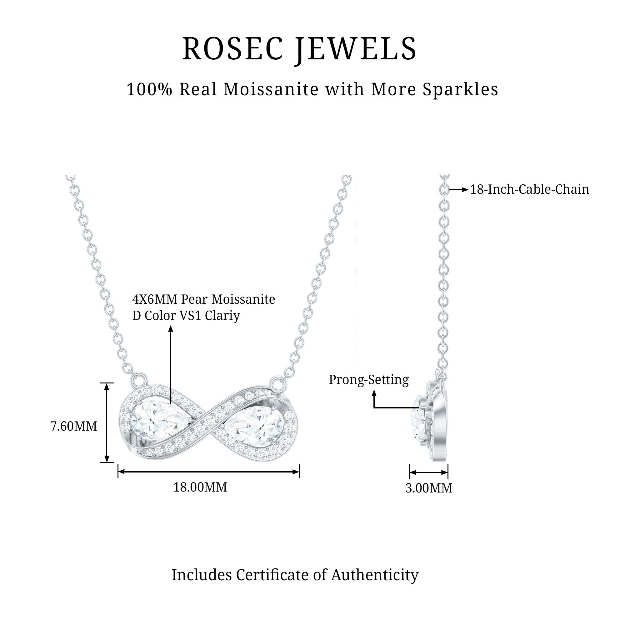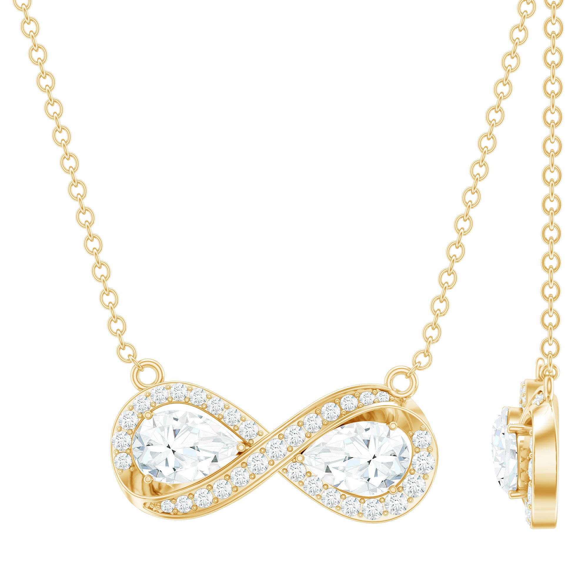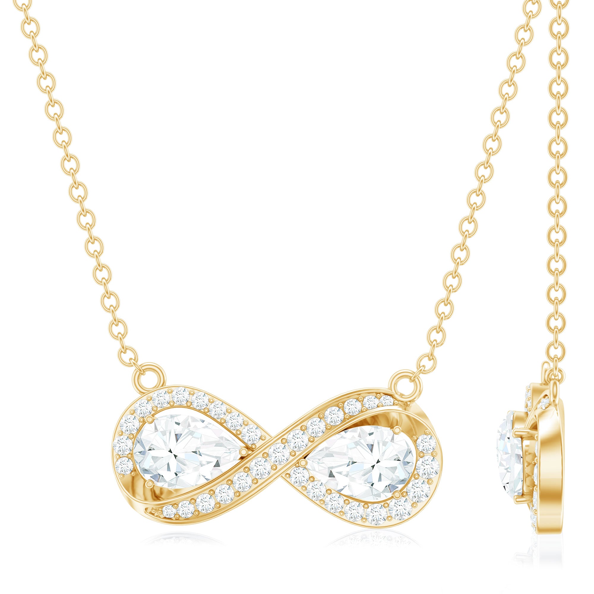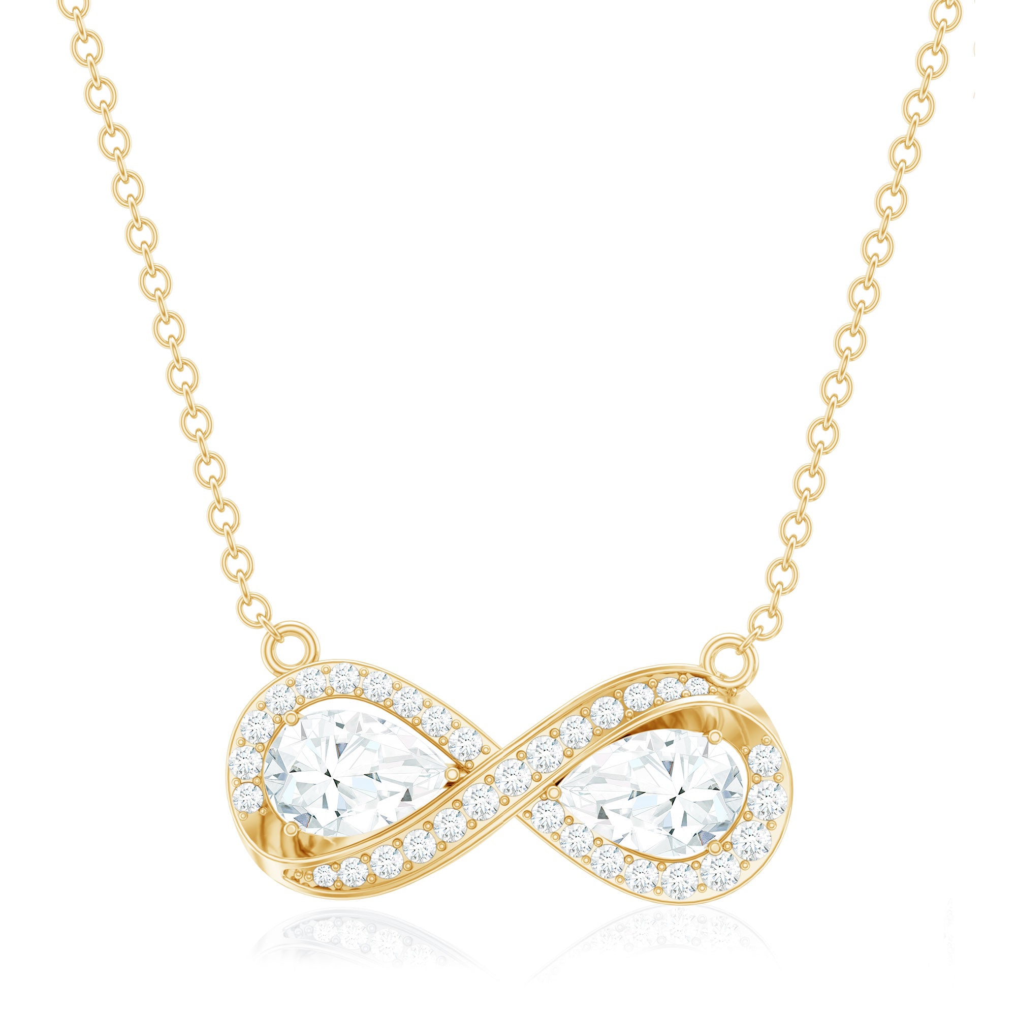The Forever Necklace features two pear-shaped moissanite gemstones measuring 4X6 MM each, graded D-VS1 quality, elegantly positioned at the center of an infinity symbol in secure prong setting. This design embodies the spirit of everlasting love and commitment. Additionally, small, shimmering round moissanites are intricately set along the infinity symbol, enhancing its brilliance. Whether you are celebrating an anniversary, a milestone, or simply expressing your love, this Infinity Sign Necklace is the perfect symbol of eternity. Crafted with our master artisans unmistakable eye for detail, this Moissanite Stackable Necklace strikes the perfect balance between simplicity and durability.