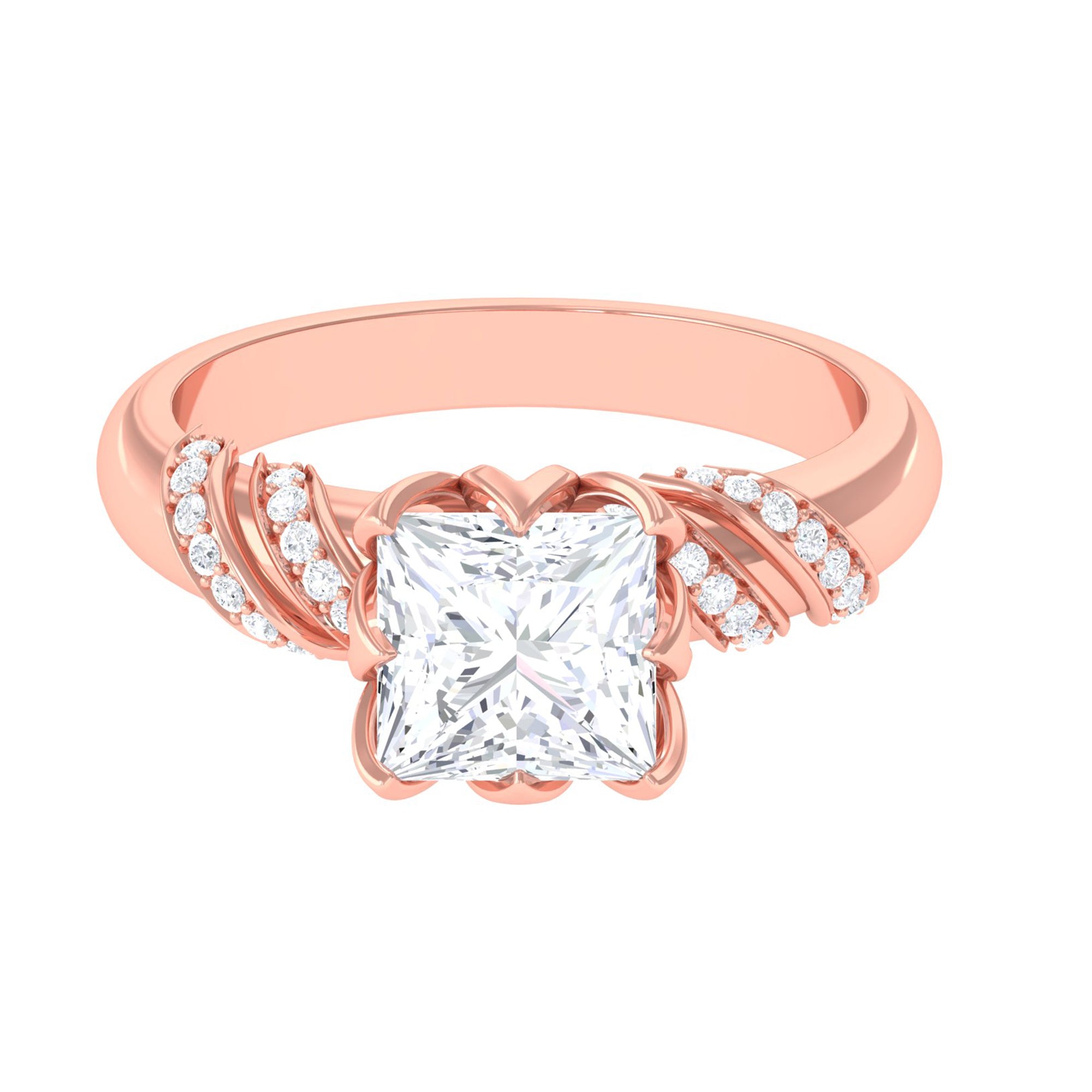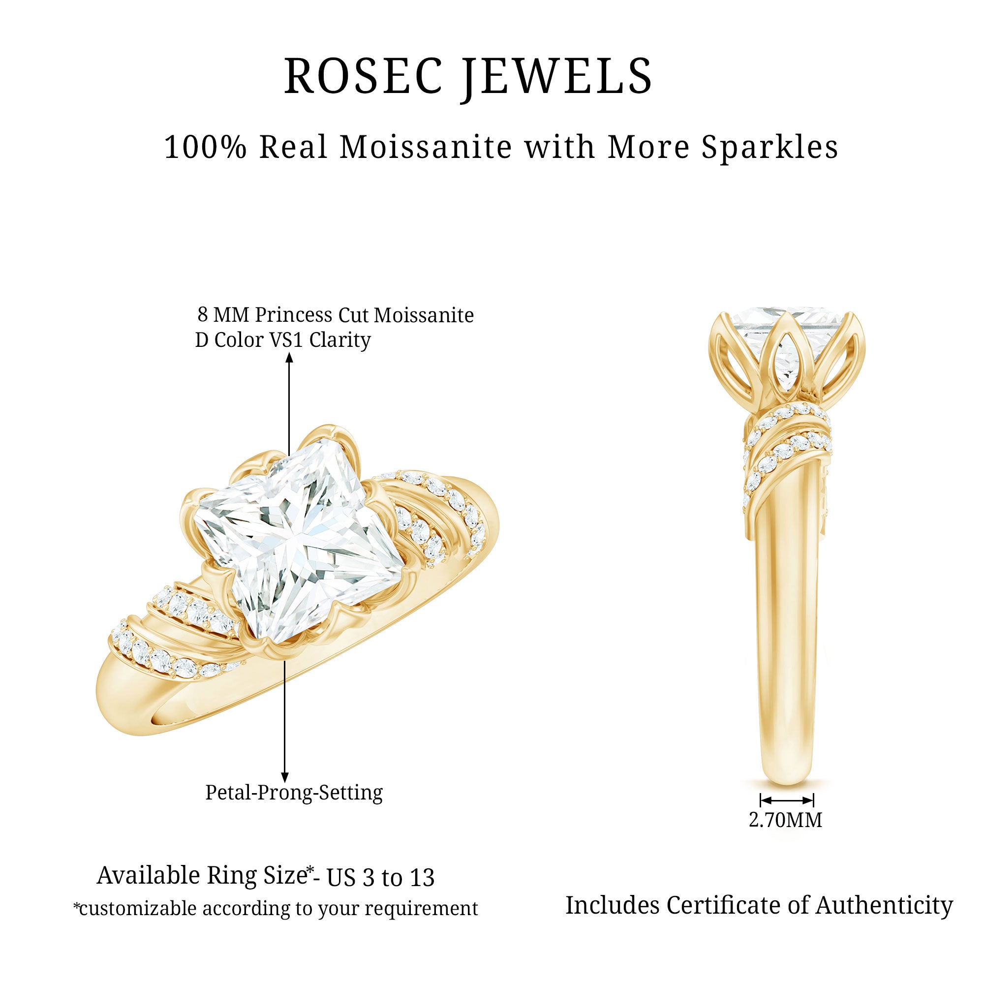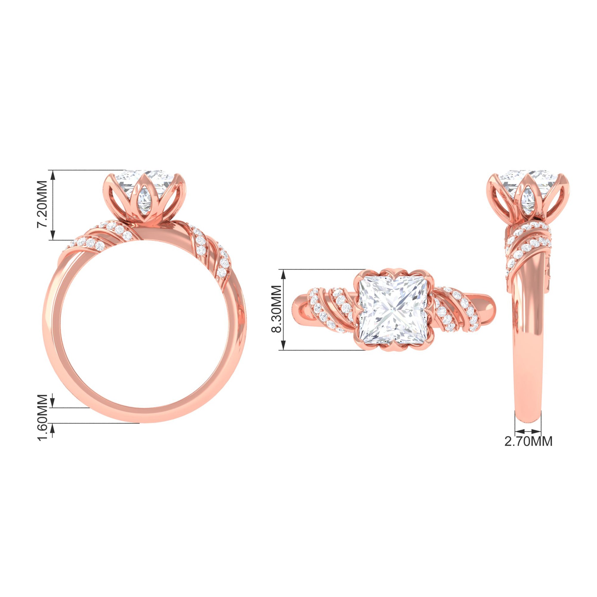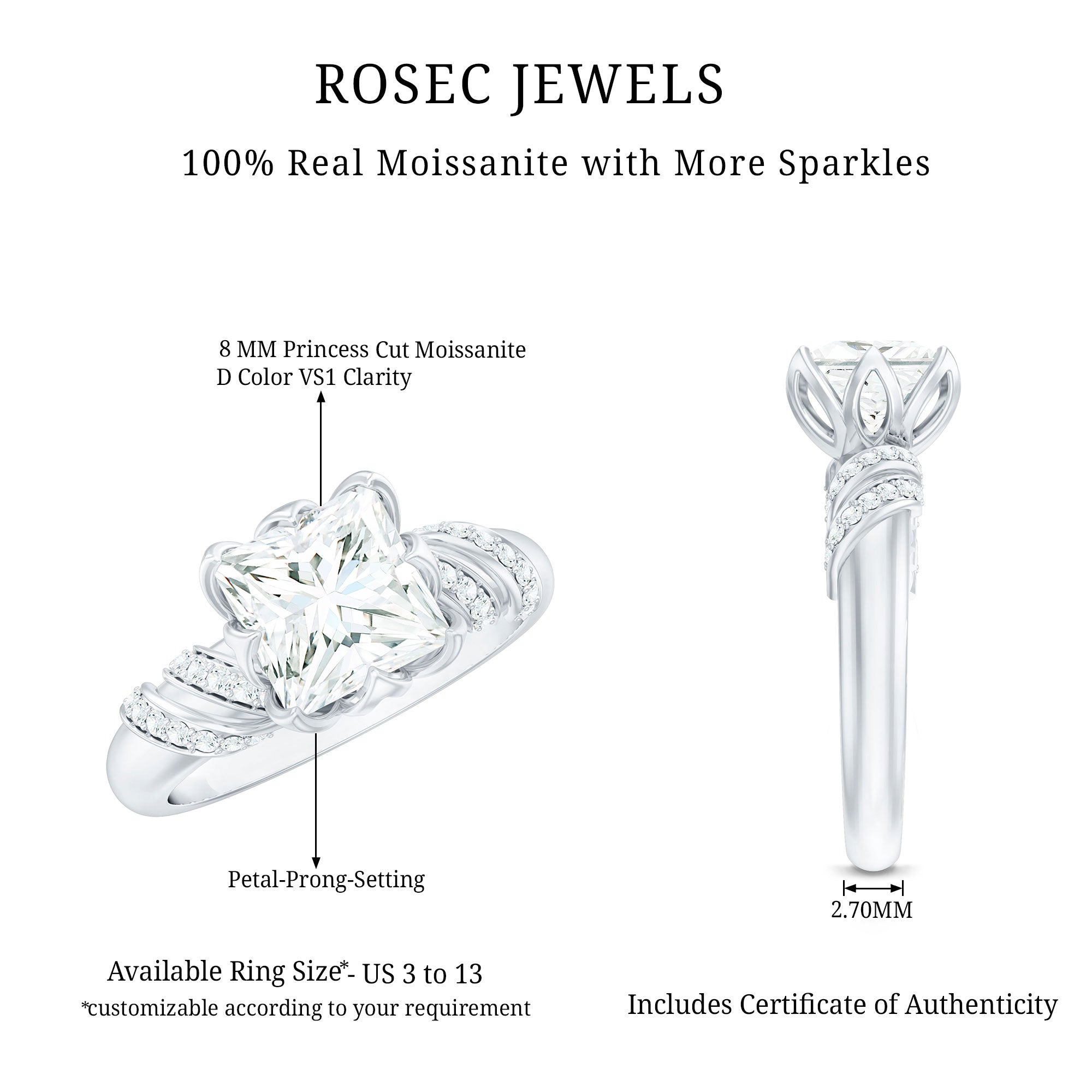 Elegant and full of charm, this Princess Cut Moissanite Engagement Ring is a beautiful mix of timeless style and modern design. At the heart of the ring is a brilliant 8 MM princess cut moissanite. It is set in a graceful petal prong setting, giving it a romantic, floral-inspired touch. The setting not only adds a delicate feel but also allows light to hit the stone from every angle, making it glow with stunning brilliance. The band features a unique twisted design that adds movement and personality to the Solitaire Engagement Ring. Tiny round moissanite stones are delicately placed along the twist, adding just the right amount of shimmer without taking attention away from the center stone. Every detail is thoughtfully crafted to highlight the beauty of the Designer Engagement Ring while keeping it elegant and comfortable for everyday wear. This solitaire ring is perfect for a memorable proposal, a special anniversary, or even as a self-love gift. It’s made for someone who loves the timeless elegance of a solitaire but wants something a little more unique and artistic. The princess cut adds a modern edge, while the floral details and twisted band create a soft, feminine balance. Your 3 Carat Moissanite Ring will arrive in a premium jewelry box, ready for that unforgettable moment. Designed to be cherished forever, this piece is a beautiful symbol of love, individuality, and the start of something truly special.