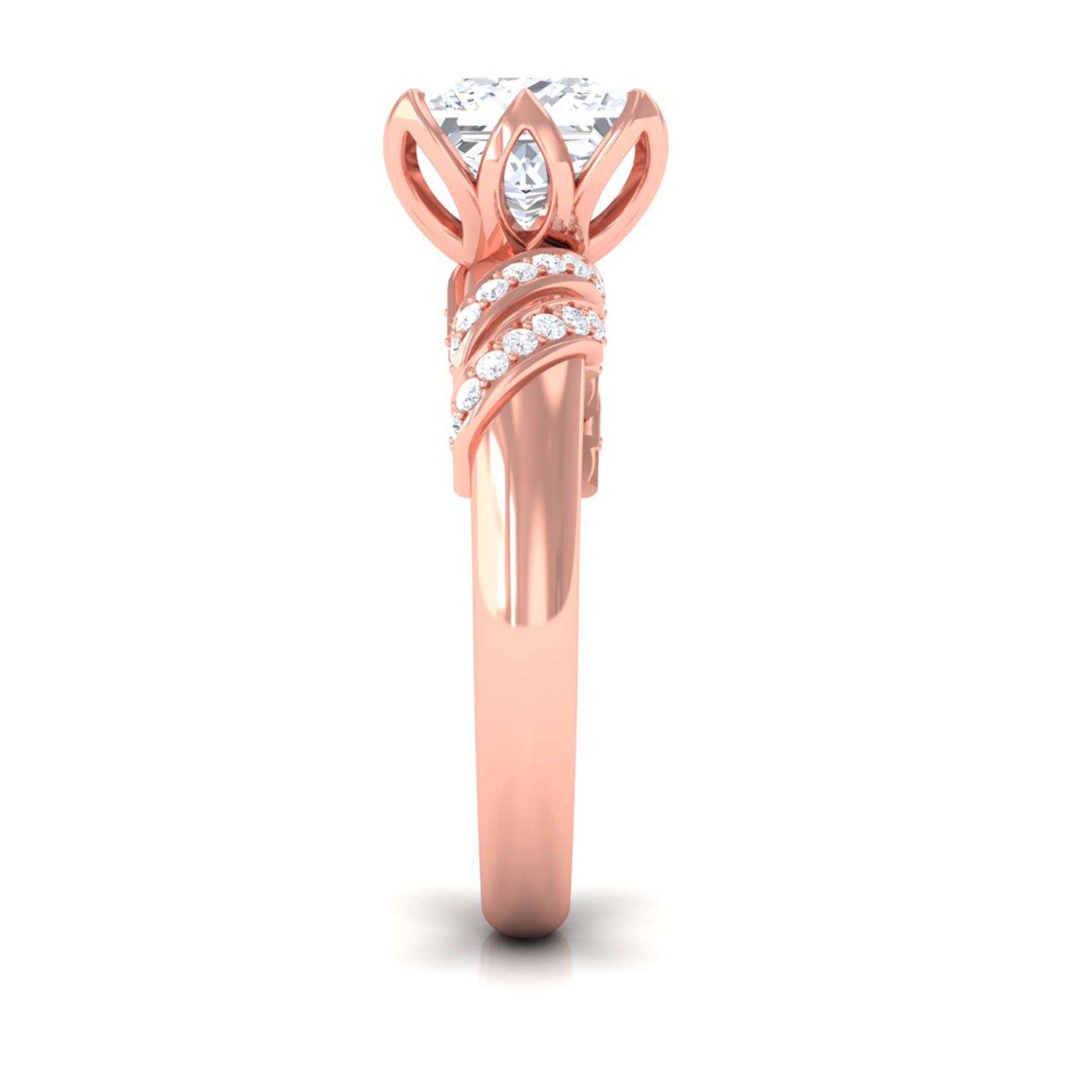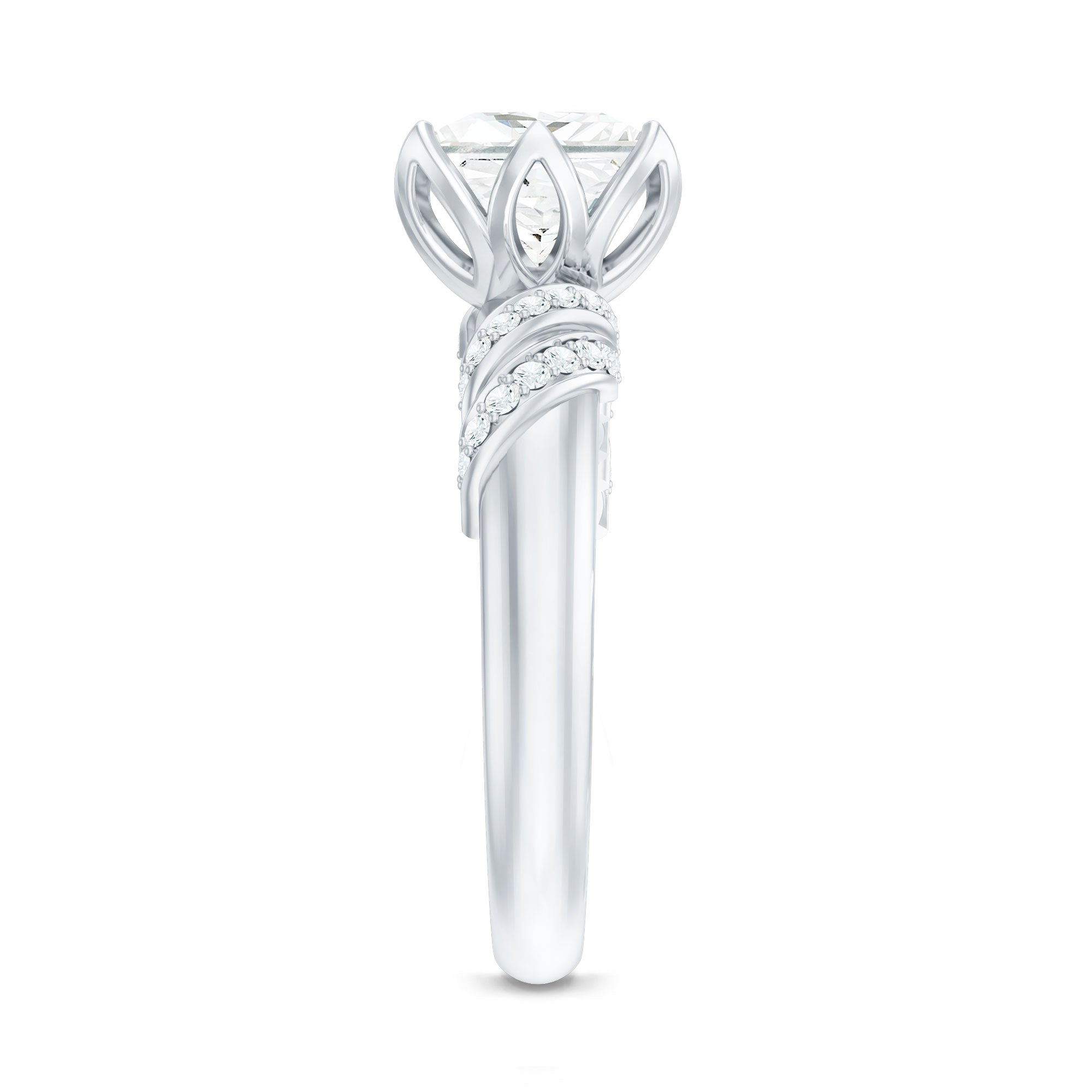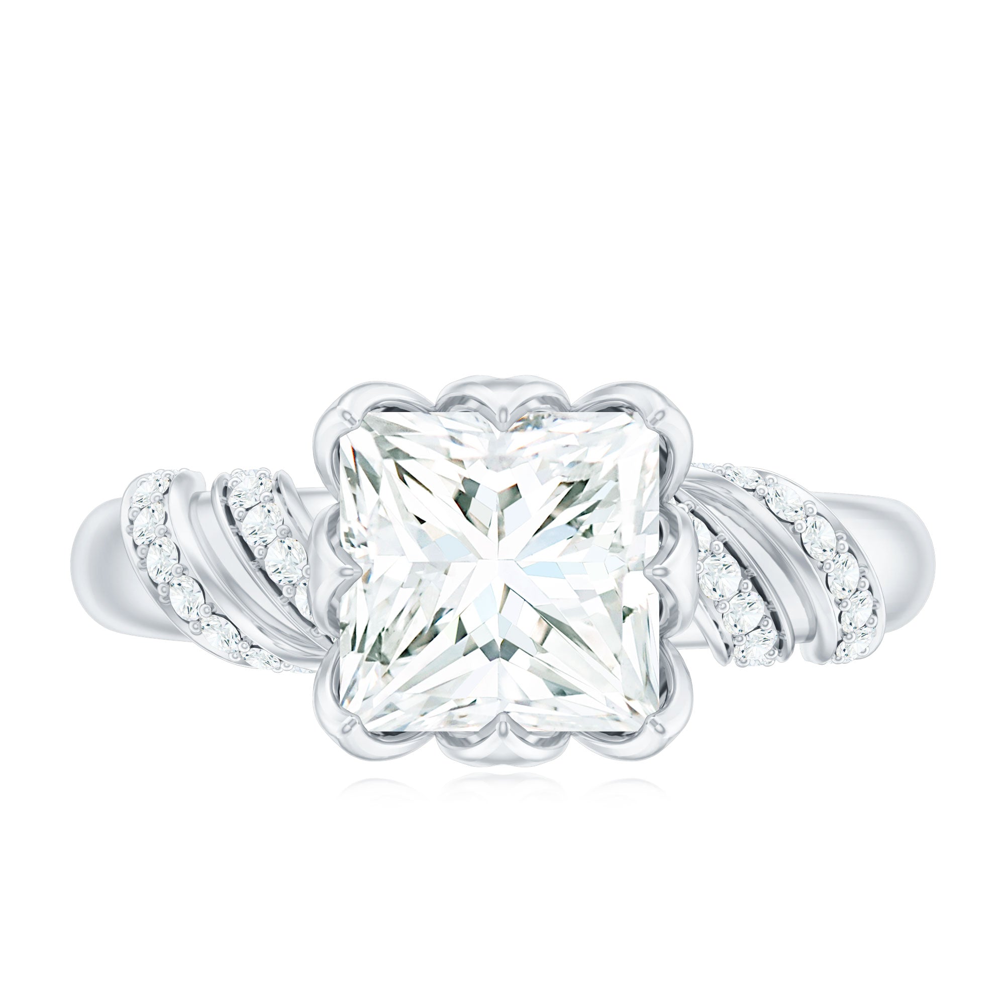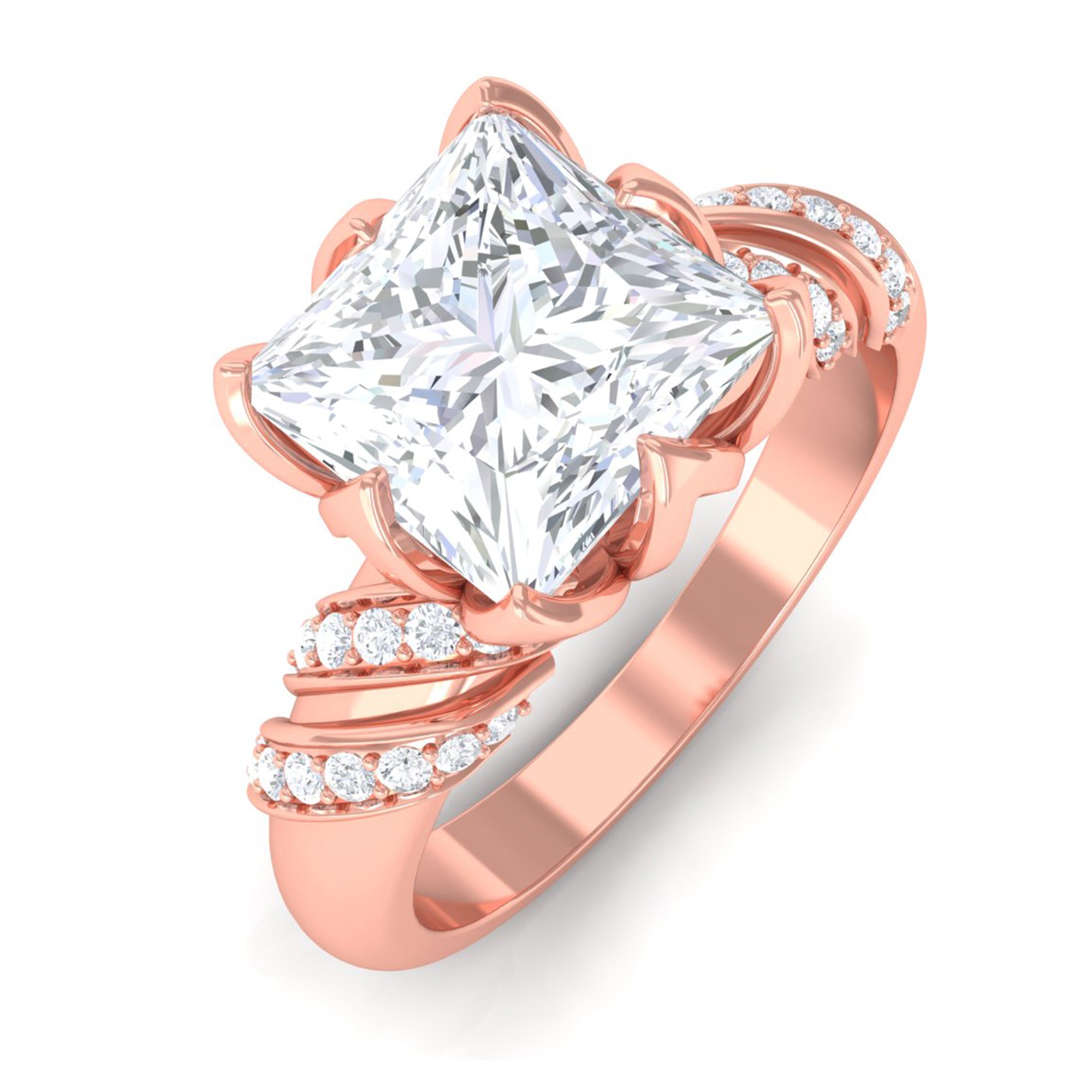 Elegant and full of charm, this Princess Cut Moissanite Engagement Ring is a beautiful mix of timeless style and modern design. At the heart of the ring is a brilliant 8 MM princess cut moissanite. It is set in a graceful petal prong setting, giving it a romantic, floral-inspired touch. The setting not only adds a delicate feel but also allows light to hit the stone from every angle, making it glow with stunning brilliance. The band features a unique twisted design that adds movement and personality to the Solitaire Engagement Ring. Tiny round moissanite stones are delicately placed along the twist, adding just the right amount of shimmer without taking attention away from the center stone. Every detail is thoughtfully crafted to highlight the beauty of the Designer Engagement Ring while keeping it elegant and comfortable for everyday wear. This solitaire ring is perfect for a memorable proposal, a special anniversary, or even as a self-love gift. It’s made for someone who loves the timeless elegance of a solitaire but wants something a little more unique and artistic. The princess cut adds a modern edge, while the floral details and twisted band create a soft, feminine balance. Your 3 Carat Moissanite Ring will arrive in a premium jewelry box, ready for that unforgettable moment. Designed to be cherished forever, this piece is a beautiful symbol of love, individuality, and the start of something truly special.