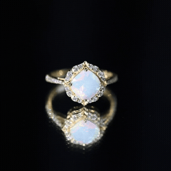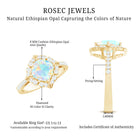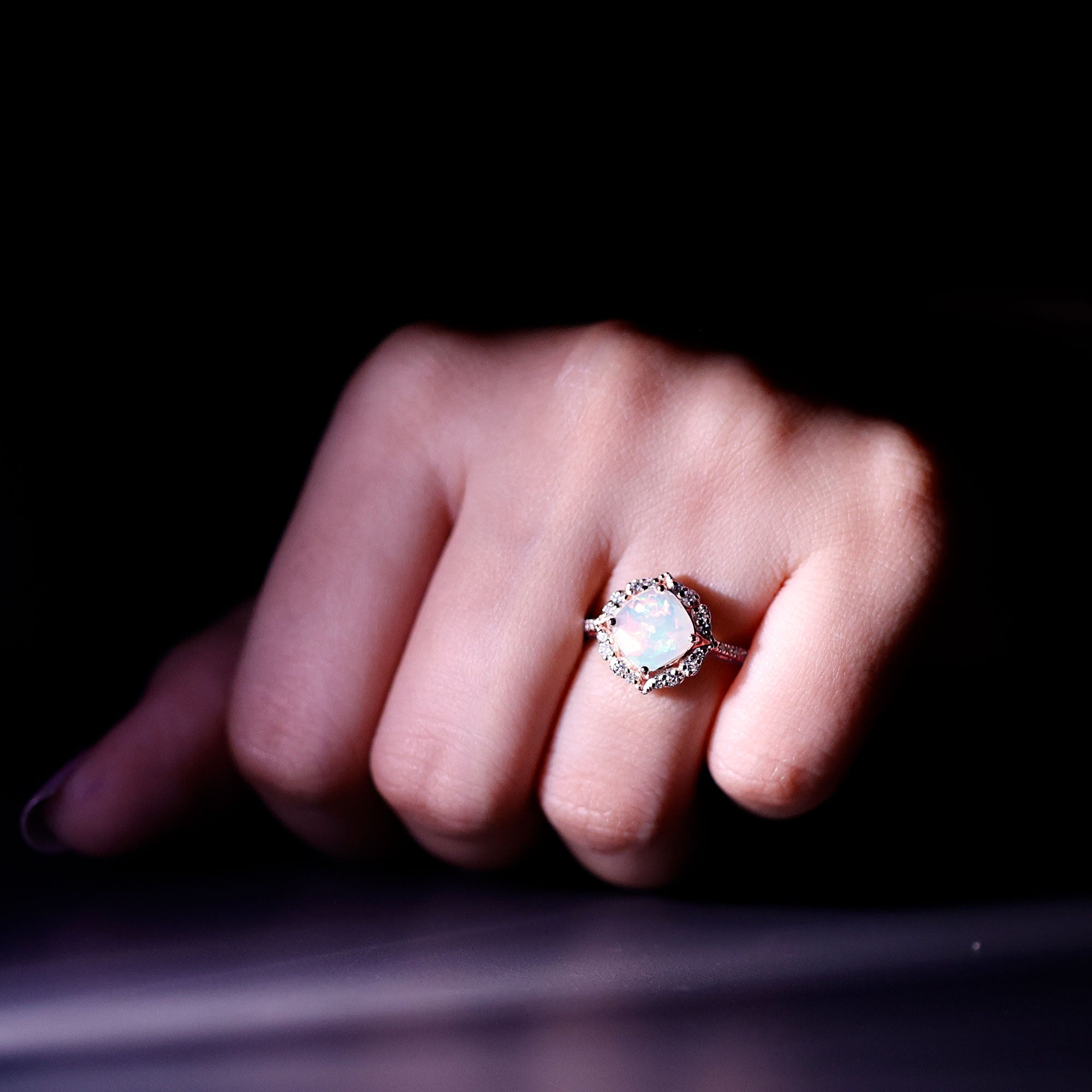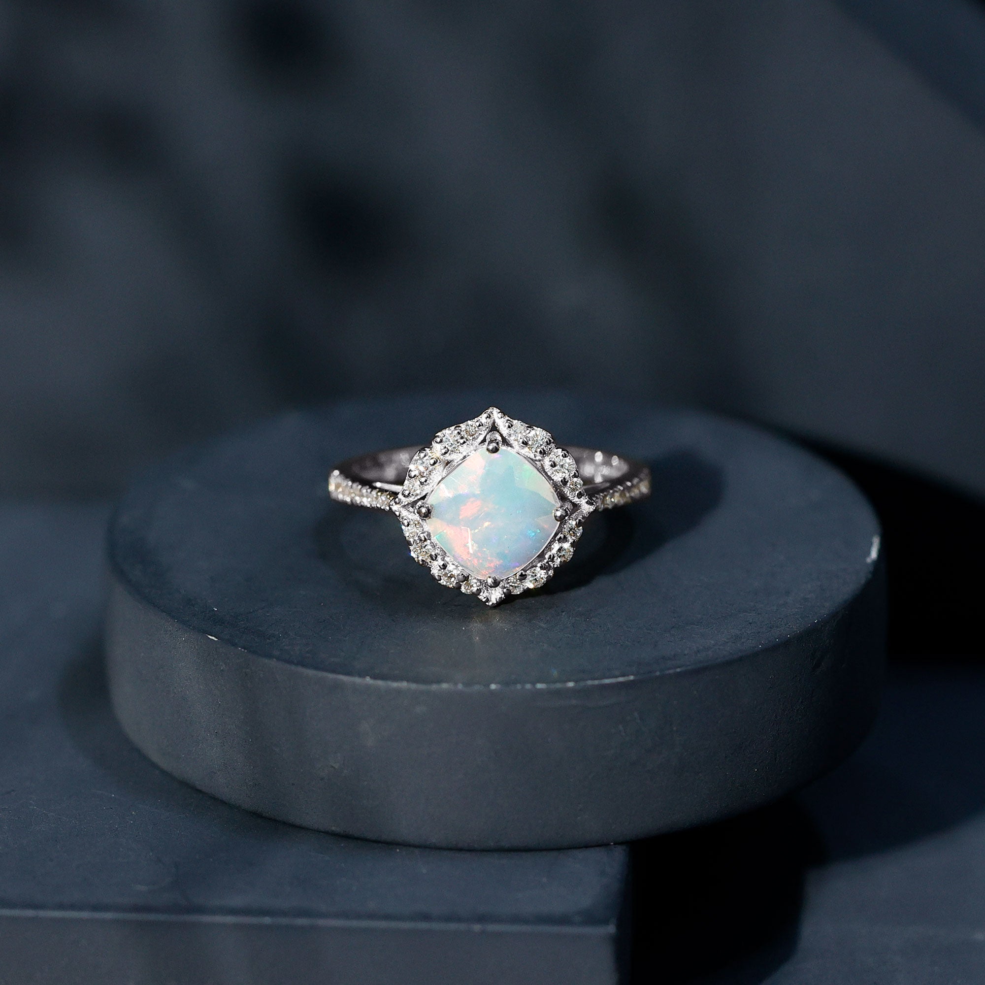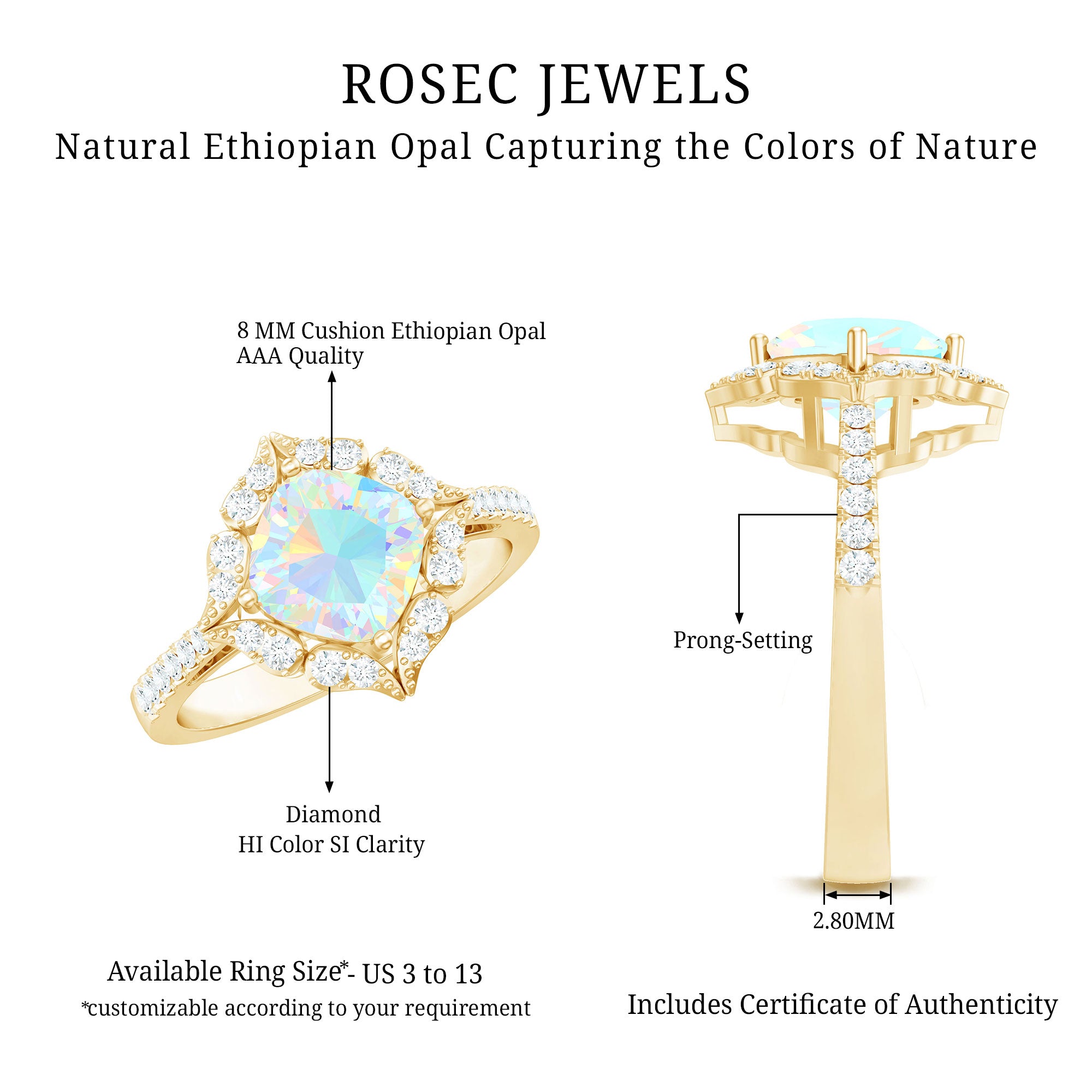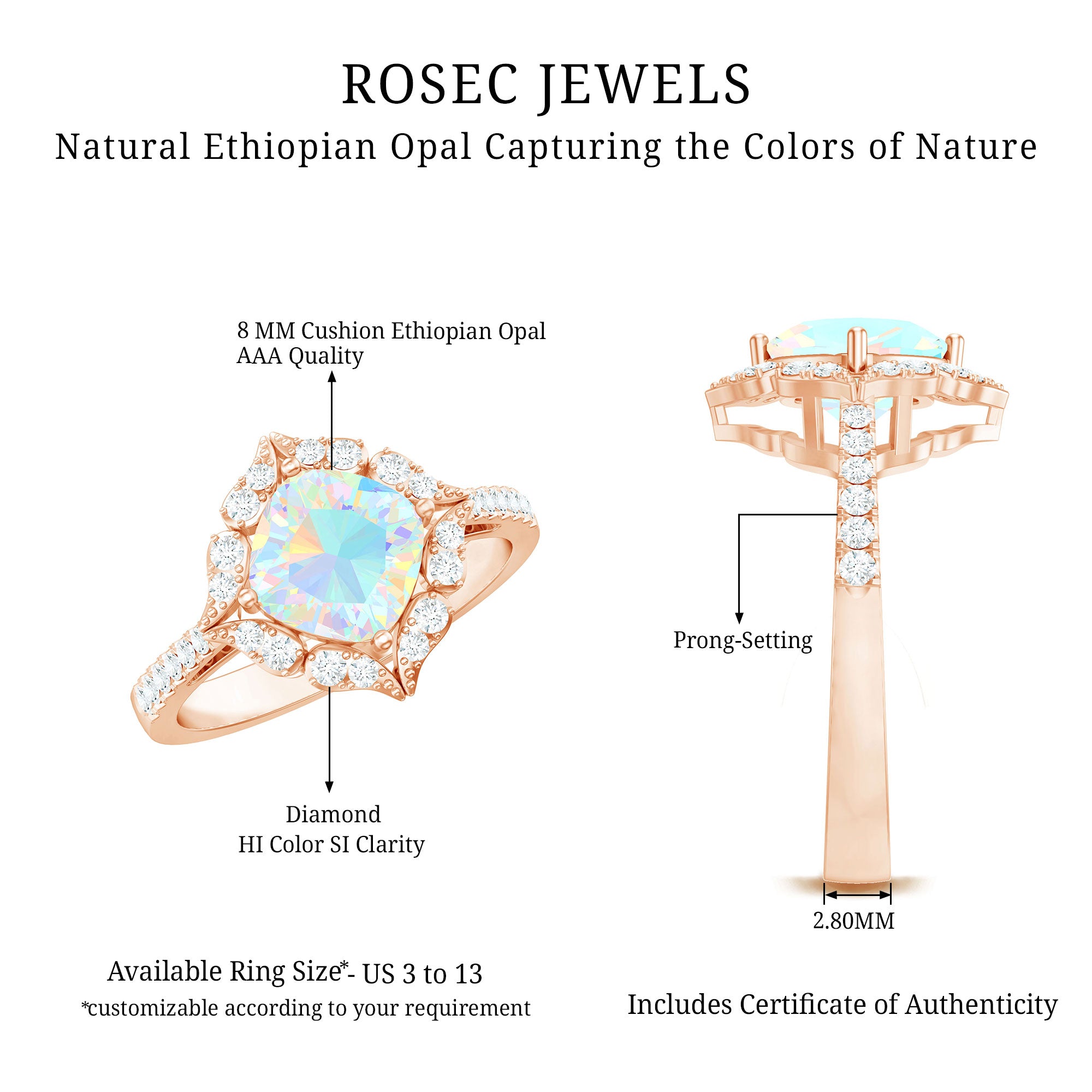Vintage charm meets modern sparkle in this stunning Opal Engagement Ring, a piece that feels like it has been plucked from a romantic era gone by. This Vintage Inspired Engagement Ring features a dreamy 8 mm Cushion Cut Ethiopian Opal at the center in Diagonal Prong Setting, glows with a soft, iridescent hue, shifting color with every flicker of light. Surrounding it is a radiant halo of shimmering Diamond stones set in a Vintage Style design, adding just the right amount of sparkle while giving a nod to timeless glamour. The band is detailed with delicate Diamond stones that create a graceful sparkle with every move, making this Cushion Cut Engagement Ring an instant heirloom in the making. With its vintage inspired design and enchanting center stone, this Halo Engagement Ring with Opal is perfect for the bride who loves a little old-world romance with a fresh twist. Whether you are popping the question or upgrading your jewelry game, this Opal Diamond Engagement Ring delivers all the sparkle and sentiment in one unforgettable package. It comes beautifully boxed and ready to gift, available in multiple sizes to ensure a flawless fit.