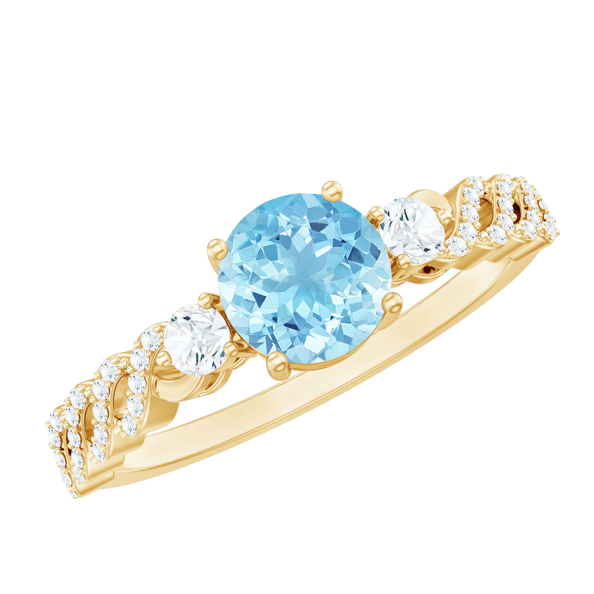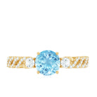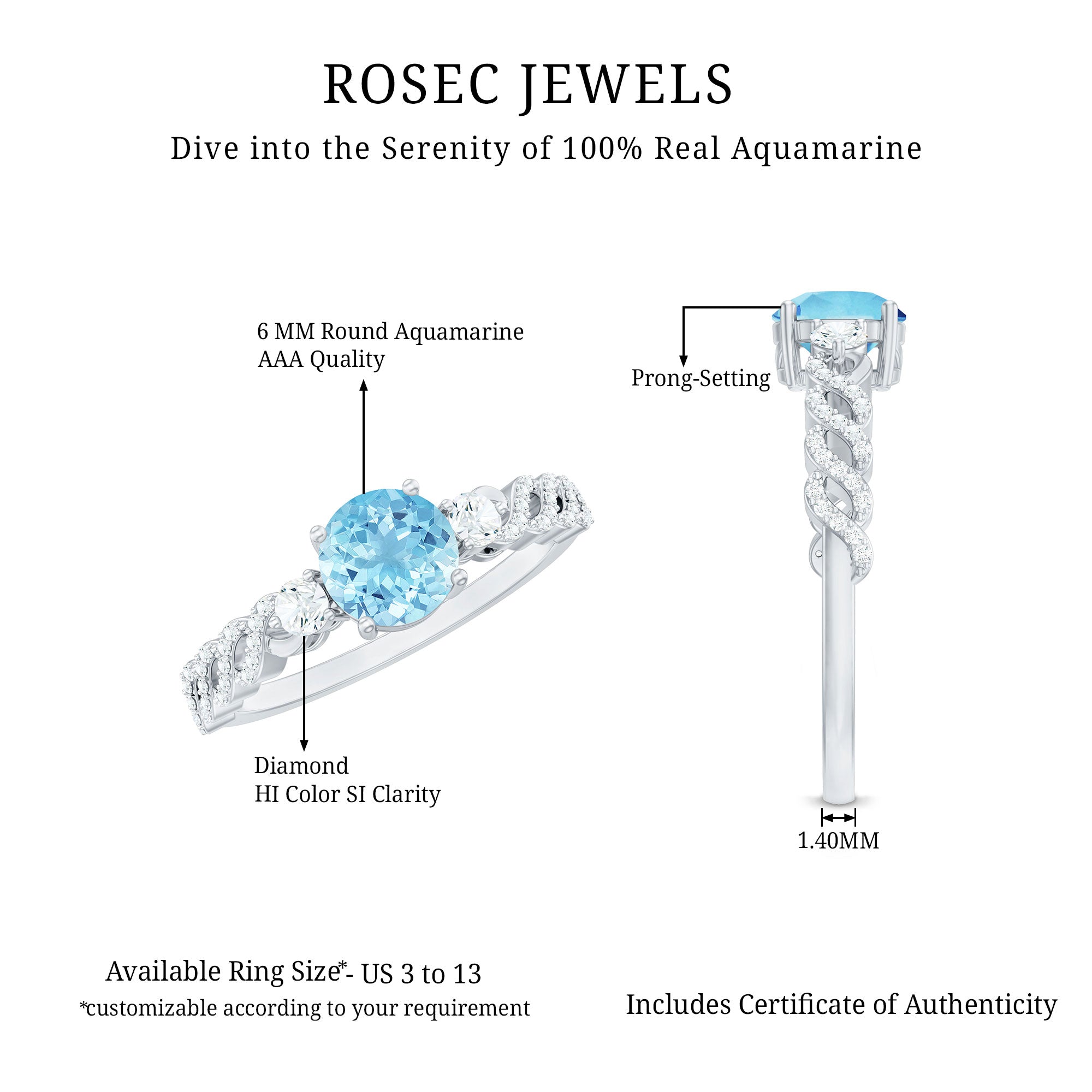 Make your special day unforgettable with this Aquamarine Engagement Ring, a breathtaking blend of elegance, romance and artistry. At its center lies a 6 mm Round Shape Aquamarine gemstone set in 4 Prong Setting, whose serene blue hue evokes calm and the deep connection of true love. Flanking the center stone are sparkling Diamond Side Stones that add brilliance and sophistication, reflecting light with every movement. The band with a unique design, thoughtfully crafted with intricate details, elevates the uniqueness and modern charm of this Aquamarine Diamond Ring while maintaining timeless elegance. Available in various ring sizes and presented in a signature jewelry box, this Aquamarine Solitaire Ring is ready to become part of your love story, capturing the promise of forever in every glance. With its dazzling AAA Quality Aquamarine, sparkling HI-SI Diamond stones and exquisite craftsmanship, this Aquamarine Ring for Women ensures your special moment is remembered for the extraordinary elegance it embodies.
