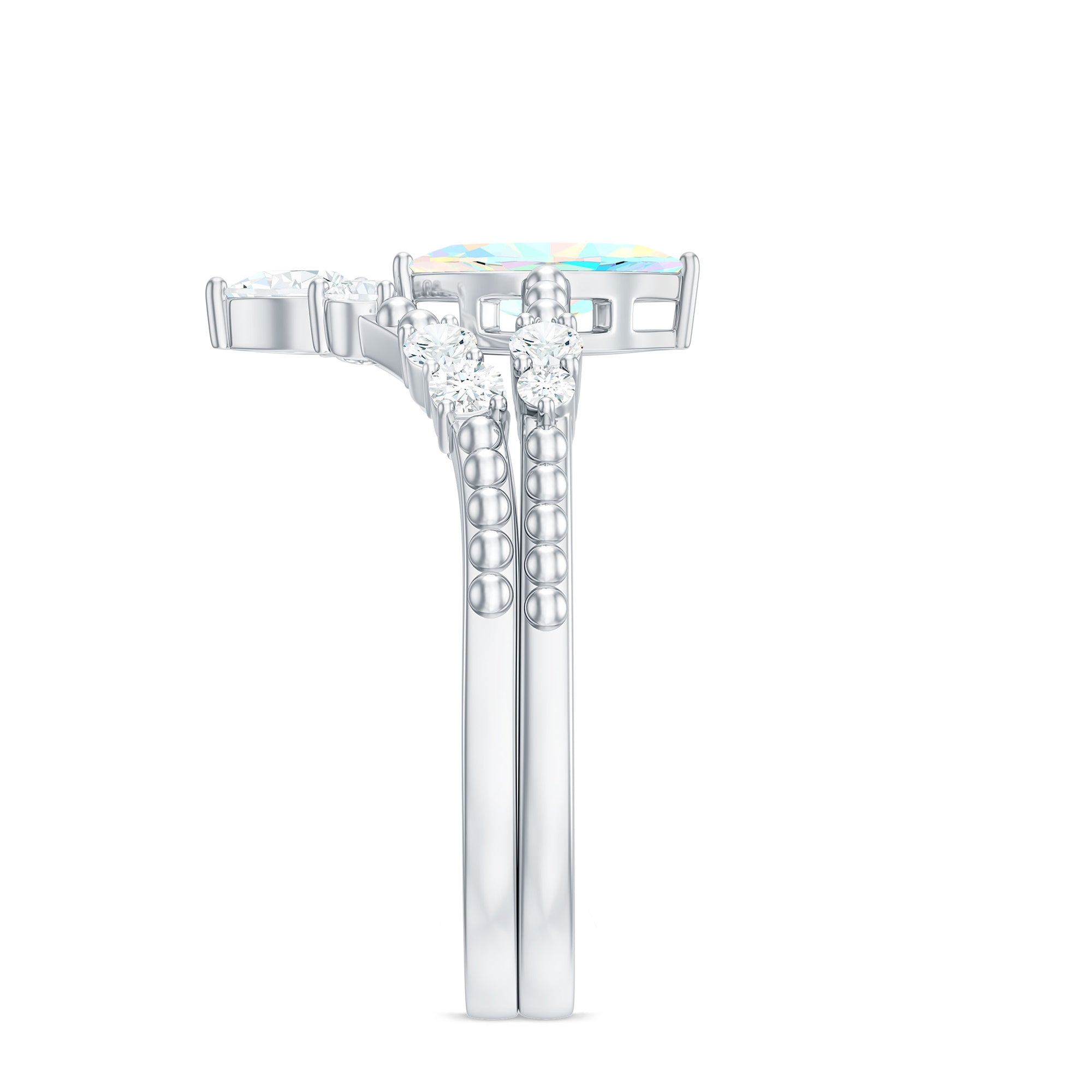 Dare to dazzle with this Wedding Bridal Ring Set that brings together celestial charm and bold sophistication. At the center of the Solitaire Engagement Ring is a 4X8 mm Marquise Shape Ethiopian Opal, flickering with rainbow hues, flanked by sparkling Moissanite stones that amplify its natural magic. The coordinating V Shaped Wedding Band adds more brilliance, adorned with a mix of Pear and Round Shape Moissanite stones that create a dramatic sparkle. This Marquise Engagement Ring with Wedding Band features intricate Beaded Detailing along the bands, giving them a vintage inspired touch with a modern twist. This thoughtfully designed Opal Wedding Ring Set offers perfect symmetry, symbolism and style, ideal for brides who want something unique yet timeless. Available in a variety of sizes and presented in a signature jewelry box, this Opal Engagement Ring Set is ready to gift or wear straight out of the box. Whether you are stepping into forever or upgrading your bridal stack, this Engagement and Wedding Ring Set is crafted for the kind of romance that lights up a lifetime.