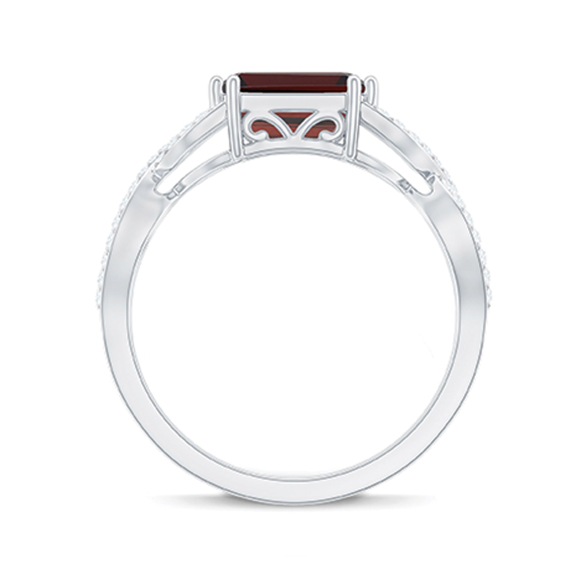 The emerald cut garnet is positioned horizontally in an east-west orientation. This modern setting changes the traditional vertical alignment of the gemstone, creating a contemporary silhouette that highlights the elongated shape of the stone.