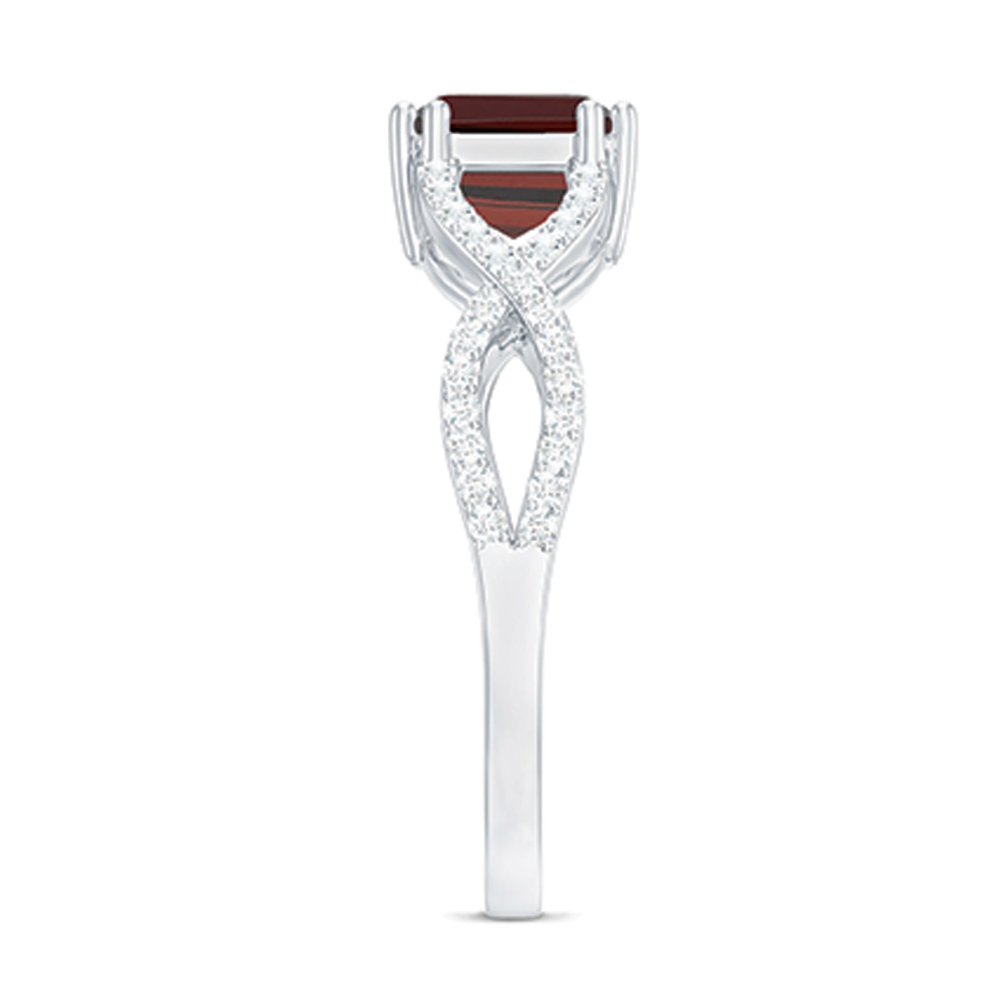 This engagement ring features a certified real garnet in an emerald cut design, complemented by diamond accents that enhance its refined appearance. The deep red gemstone serves as the focal point of the ring, offering a distinctive alternative to traditional engagement stones.