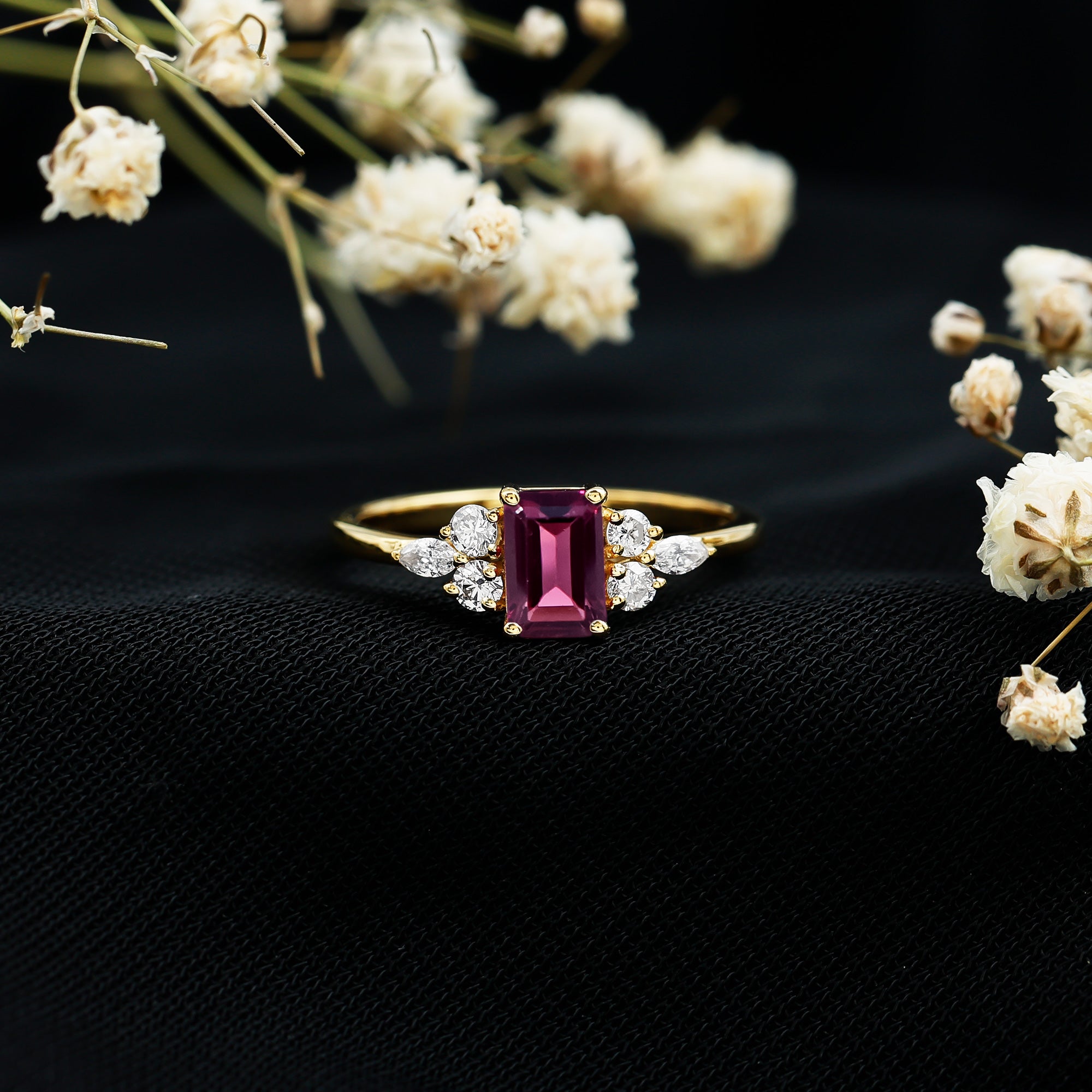 Crafted to leave a lasting impression, this Rhodolite Garnet Engagement Ring captures timeless sophistication. Crafted in 14K yellow gold plated silver, this Promise Engagement Ring is a perfect balance between classic style and modern elegance. The centerpiece features a 4X6 MM emerald cut rhodolite set in a secure prong setting. On both sides of the center stone, you will find a trio of sparkling round and marquise cut lab grown diamonds that add just the right amount of shine without being over the top. Whether you are looking for an Alternative Engagement Ring, a meaningful promise ring, or just a beautiful piece to celebrate a special moment, this ring fits the moment. It is a wonderful choice for someone who appreciates subtle beauty, detailed craftsmanship, and jewelry that tells a story. Comfortable to wear and easy to pair with other pieces, this Emerald Cut Ring is more than just a piece of jewelry, it is a reflection of style, sentiment, and thoughtful design. Whether you are treating yourself or gifting it to someone special, this Rhodolite Ring is a lasting peace that will always feel timeless.