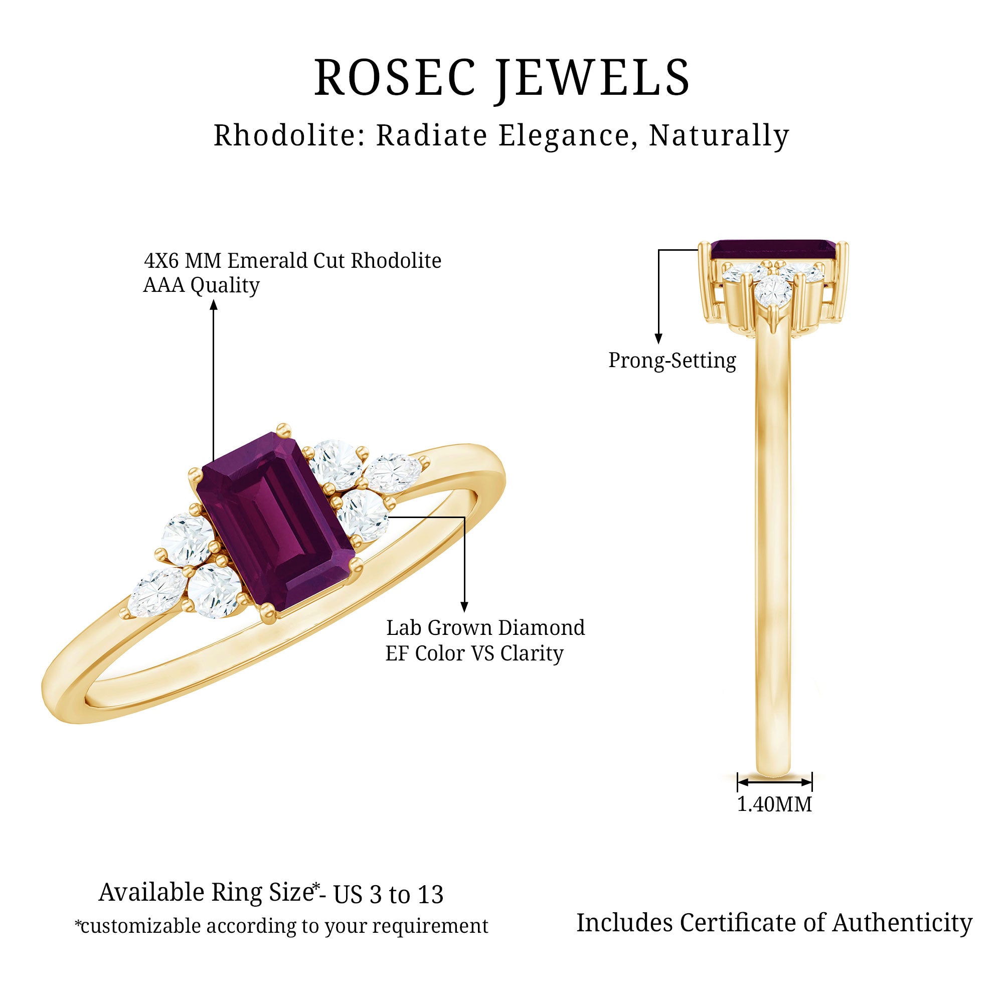 Certified Rhodolite Emerald Cut Engagement Ring with Diamond Trio