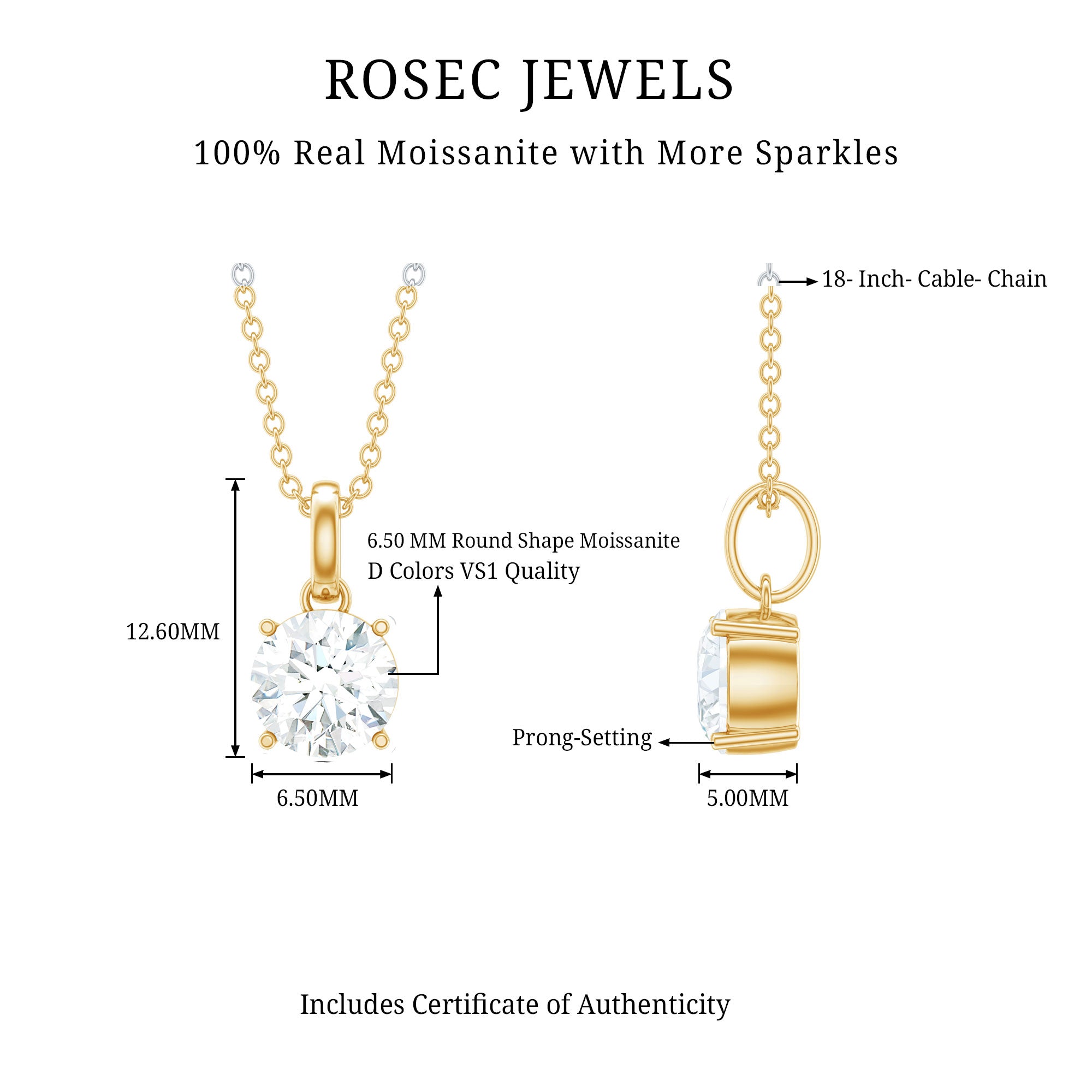 Surprise your special lady with something that is both timeless and meaningful, like our Solitaire Moissanite Necklace. Made by Rosec Jewels from 14K yellow gold plated silver, this Single Stone Pendant showcases a beautiful round cut moissanite in prong setting for that elegant touch. This 1 Carat Moissanite Necklace is not just any jewelry piece; it is a must-have for every woman’s collection. It features a classic bail that lets the cable chain slide through effortlessly. The Silver Moissanite Pendant dangles beautifully from an 18-inch cable chain, fastened with a lobster clasp for adjustable length, ensuring it fits comfortably and securely, perfect for all-day wear. By giving her this Round Pendant Necklace, you will enhance her jewelry collection with a hint of luxury she can flaunt anytime, anywhere. Plus, the secure Signature Jewelry Box packaging not only adds an element of surprise but also provides safe storage for her treasured piece. The dazzling charm of this Solitaire Necklace makes it ideal for everyday wear or dressing up for special events.