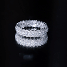 Shining with elegance and charm, this Moissanite Wedding Band celebrates love and commitment in a truly special way. Designed to capture attention, the Wide Wedding Band features three sparkling rows of round cut moissanite stones, each carefully set in prongs to ensure brilliance from every angle. The wide band design gives it a bold yet graceful look, making it perfect for someone who wants a statement piece that still feels classic and timeless. Each moissanite in this wedding band is of D-VS1 quality, offering exceptional clarity and sparkle that rivals natural diamonds. The stones are arranged with precision along the band, creating a continuous shimmer that beautifully reflects light. Every angle of the 3 Row Wedding Band catches the eye, making it a stunning symbol of love that can be admired daily. Ideal for weddings, anniversaries, or special milestones, this Moissanite Anniversary Band can be worn alone for a bold statement or paired with an engagement ring for a stacked look. It is a meaningful and dazzling band that will be cherished forever.