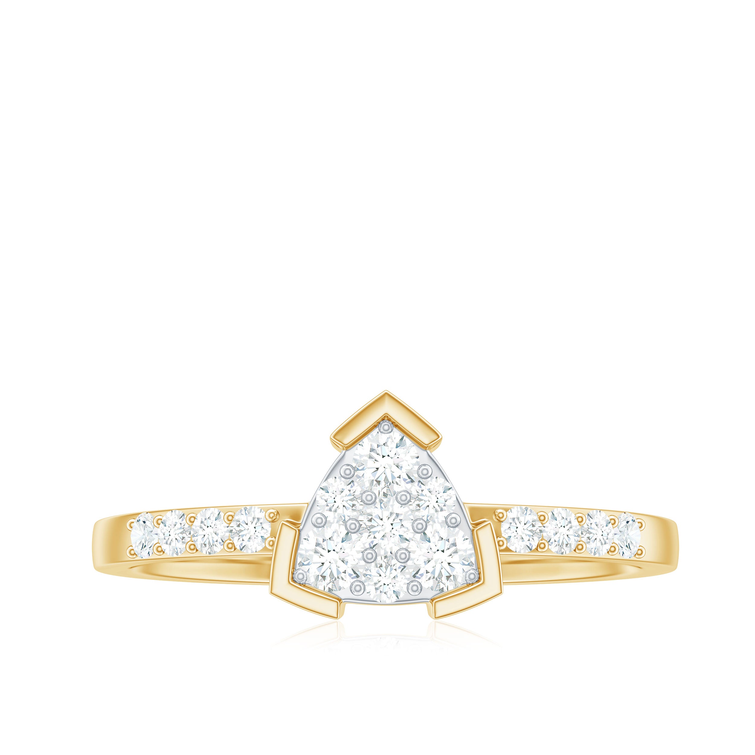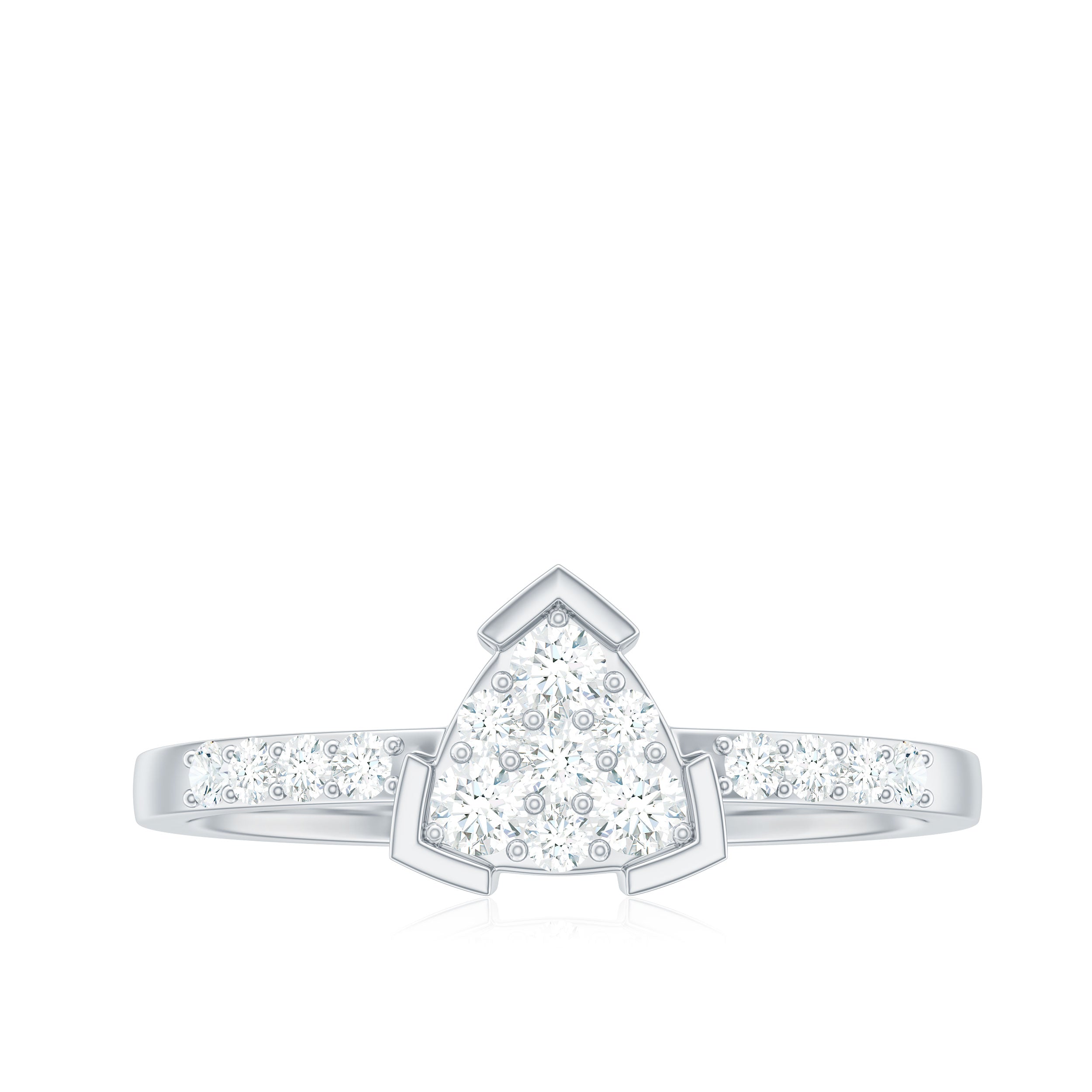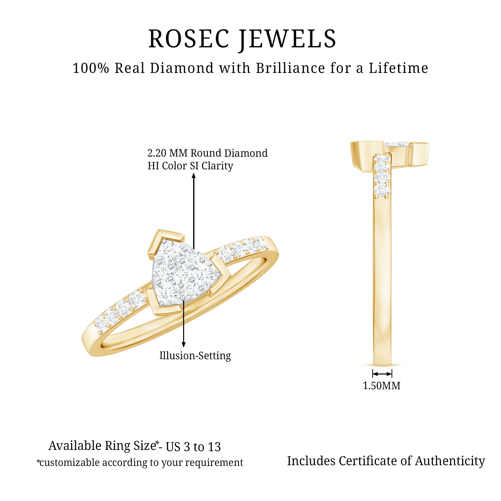 What a beautiful and enchanting Diamond Engagement Ring, it is. This on-trend Illusion Setting Diamond sets in a triangular frame, creating a larger appearance on the ring. To adorn the shank are the Side Stones that scintillate beautifully. Unrivaled elegance and sophistication, it has a geometric design with an unmistakable wow factor. The cluster of Diamond results in a continuous band of sparkle that apart from its dazzling appearance. The simplicity of the design maximizes its sparkle with a modern twist. In the bygone eras, the Unique Engagement Ring offers an unusual, rather artistic and certainly unique design. Sparkle with every movement, this Diamond Cluster Ring adds a touch of elegance and sparkle. Creating a modern and sophisticated look, it manipulates the perception of the diamond to make it appear bigger and more brilliant. As a gorgeous, unique, sophisticated aesthetic that stands apart from traditional designs. It is a timeless piece with a captivating twist. So, make your proposal unforgettable and your love story shine with the eternal radiance Illusion Diamond Ring. It is a perfect combo of dazzle and style.