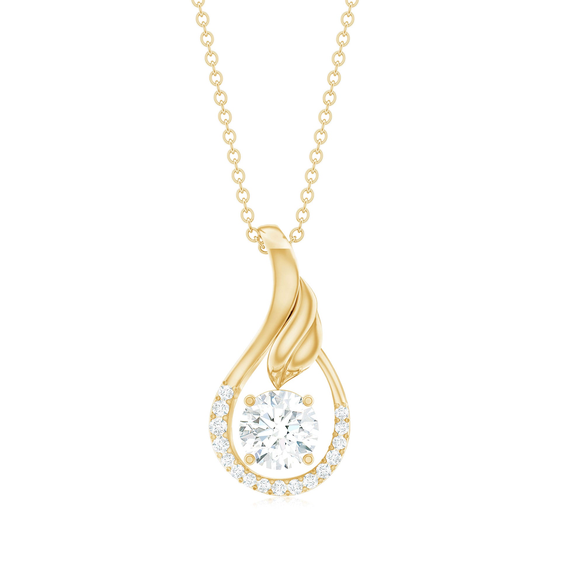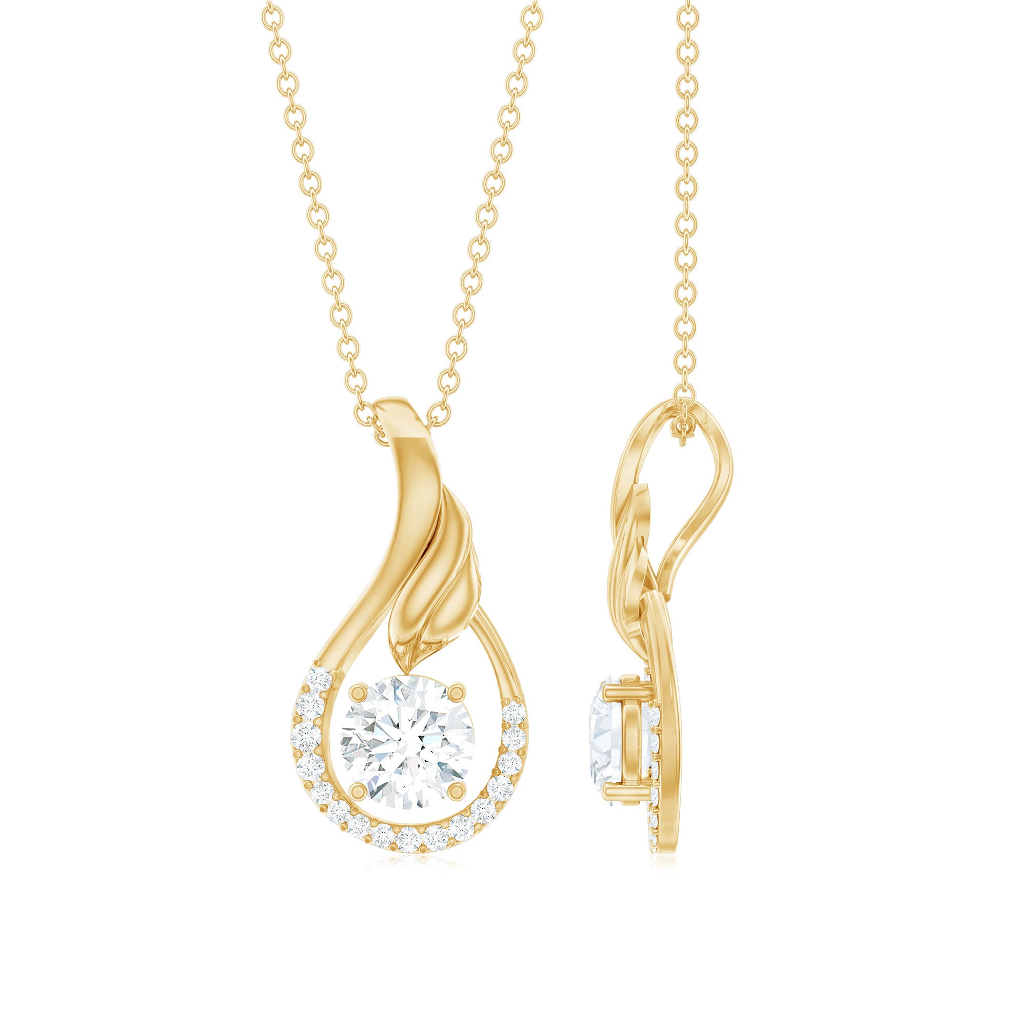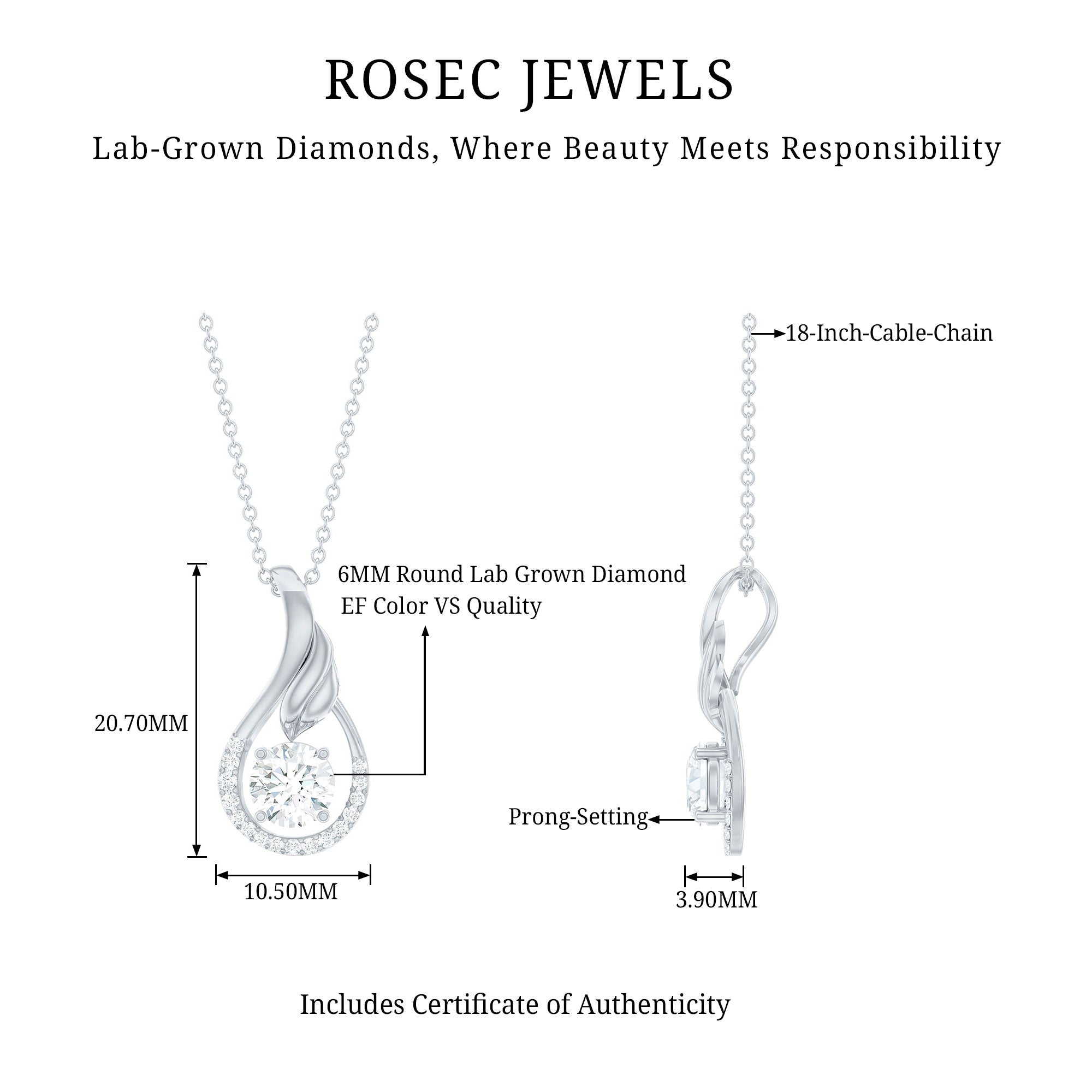 Adorn your neckline by wearing this Minimal Diamond Pendant Necklace. This captivating Teardrop Pendant Necklace is adorned with a 6 mm Round Shape Diamond of Ef-Vs quality set in prong setting in the center, the Drop Pendant is further beautified with dainty lab grown diamonds and features a delicate leaf motif. The minimalist design exudes timeless charm, making this April Birthstone Necklace a versatile accessory for any occasion like - anniversaries, birthdays, and Valentines Day. Elevate your look with this enchanting Man Made Diamond Necklace from Rosec Jewels, where sophistication meets conscience.