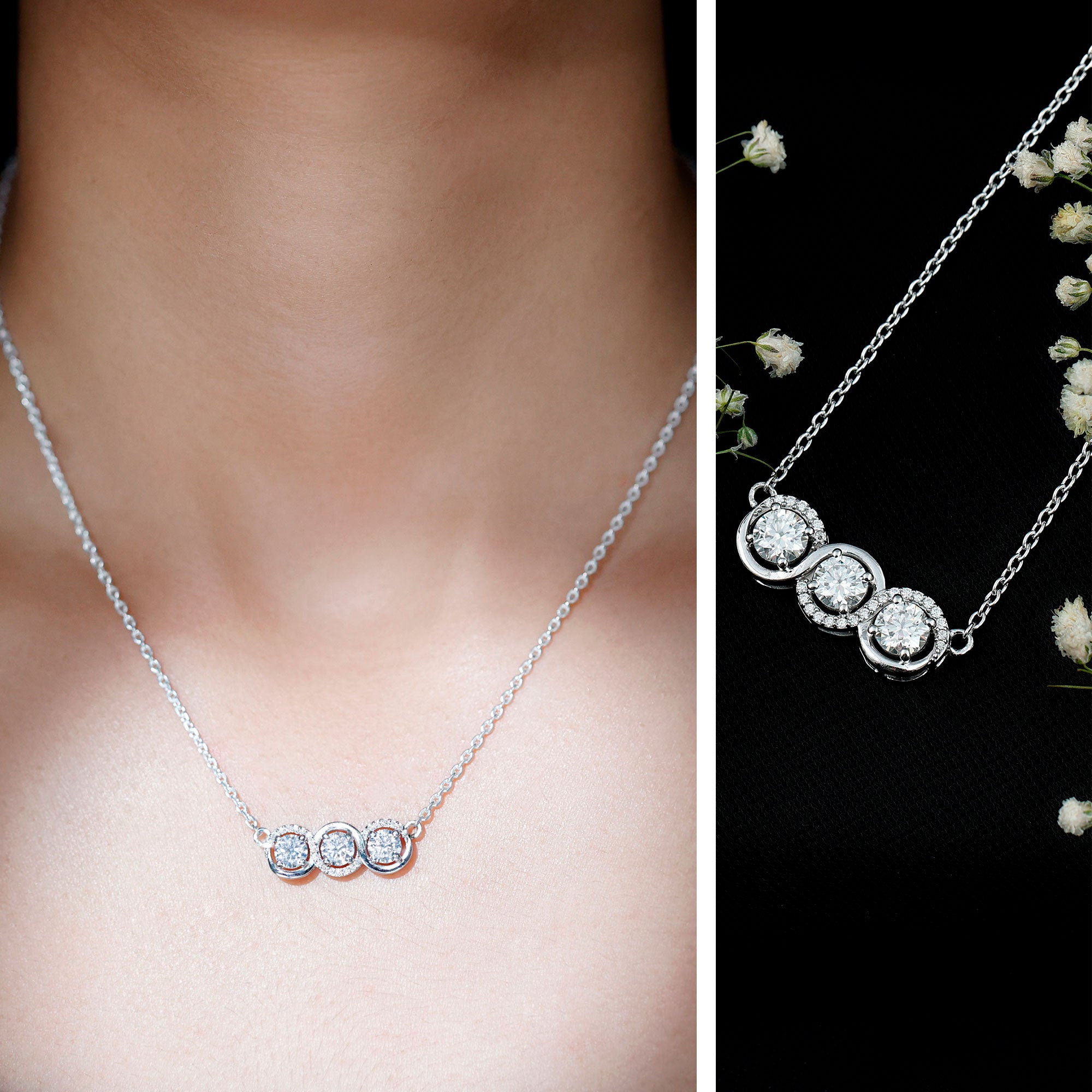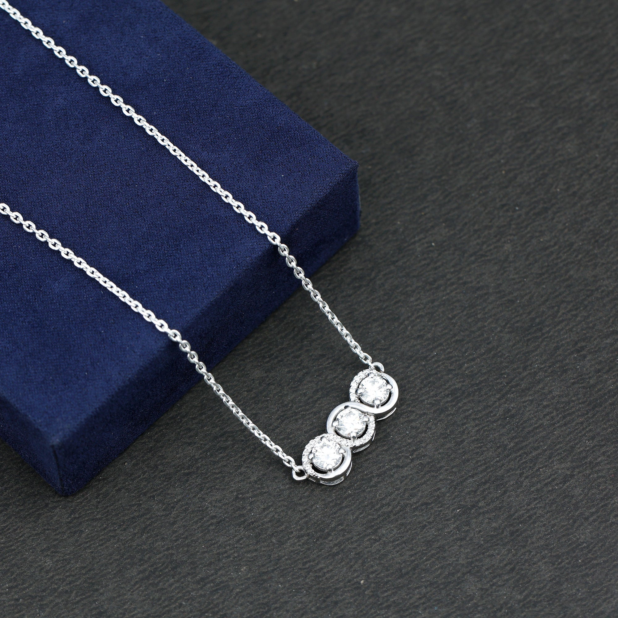 Embrace your Neckline with this Moissanite pendant Necklace. This 3 Stone pendant is handcrafted with 14K White Gold Plated Silver featuring Round Shape Moissanite secured in Prong Setting. The moissanite stones are partially decorated with petite stones. This Horizontal Necklace beholds the classic shine of D-VS1 quality Moissanite hanging from a cable chain, through which you can even adjust the length and add a comfortable wearing for the whole time. You can adorn it all alone for a minimalist look or can stack it up with another layering necklace for a statement or creative look. This Three Stone Necklace will be shipped to you in a signature velvet pouch for storage.